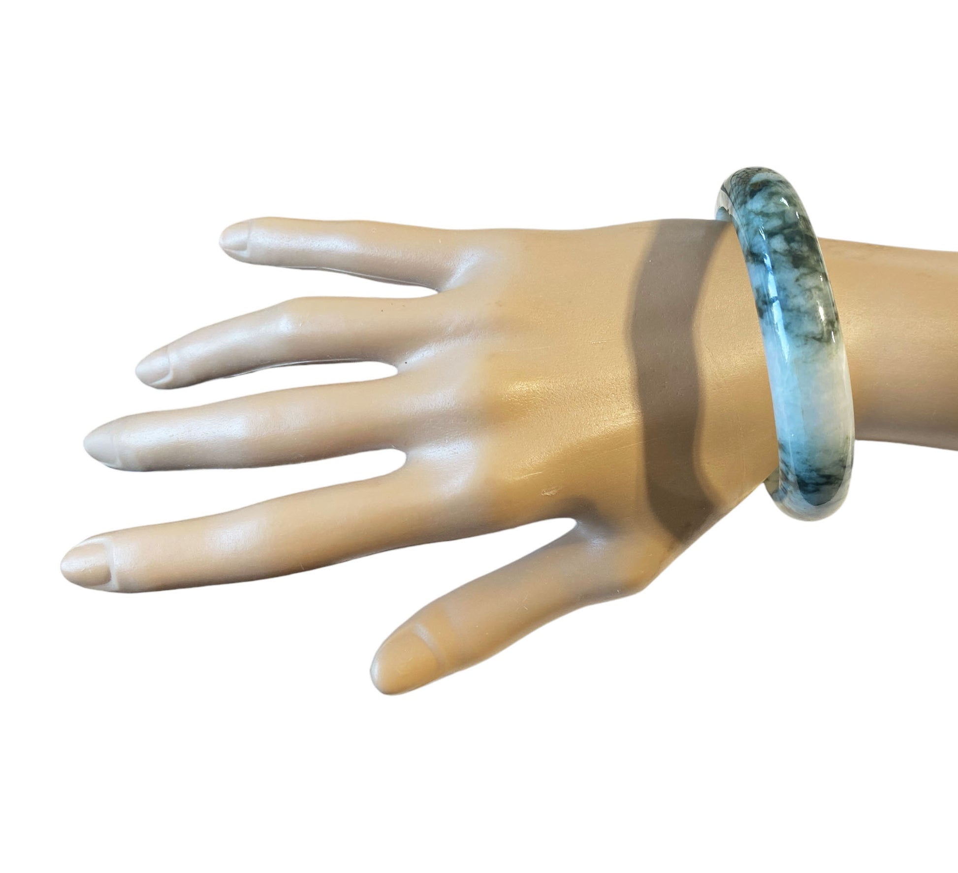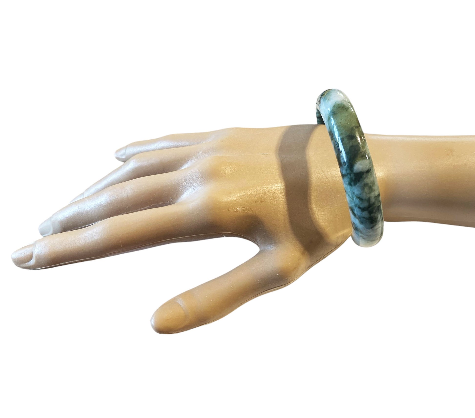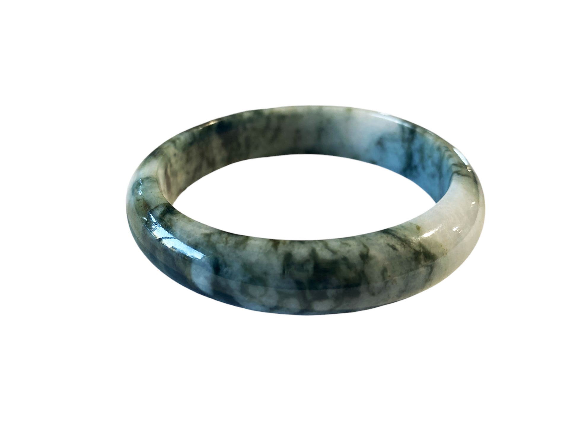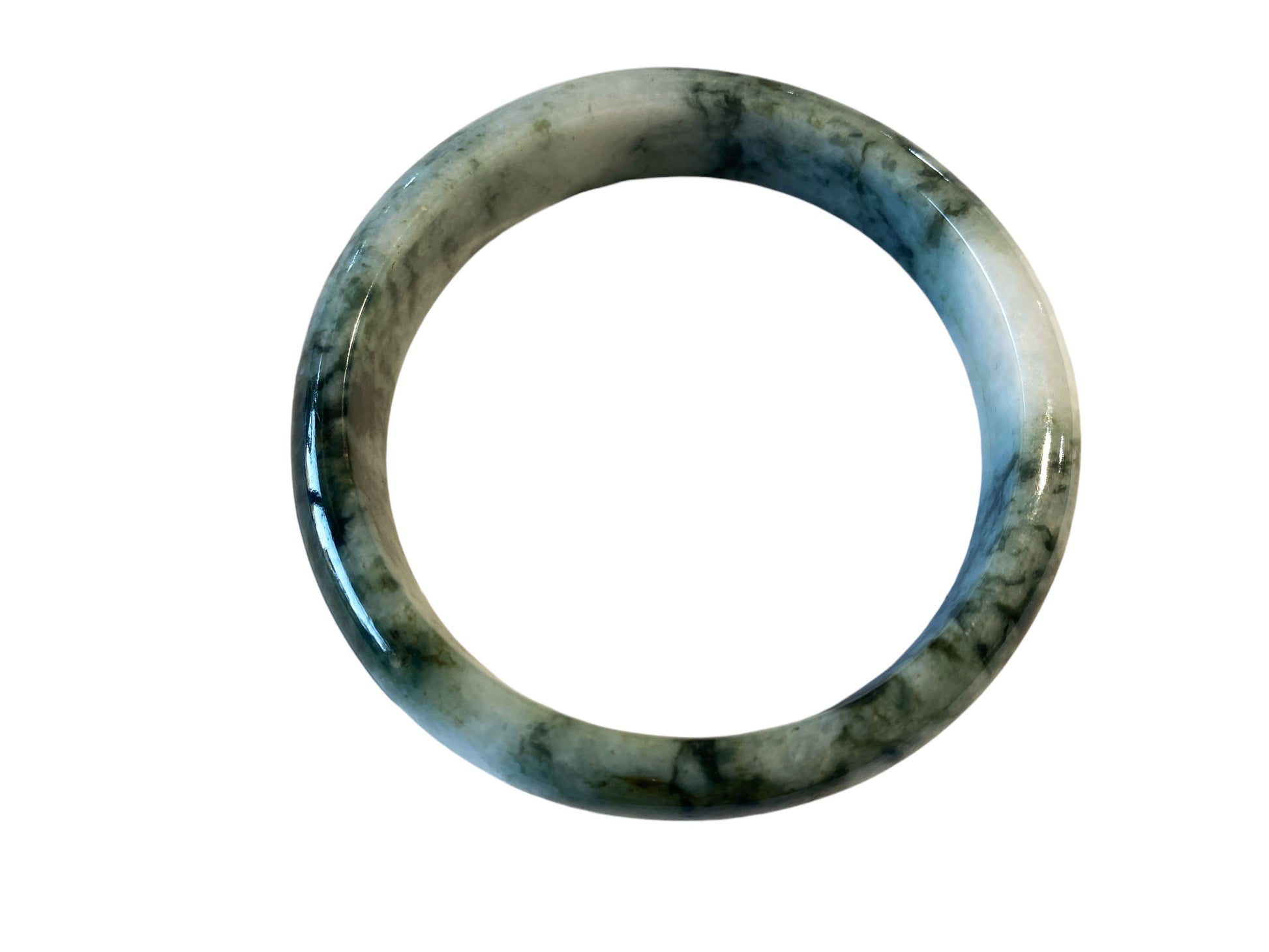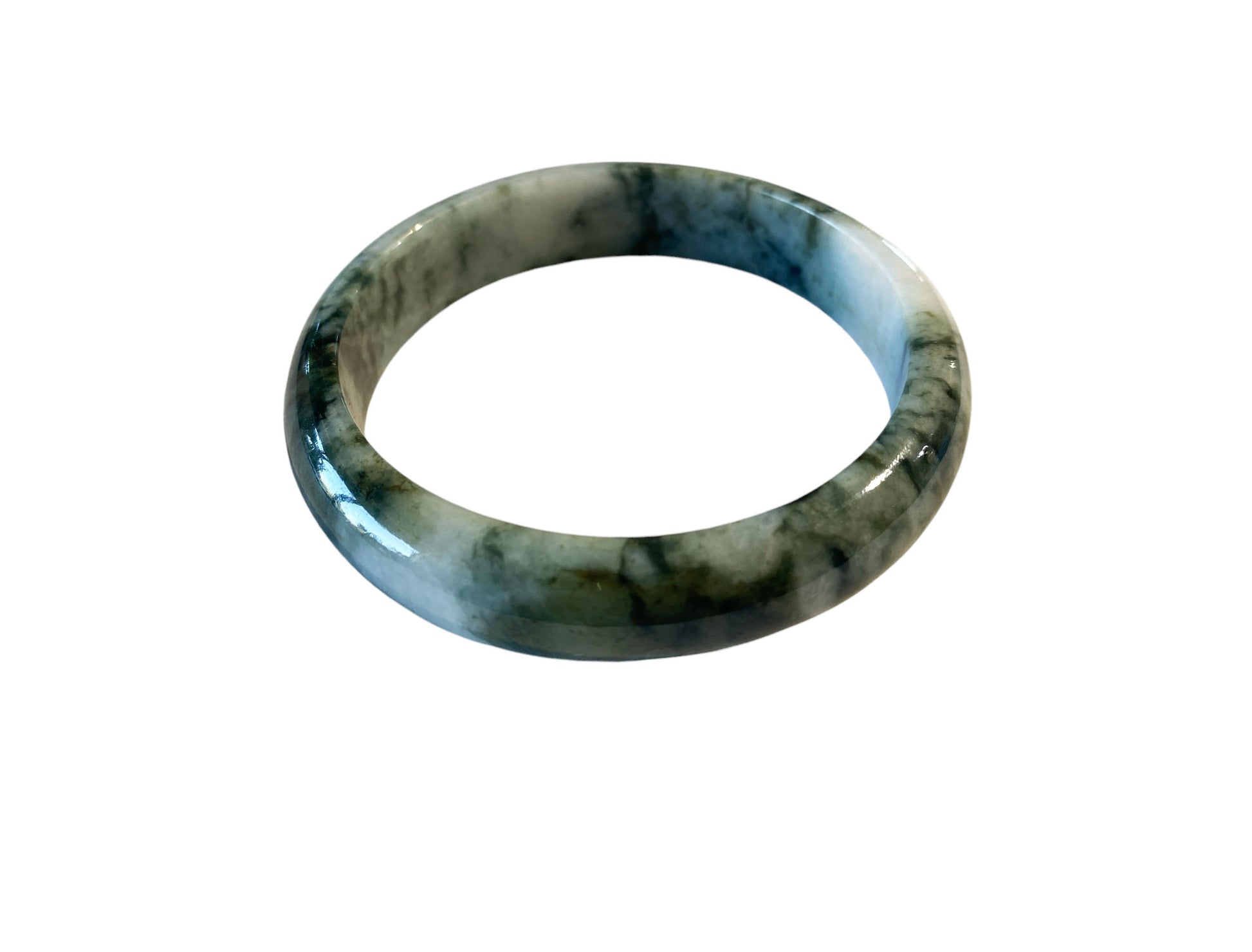 Hand carved with natural Mottled gray and green jadeite jade, this Bangle Bracelet exudes a sense of sophistication. Its 3.25" diameter and 0.50" height make it the perfect statement piece for any occasion. With no indication of impregnation, this bracelet is truly one-of-a-kind. The inside diameter of 2.5" ensures a comfortable fit for all.