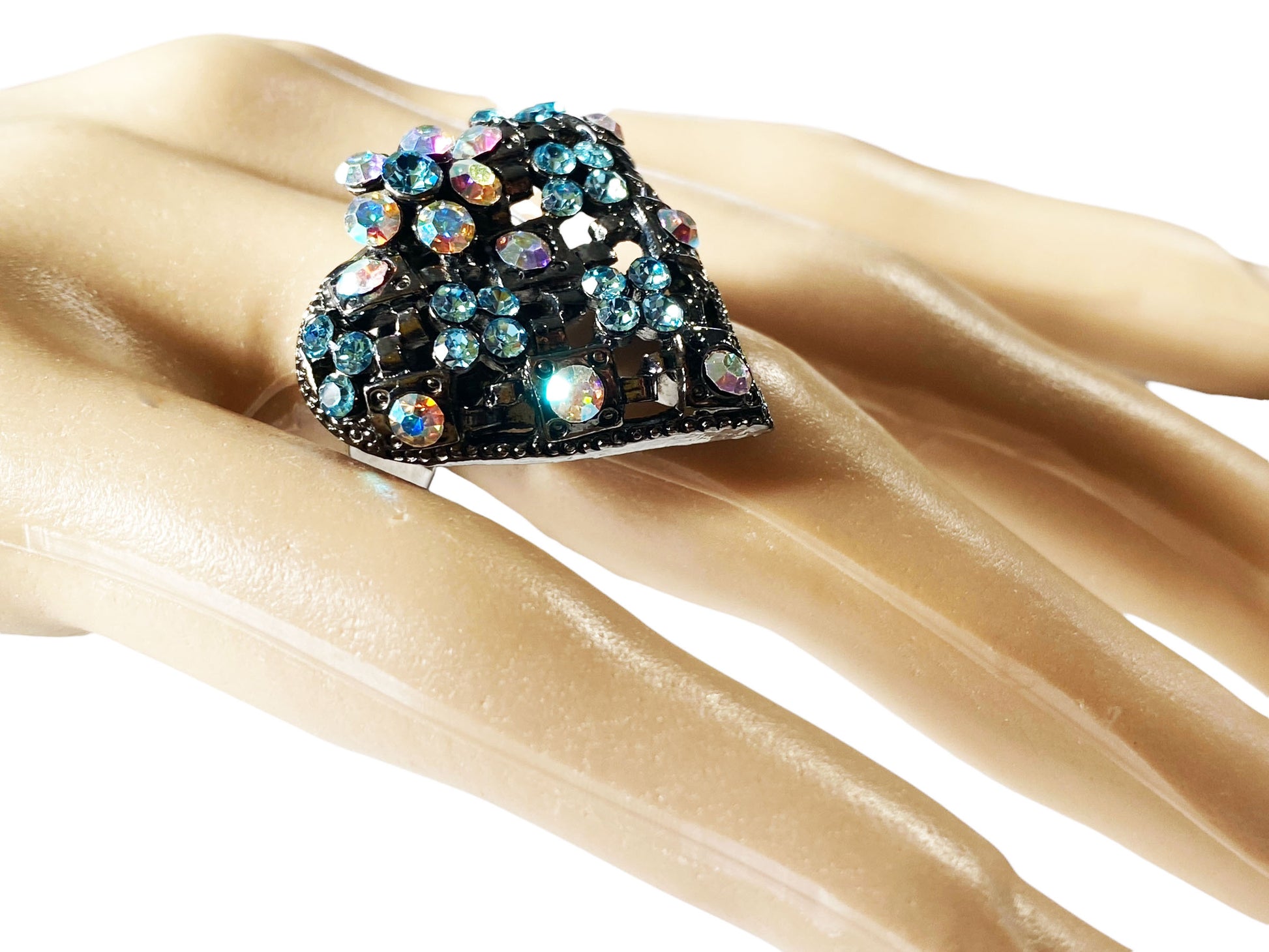 #6273 Vtg Resizable Heart Shape Ring w/Rhinestone Crystal vibrant Aurora Borealis stones size 7.