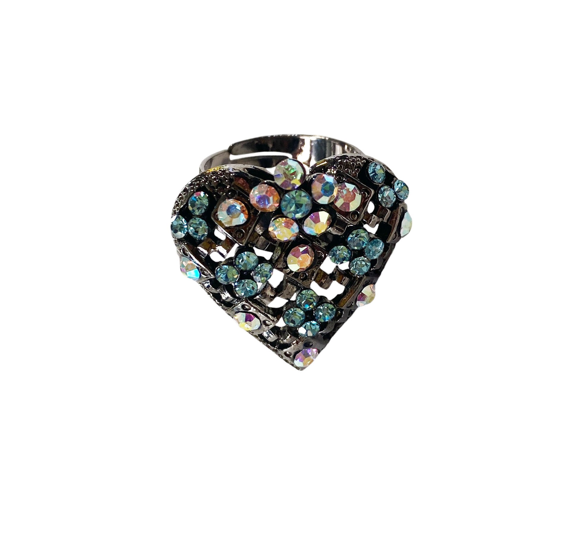 Superb Vintage Resizable Dark Silver Heart Shape Ring w/Sparkling Rhinestone Crystal Aurora Borealis Stones Size 7 - Classic and Timeless.