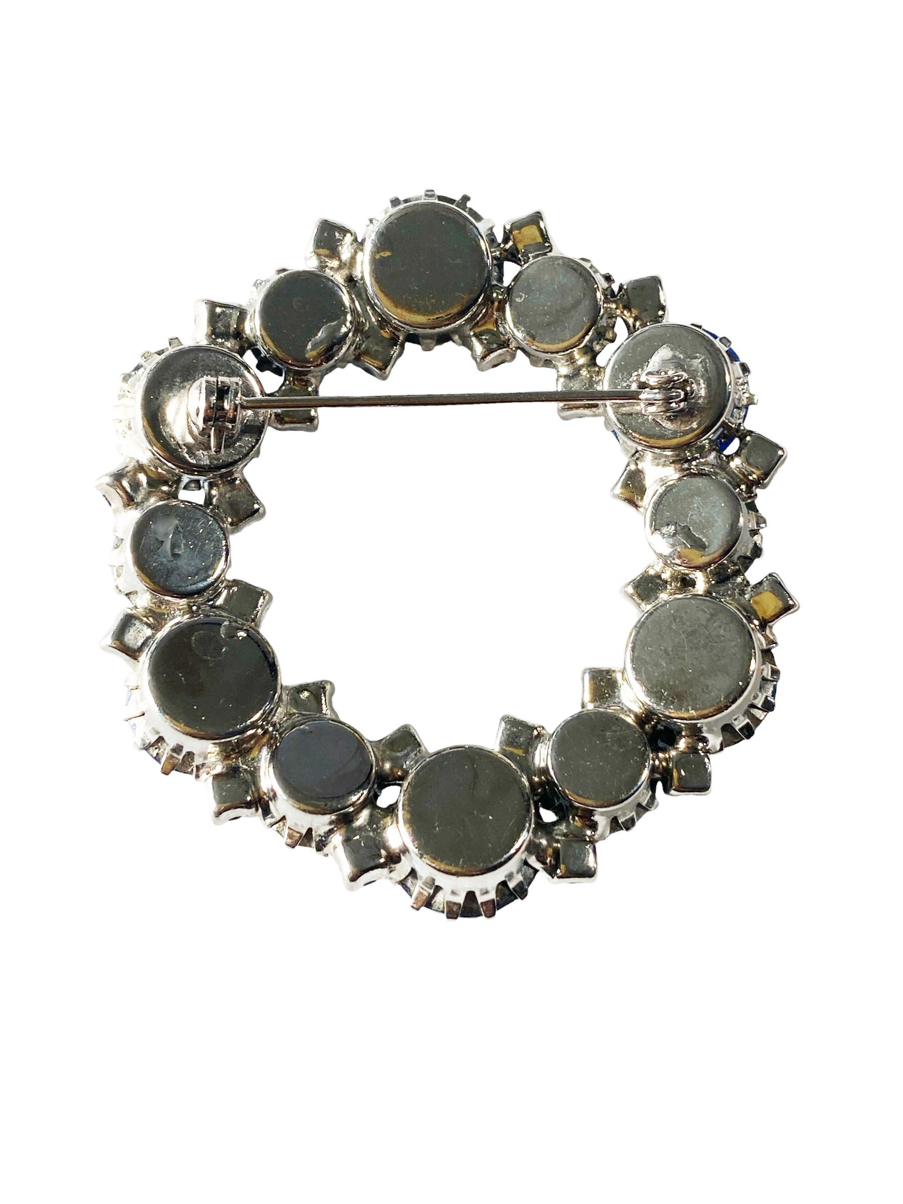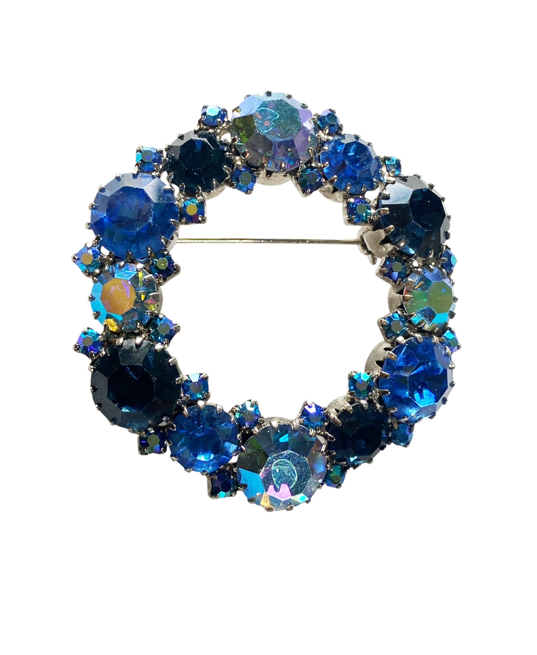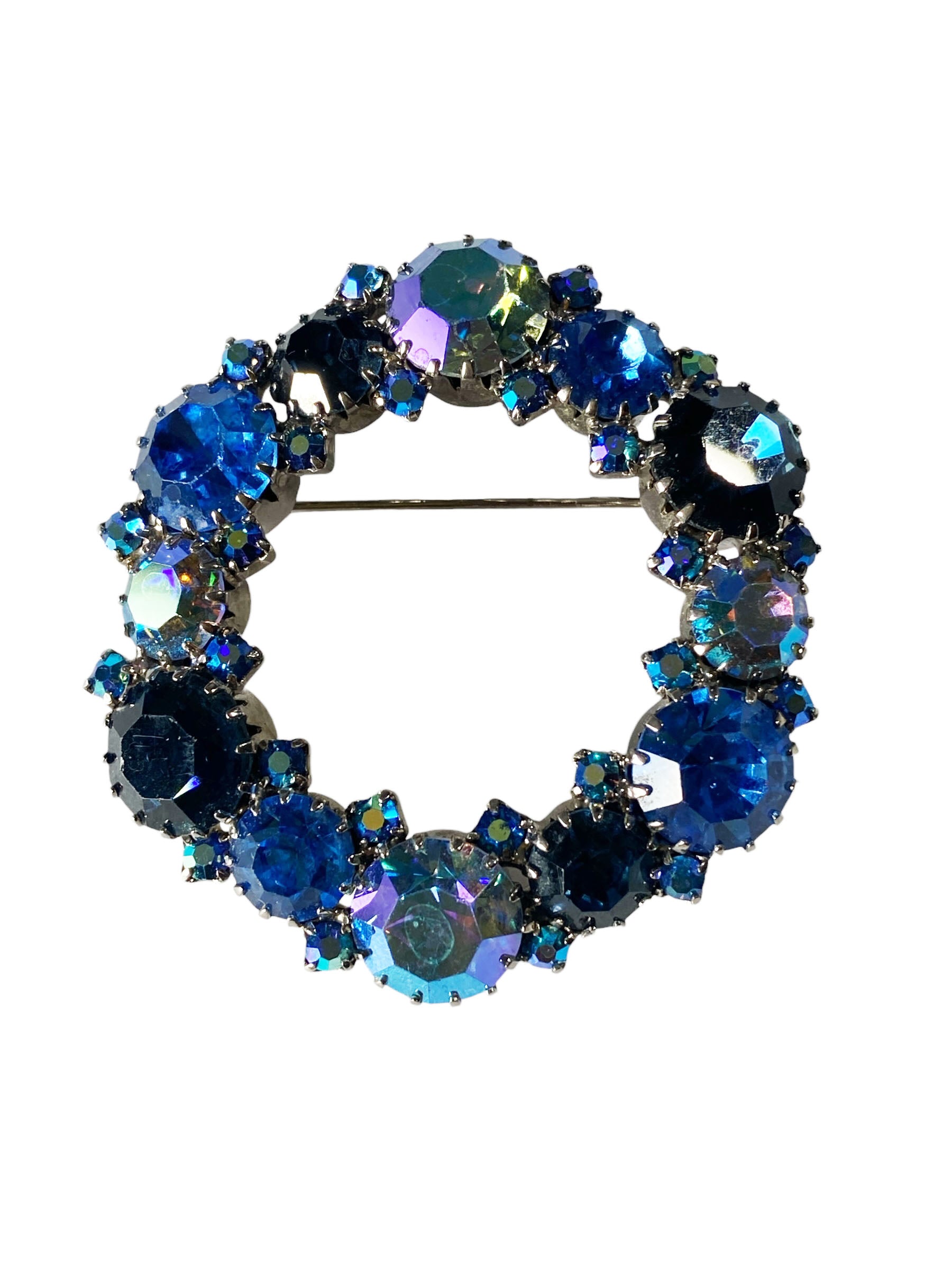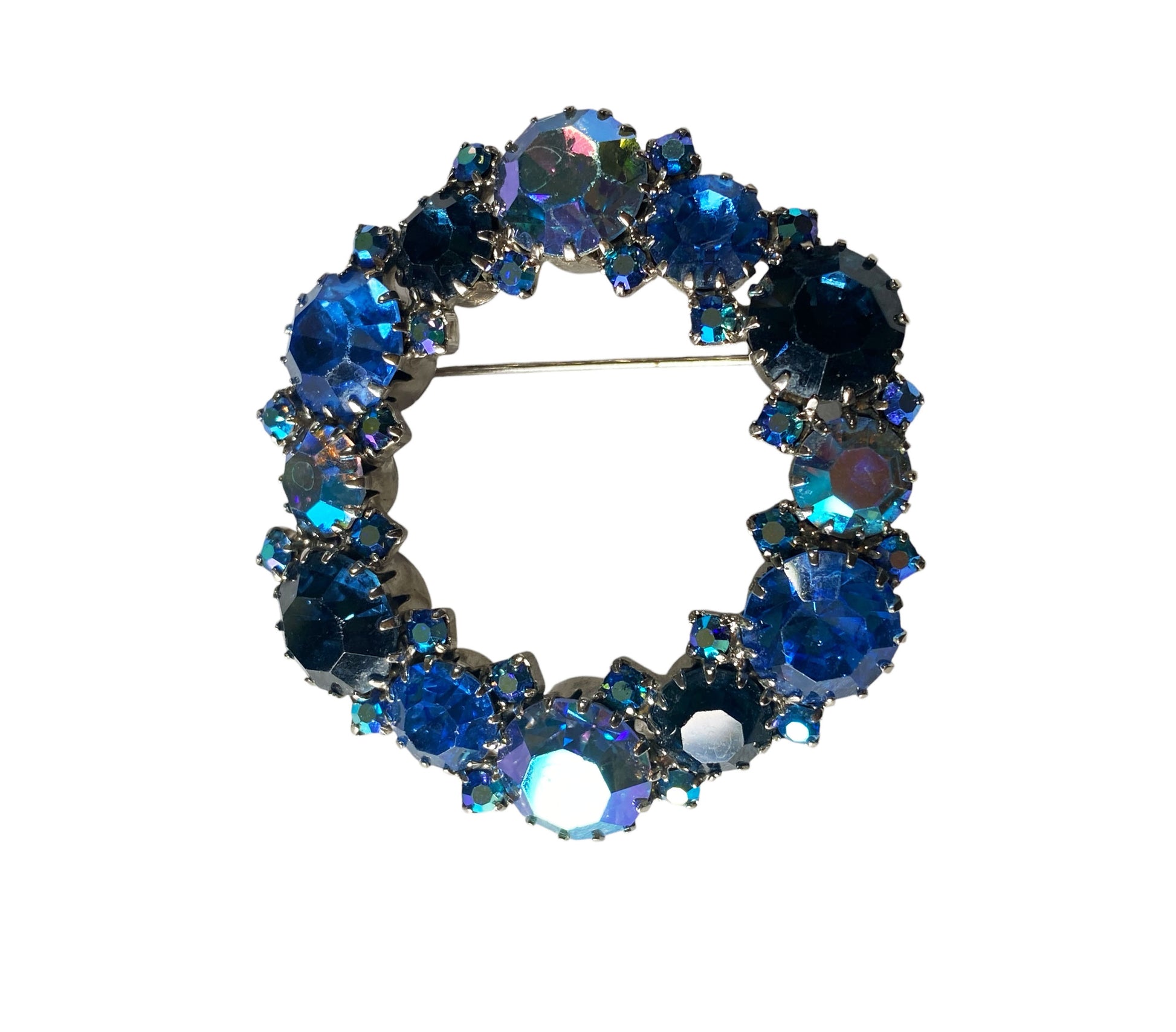 This elegant and classic Vintage Rhinestone Glass Brooch features a 2-inch diameter and a 0.25-inch depth, adorned with vibrant Aurora Borealis crystals in a beautiful wreath design.