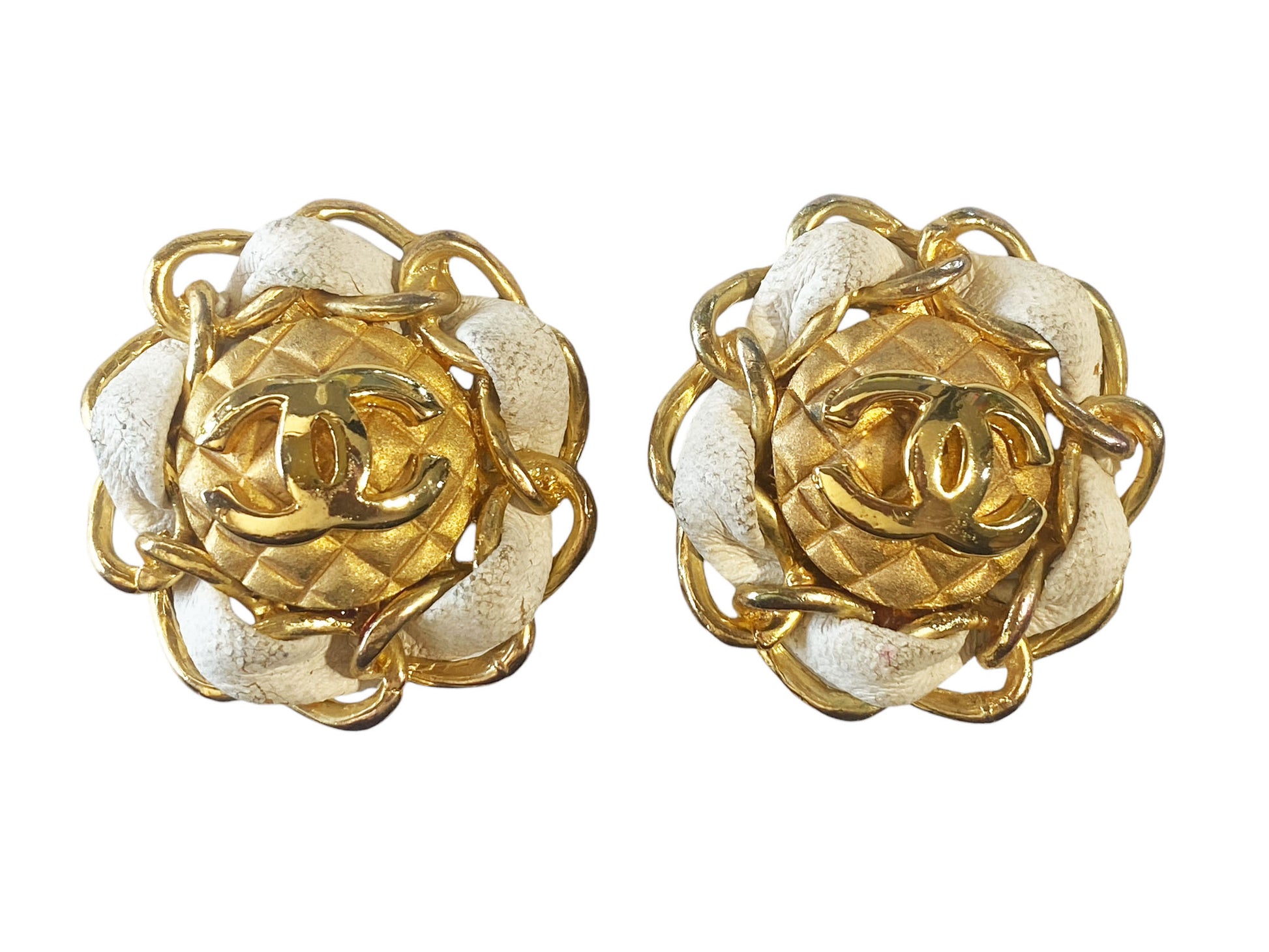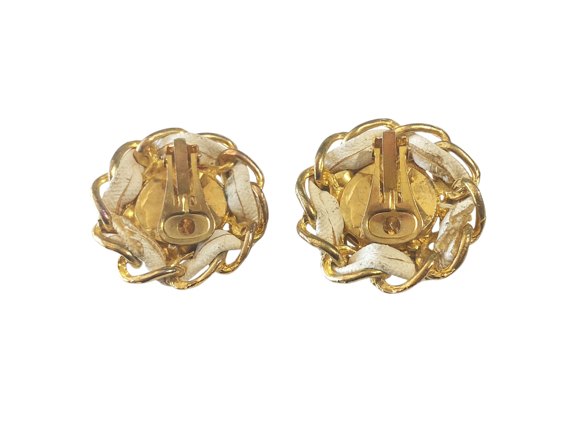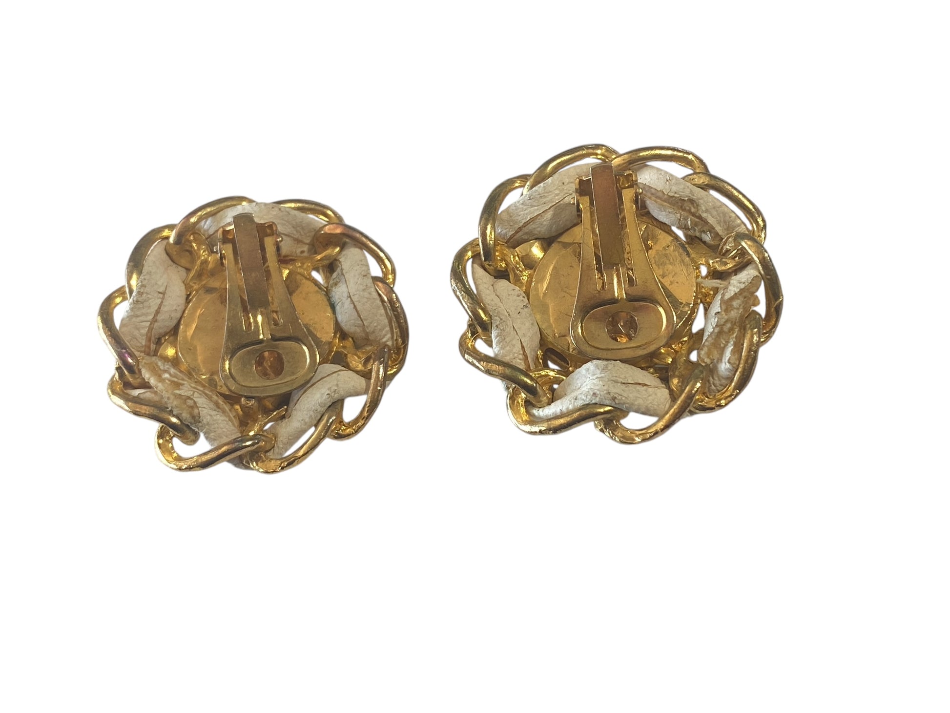 Vintage Clip-On Earrings. Inspired by iconic Chanel designs, these earrings feature white leather and gold accents, measuring 1.5 inches in diameter and 0.50 inches in depth. Perfect for any occasion, these earrings are sure to elevate any outfit with their timeless elegance.