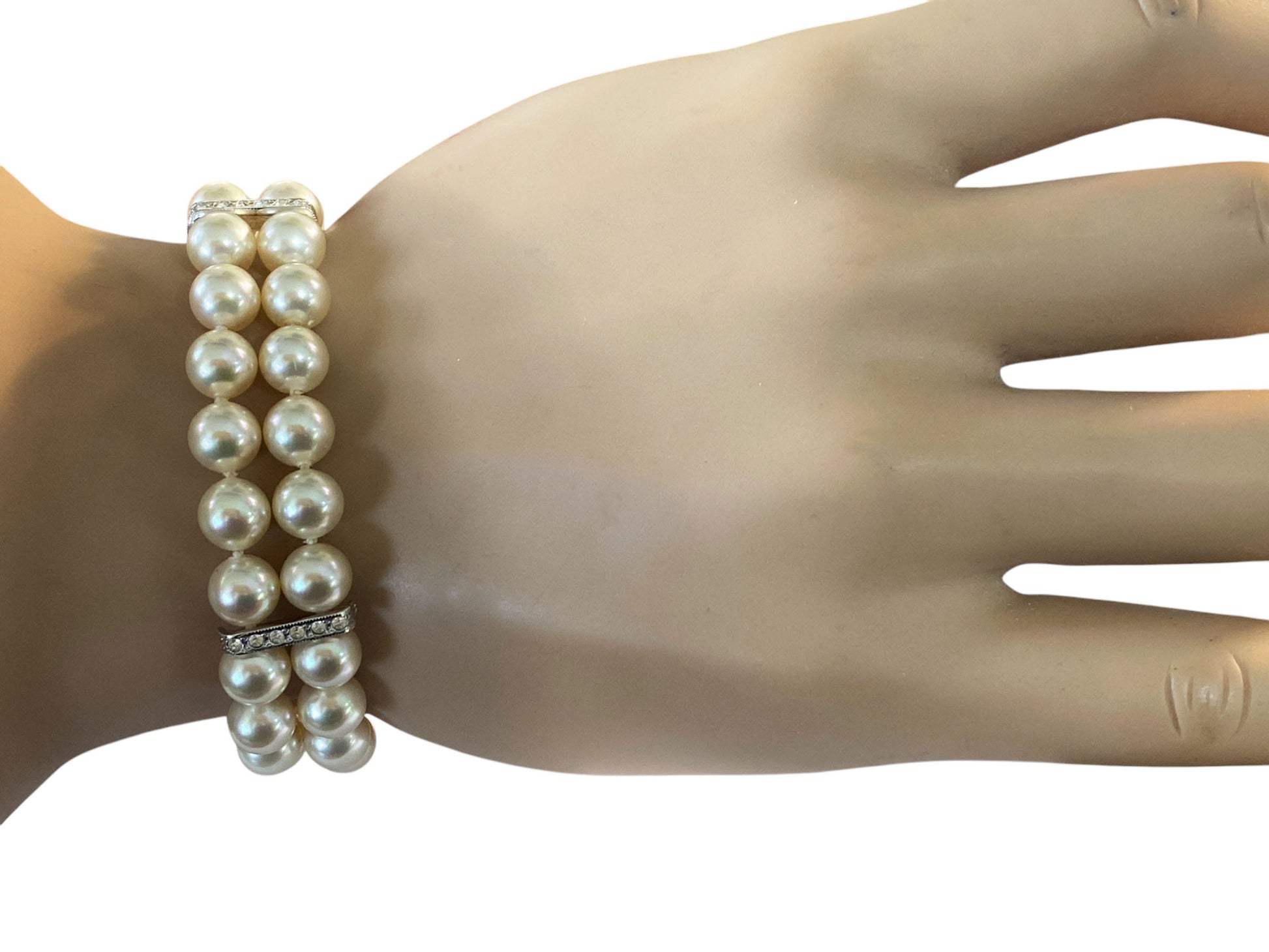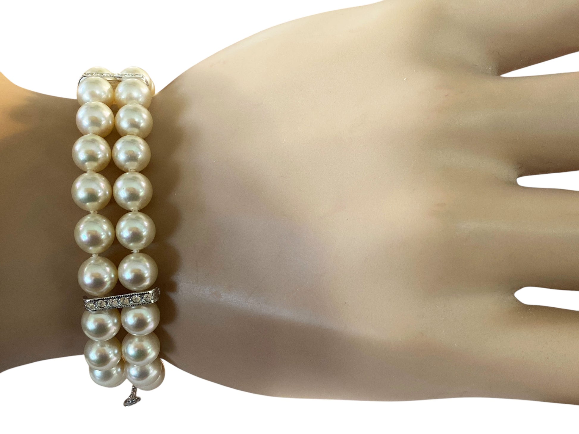 #6295 Vintage Czech Two Strand Pearl Bracelet With Faux silver tone Diamond Clasp 8"
