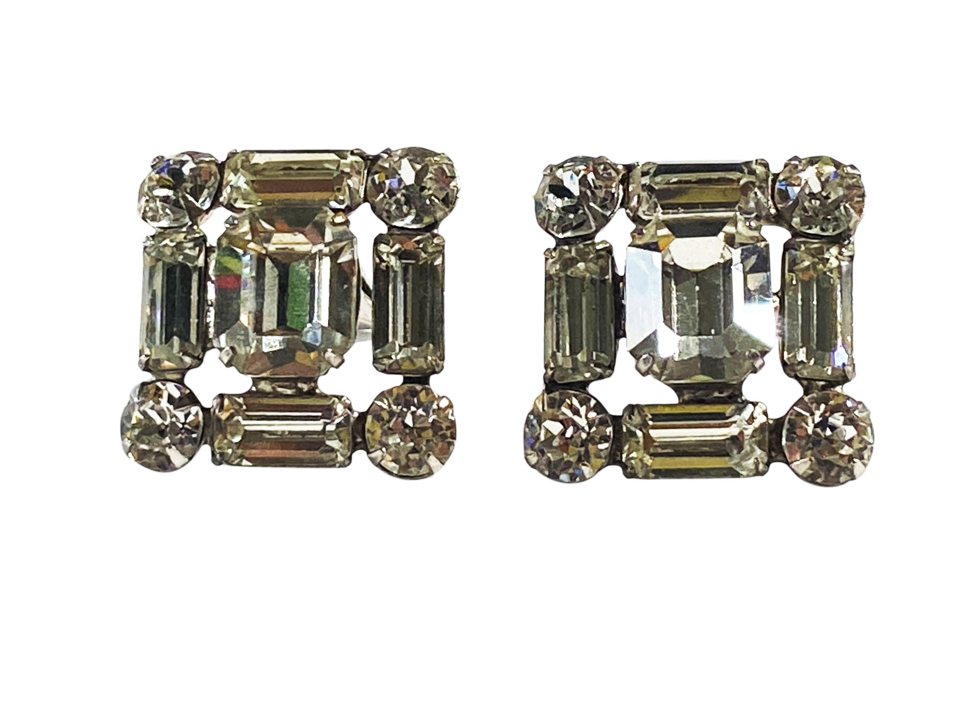 Elegant White gold tone clip on earrings feature a timeless design of elegant faux baguette and round square diamonds. Measuring 1" in width by 1" in height and 0.75" in depth, they exude a vintage charm and are numbered 1967065 .