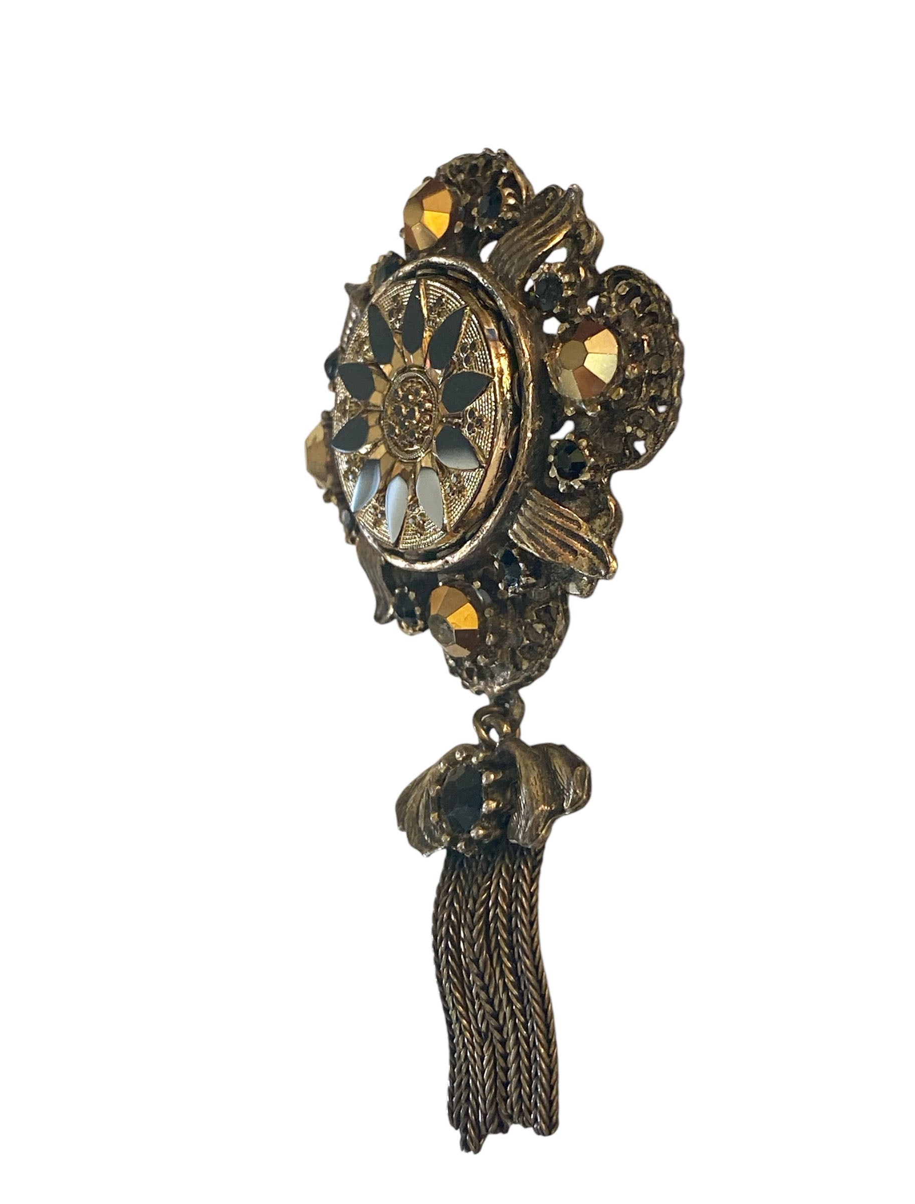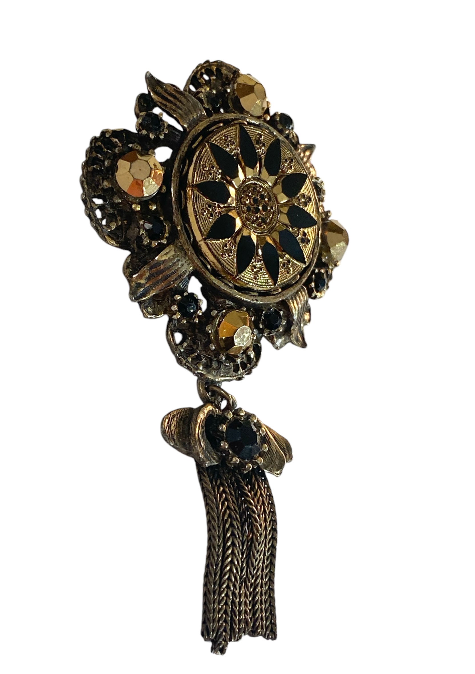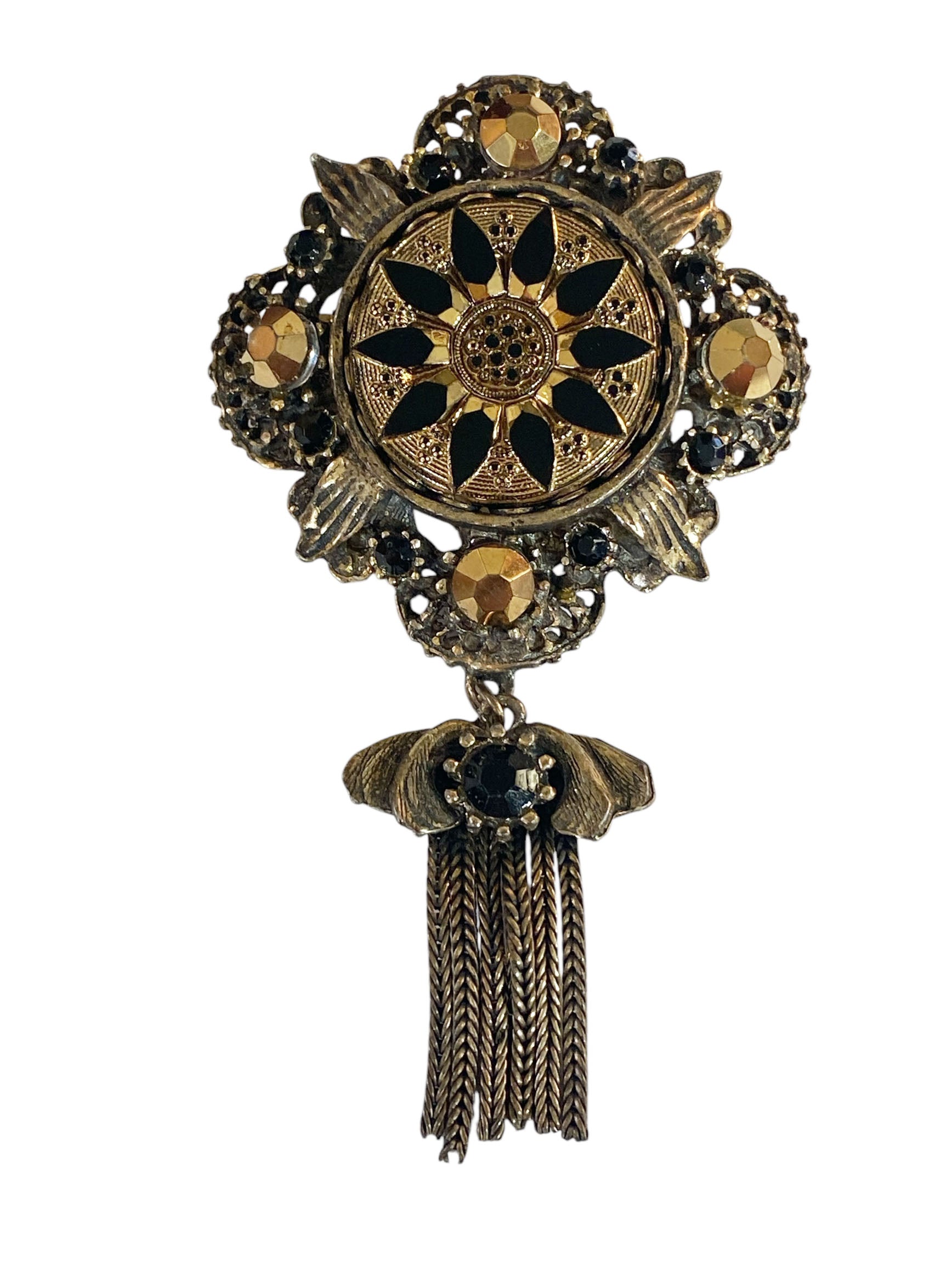 This vintage gold-toned pendant/brooch is a unique and finely crafted piece, possibly from Florenza. Handmade with a beautiful combination of variegated small elements, including large and small black and shiny brown enamel faux diamonds and beads, it measures 3" in height, 1.75" in width, and 1" in depth. With a nice luster and tassels, this piece is truly a one-of-a-kind addition to any collection.