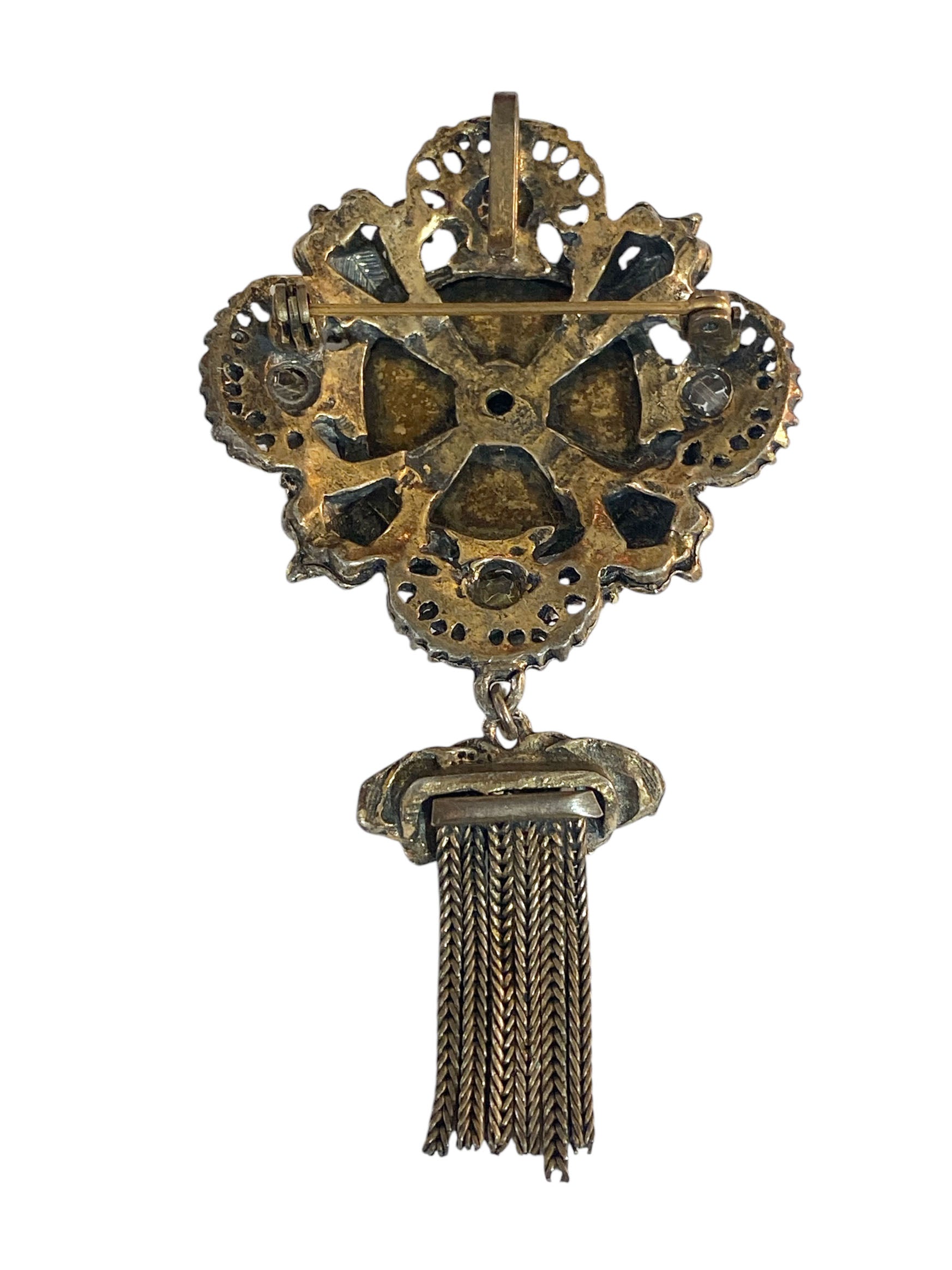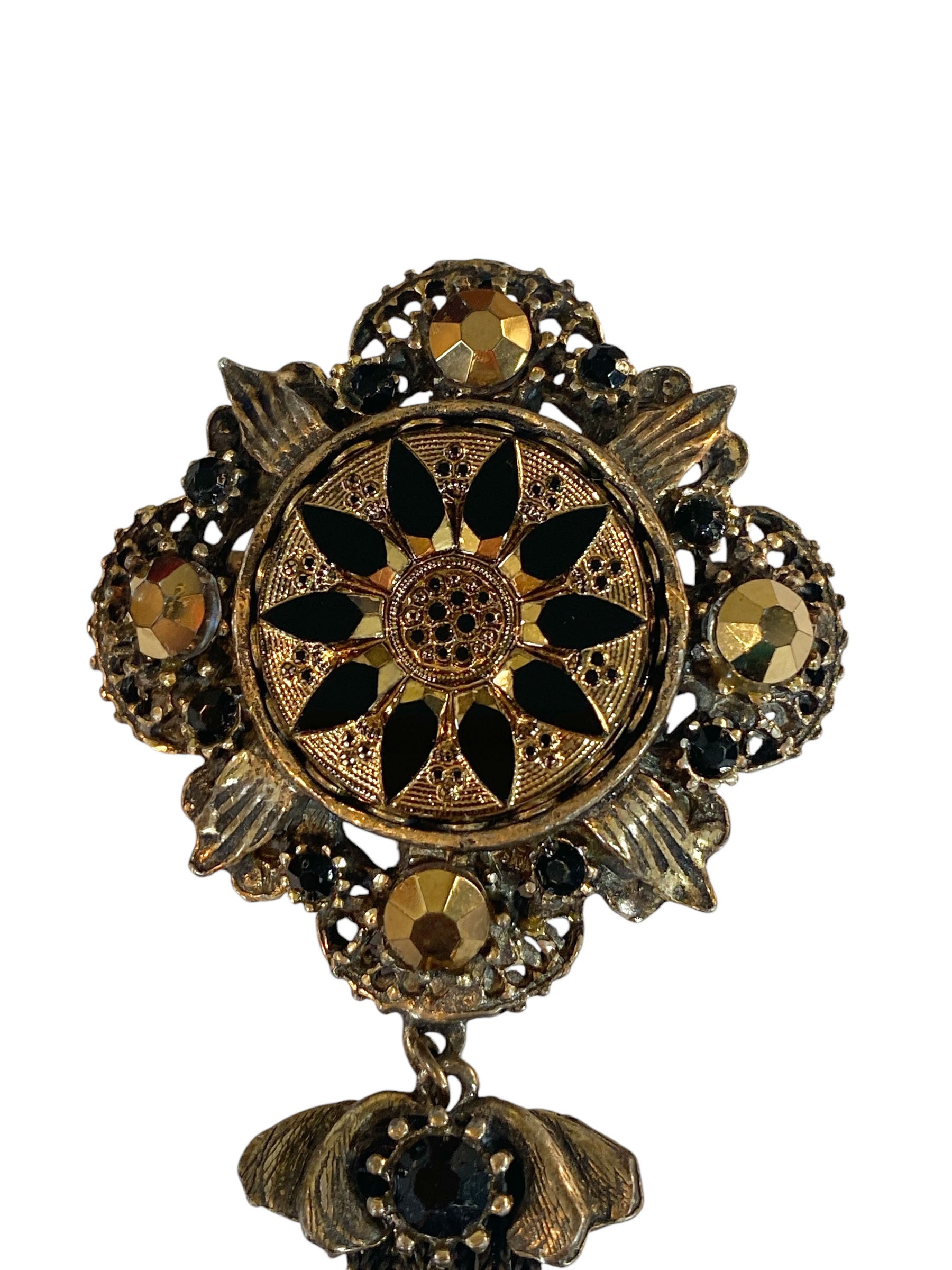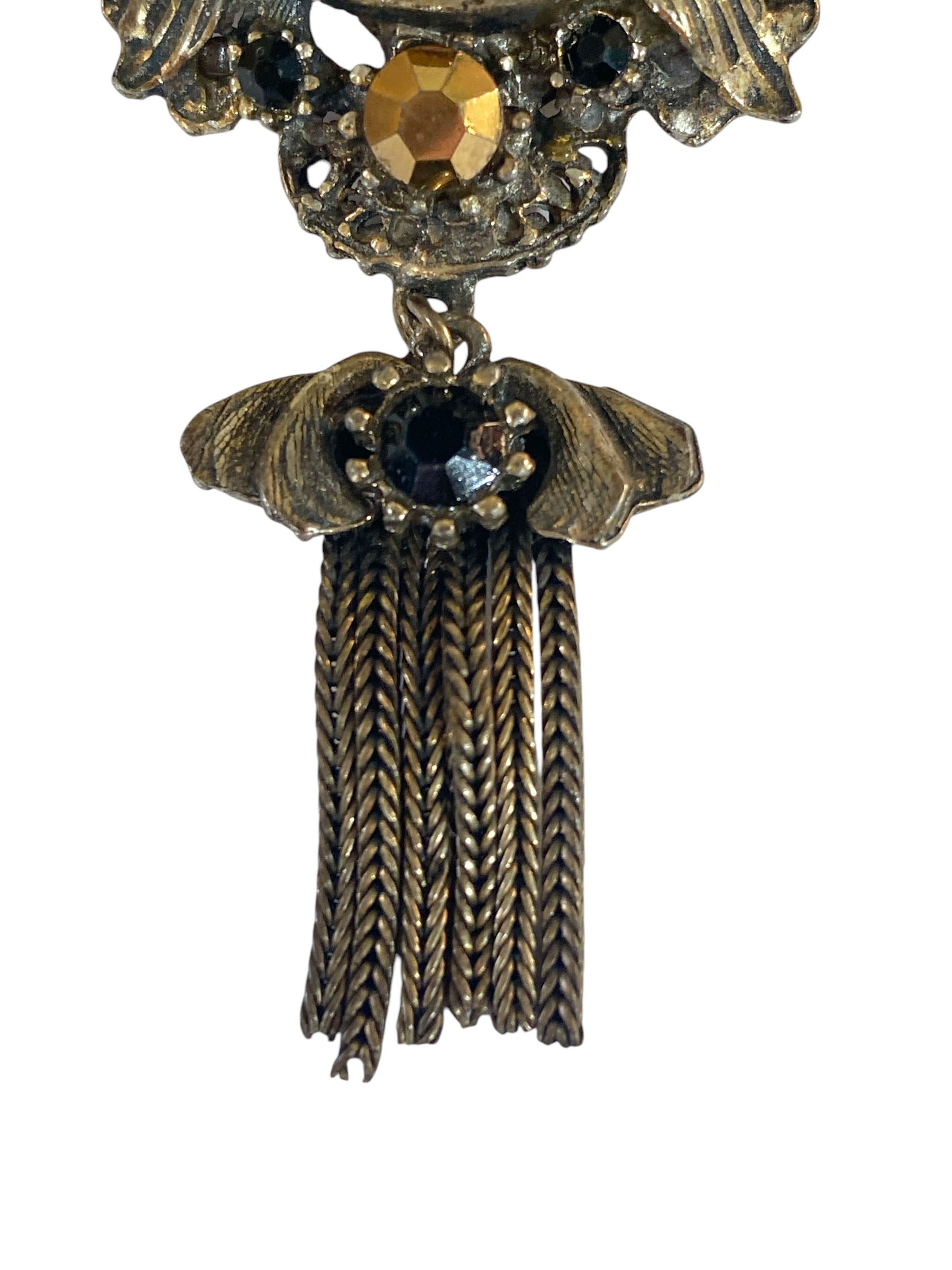 This vintage gold-toned pendant/brooch is a unique and finely crafted piece, possibly from Florenza. Handmade with a beautiful combination of variegated small elements, including large and small black and shiny brown enamel faux diamonds and beads, it measures 3" in height, 1.75" in width, and 1" in depth. With a nice luster and tassels, this piece is truly a one-of-a-kind addition to any collection.