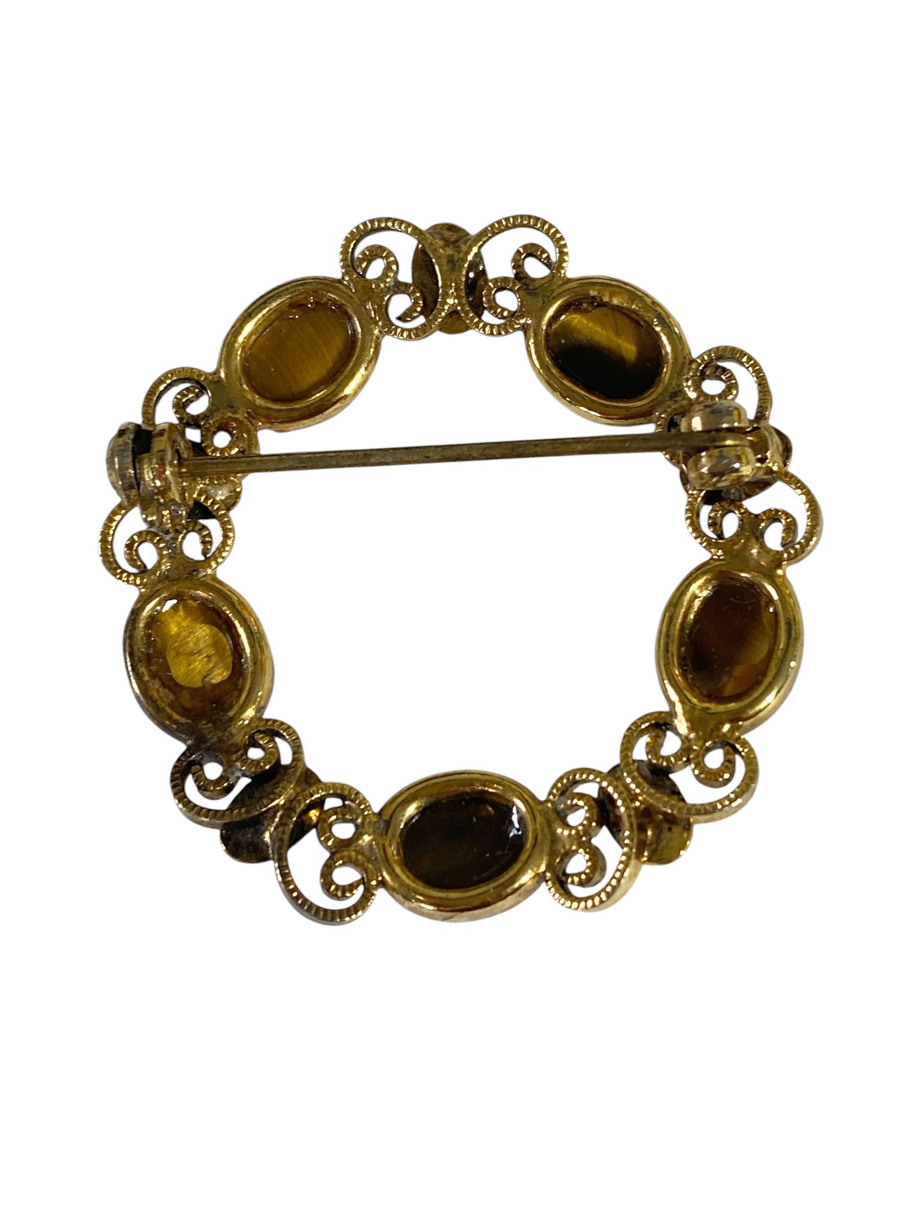 #6301 Tigers Eye Style Garland Wreath Gilt Pin Brooch 1.25" D