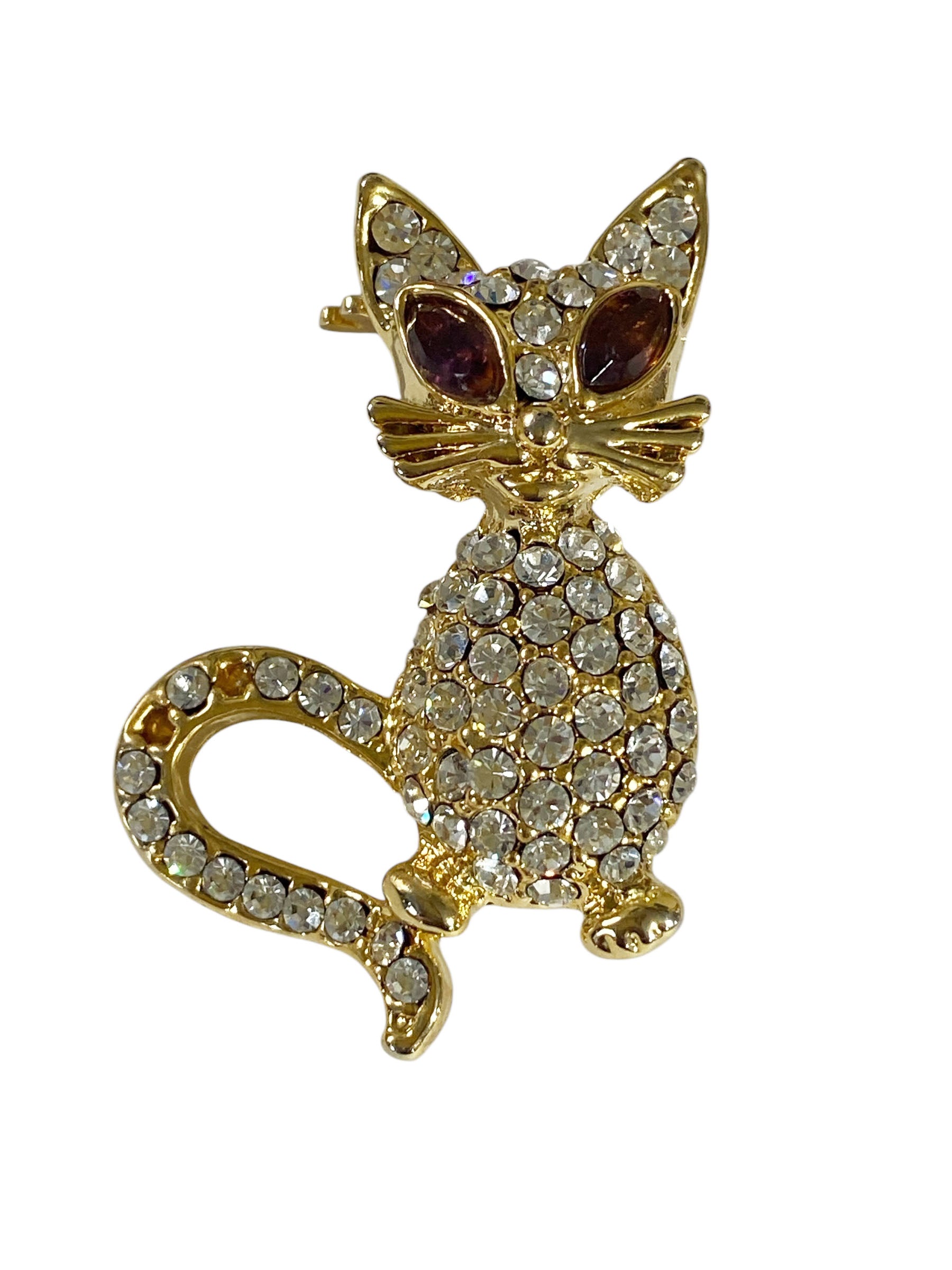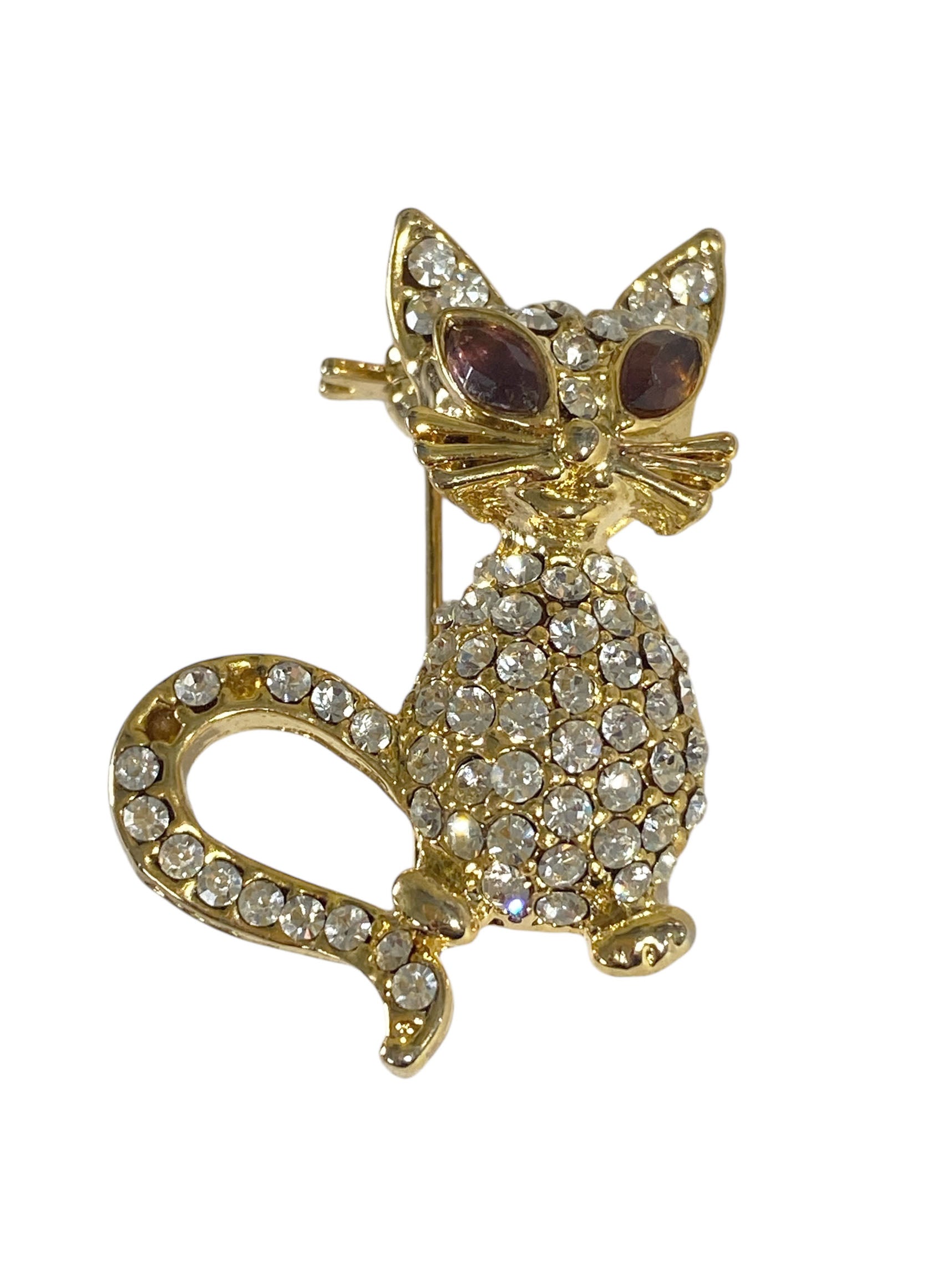 #6303 Vintage Pave clear Rhinestone Cat Brooch Gold Toned Costume Jewelry