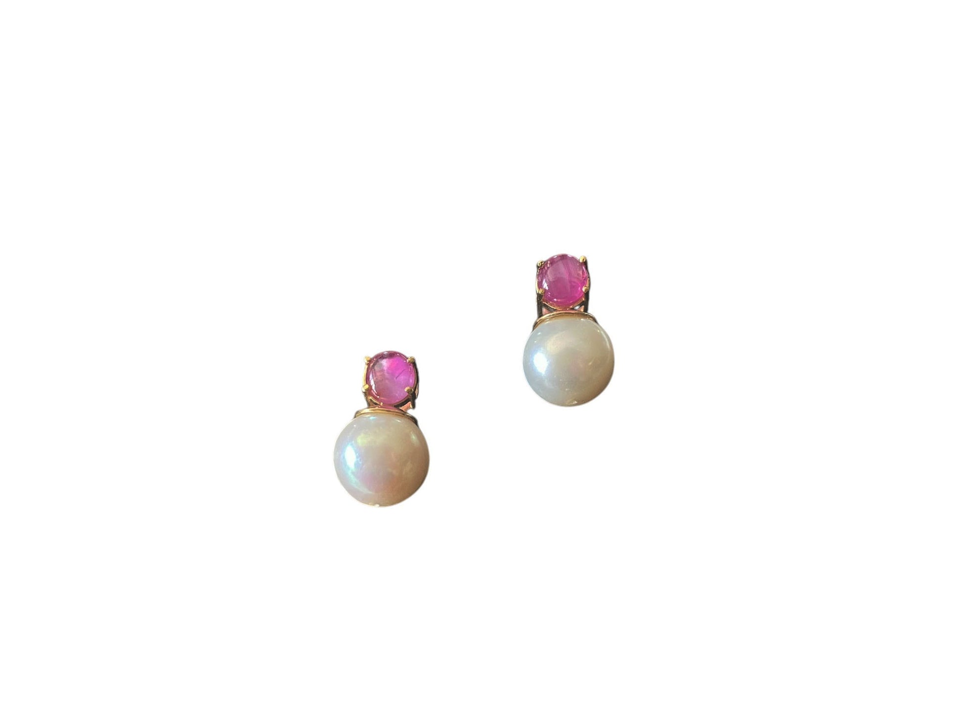 This 18k gold earring boasts a sophisticated round Rubies and a pearl measuring 0.50" H by 0.25" W by 0.750" D. A truly one-of-a-kind piece marked 18K