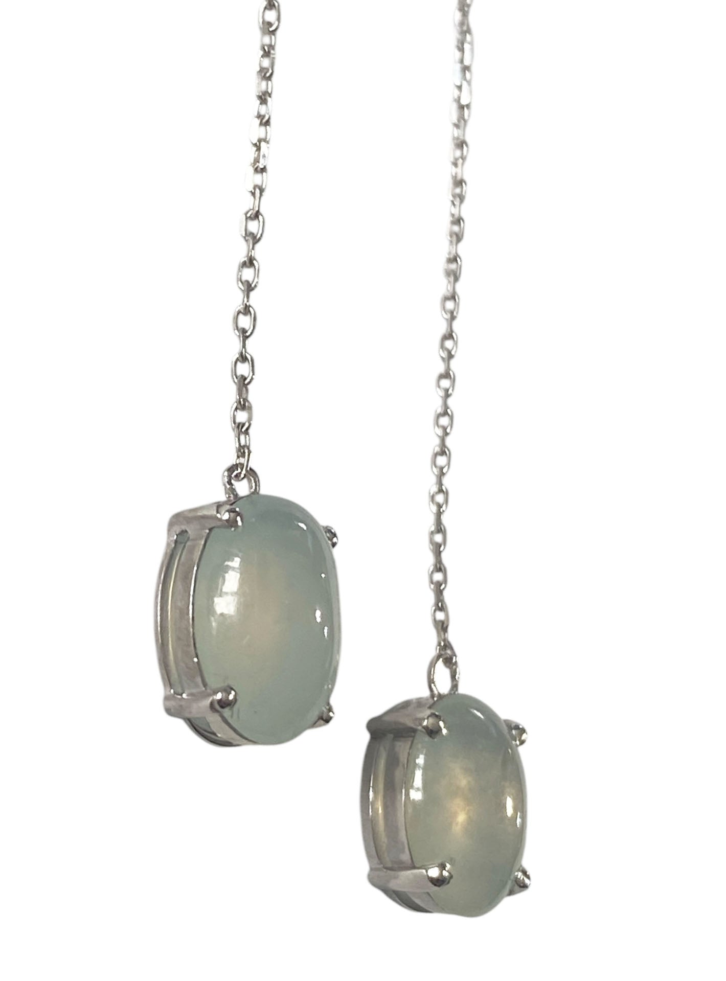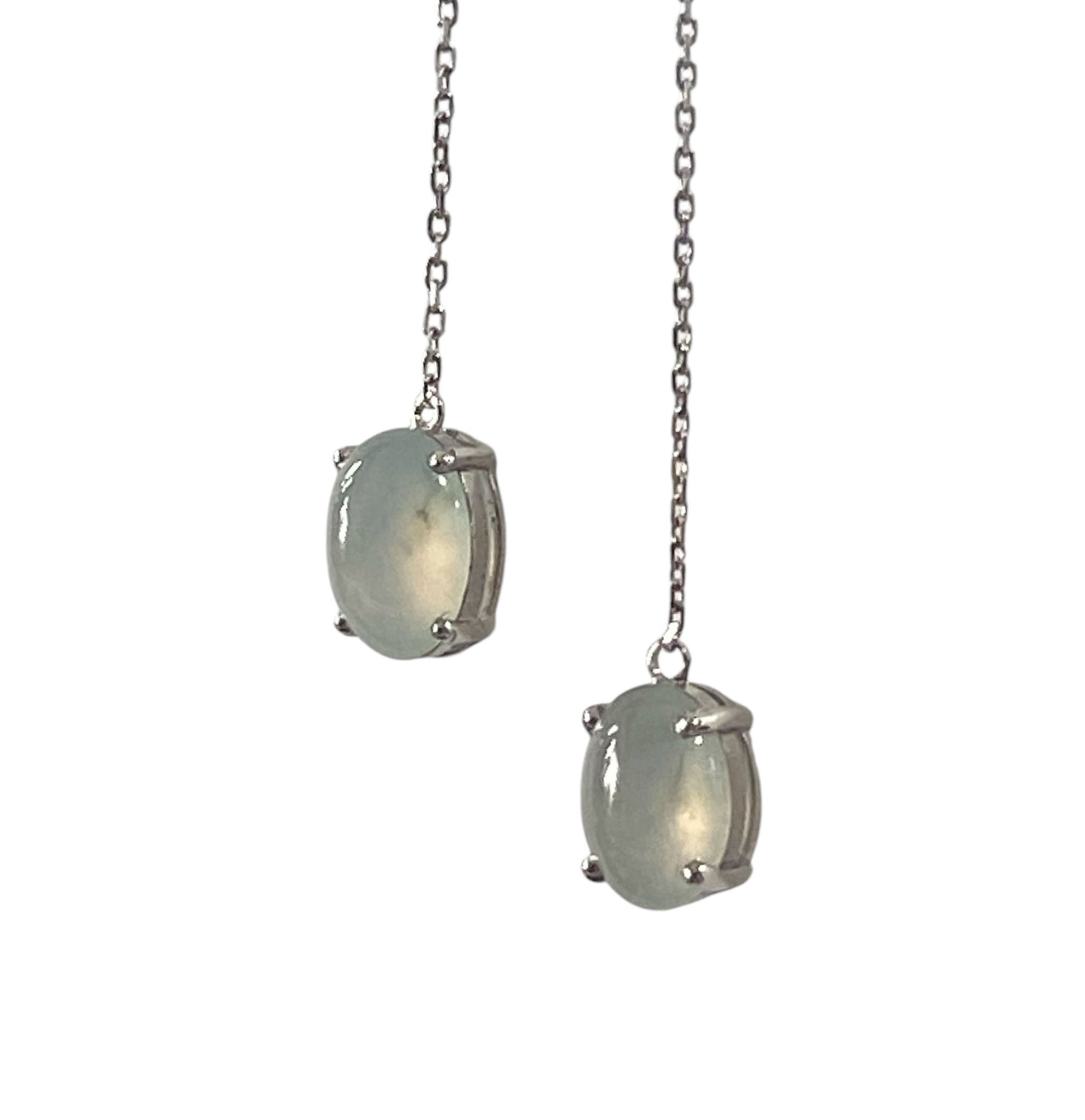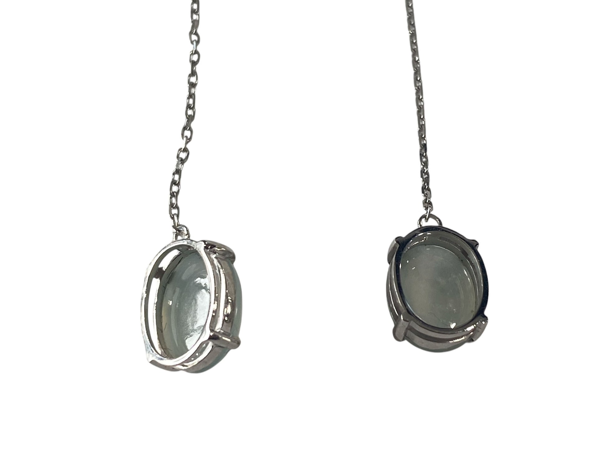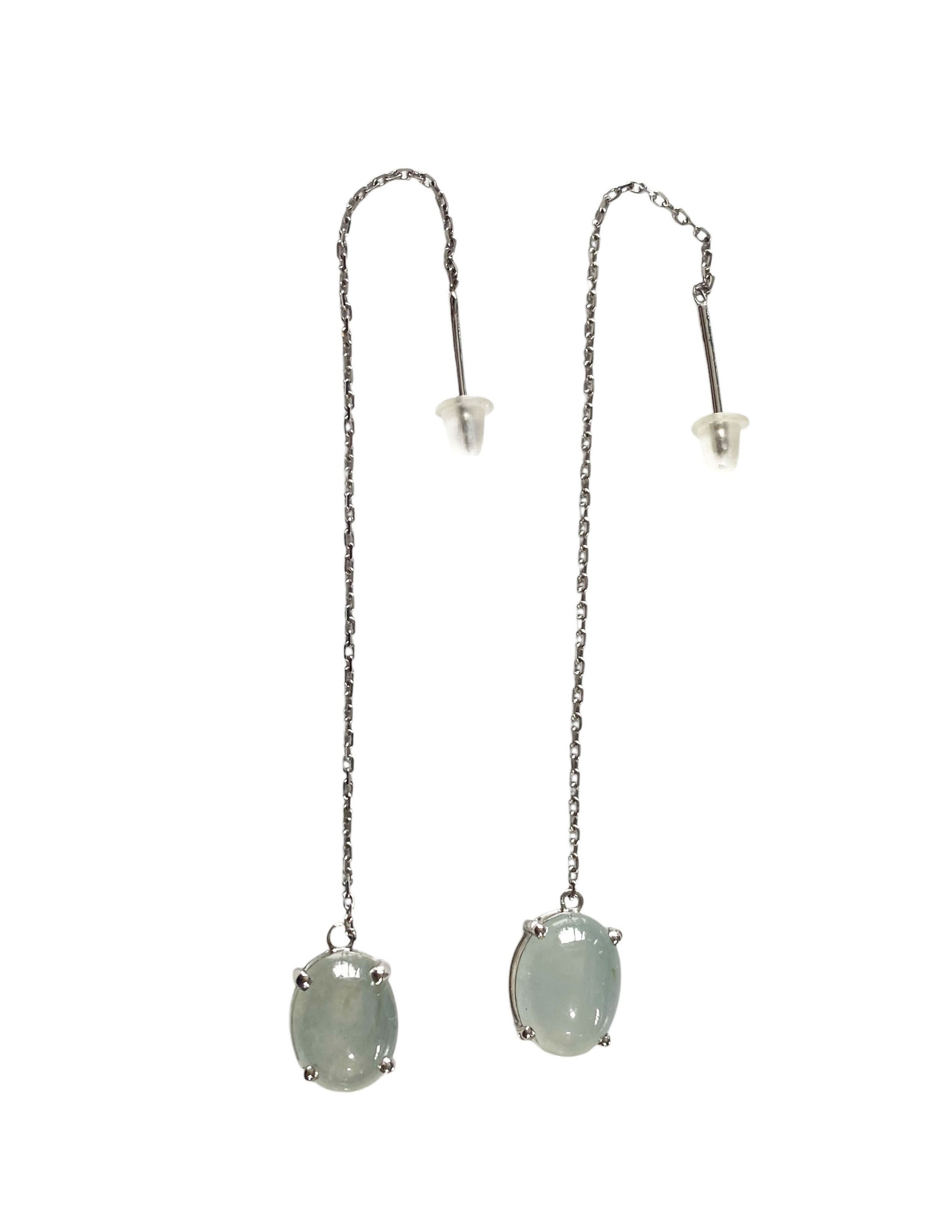Elegant 18K white gold earrings feature oval-shaped blue rice water jadeite jade, Measuring 3.25" in height and 0.25" in width, with a depth of 0.25", these ear stud earrings exude elegance and sophistication