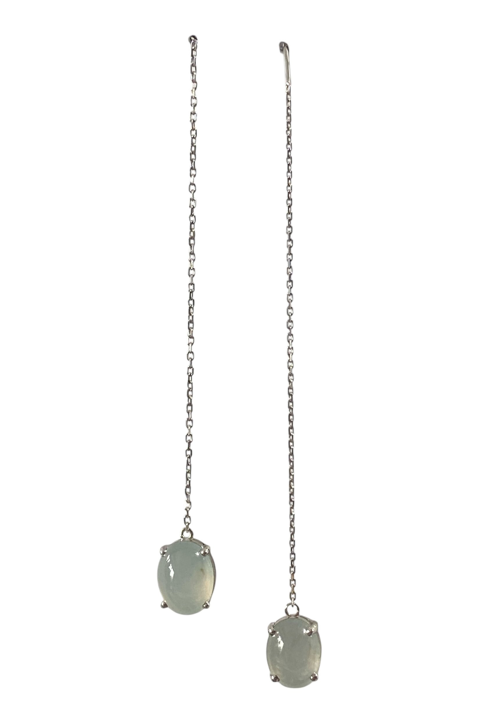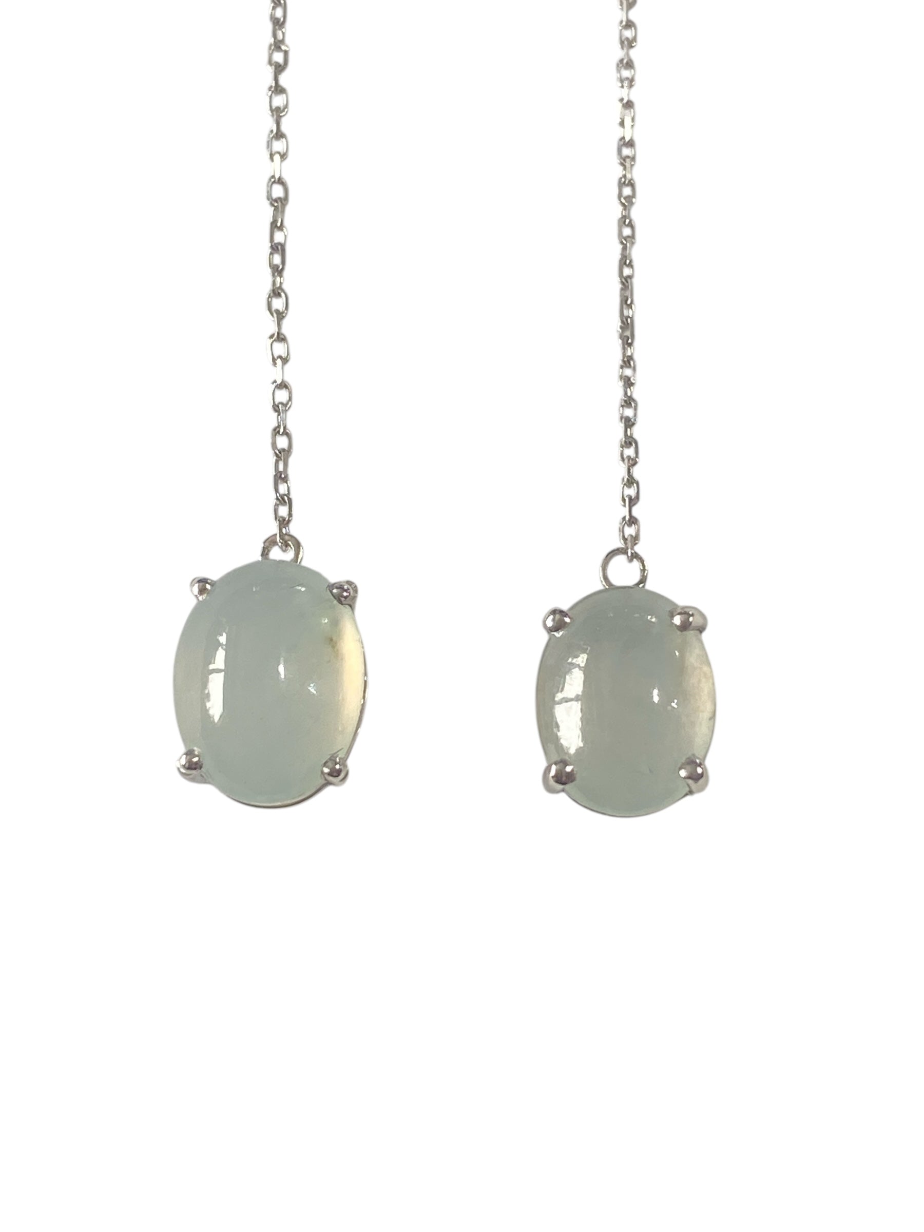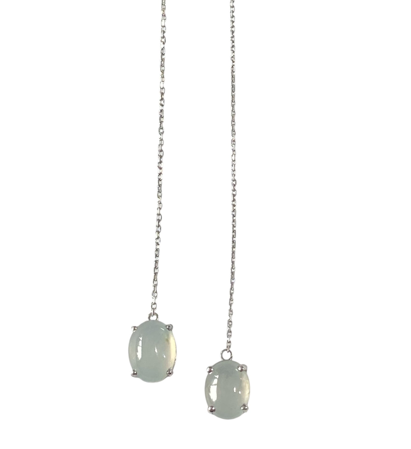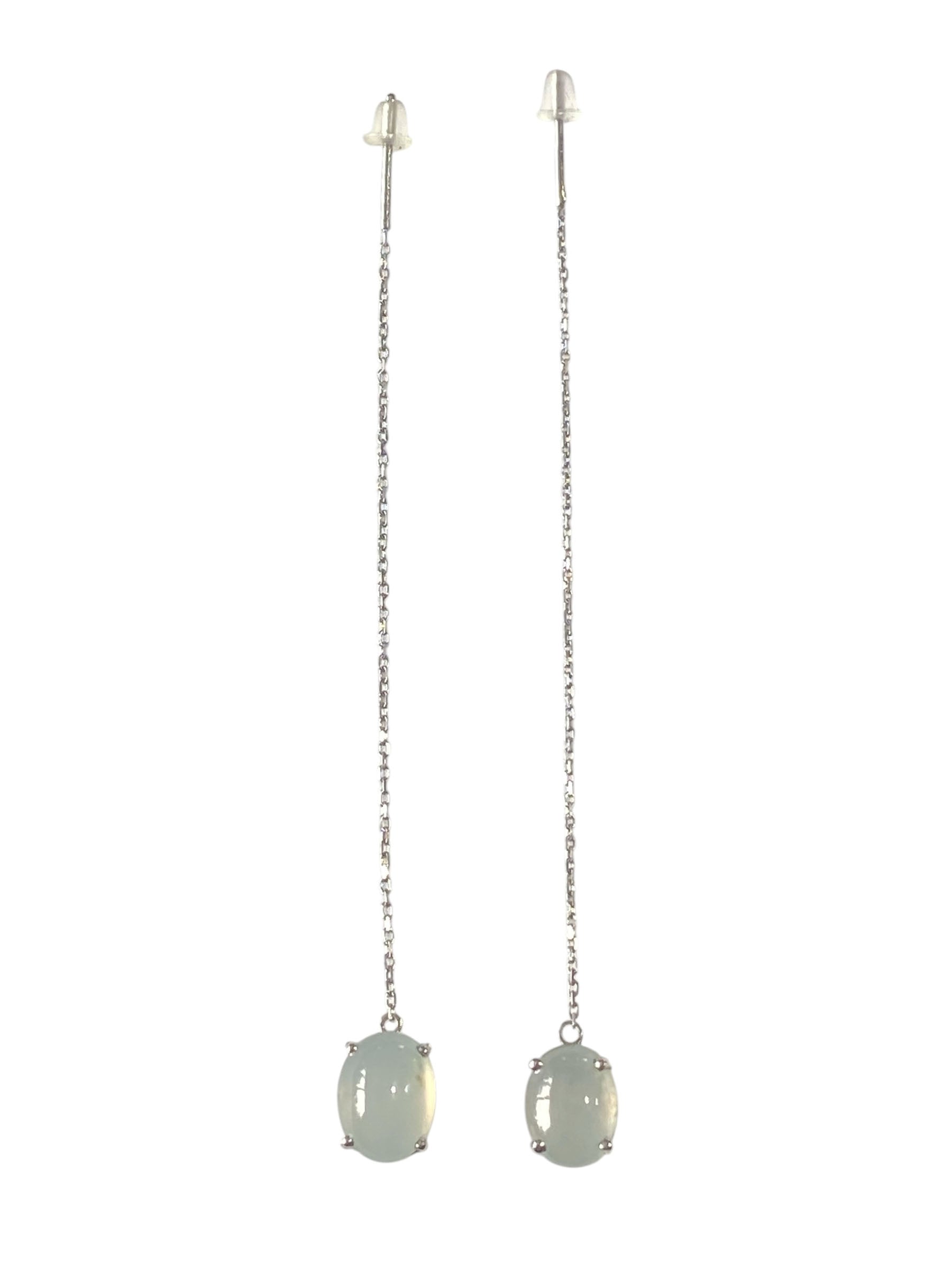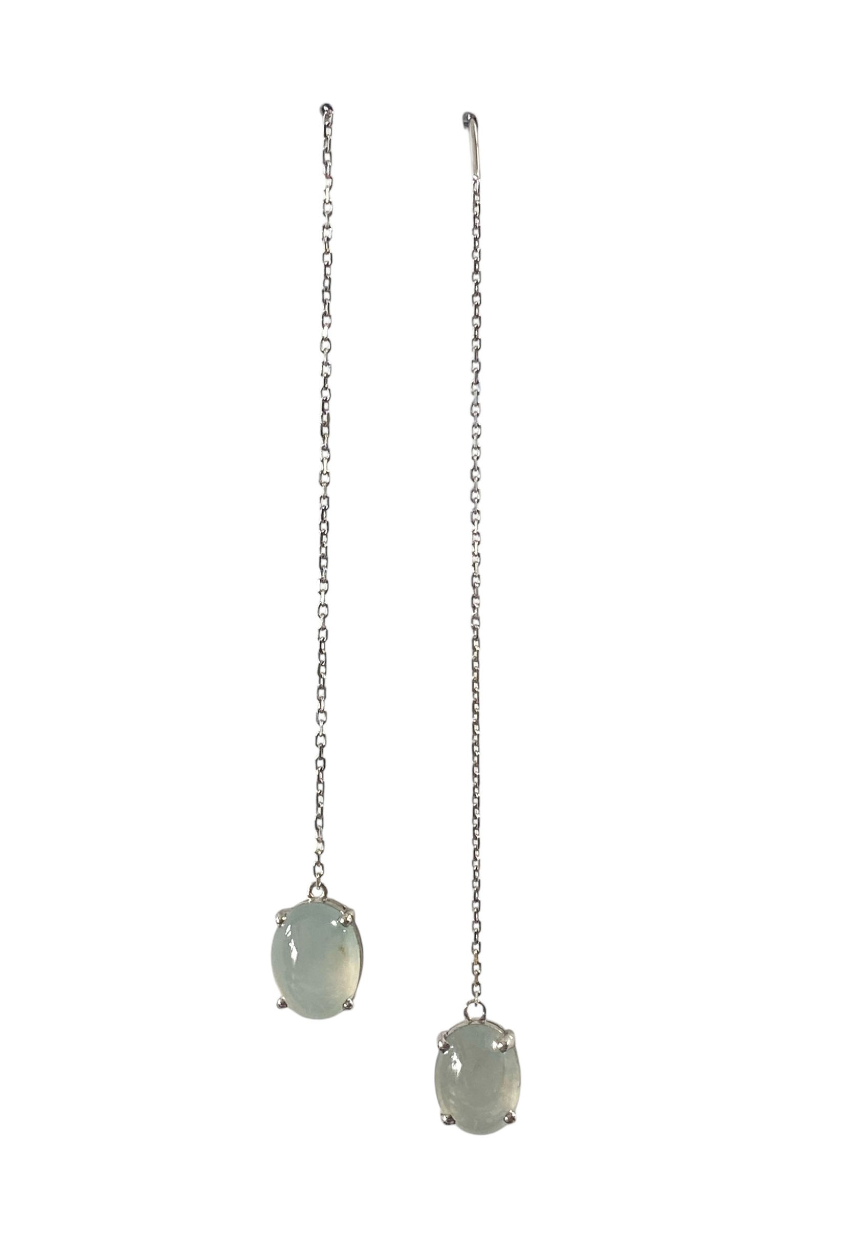 Elegant 18K white gold earrings feature oval-shaped blue rice water jadeite jade, Measuring 3.25" in height and 0.25" in width, with a depth of 0.25", these ear stud earrings exude elegance and sophistication