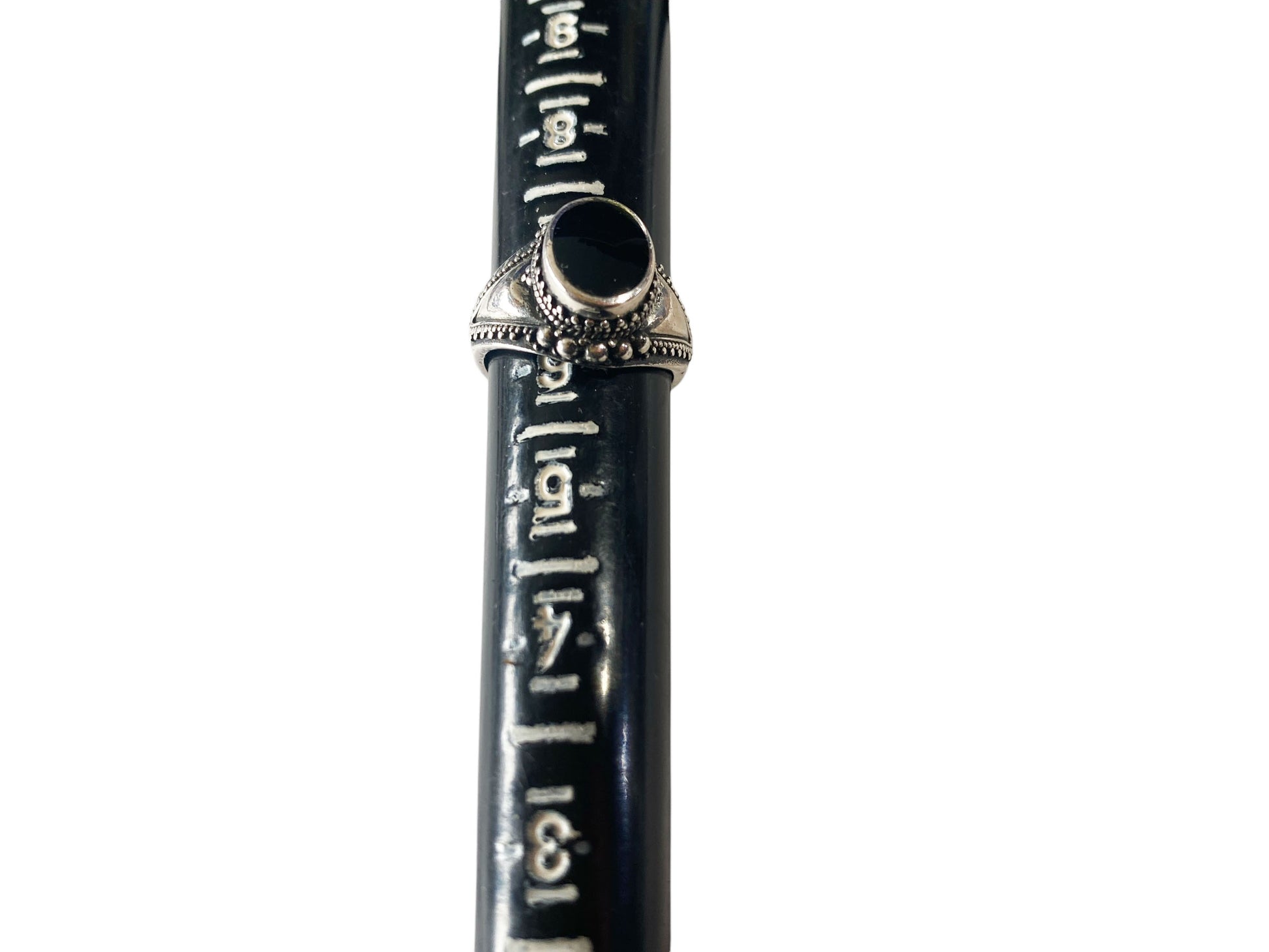 This is a beautiful Unisex silver ring with a large oval black stone. The ring is made of 925 silver and features intricate high relief detail ring size 6.5