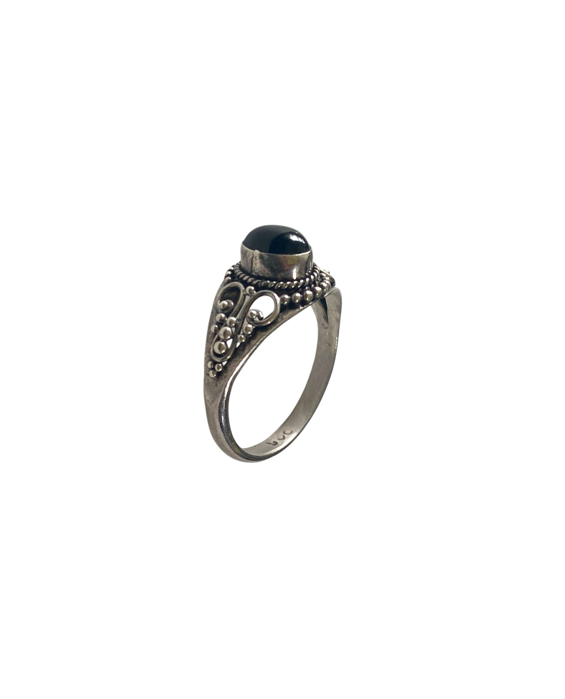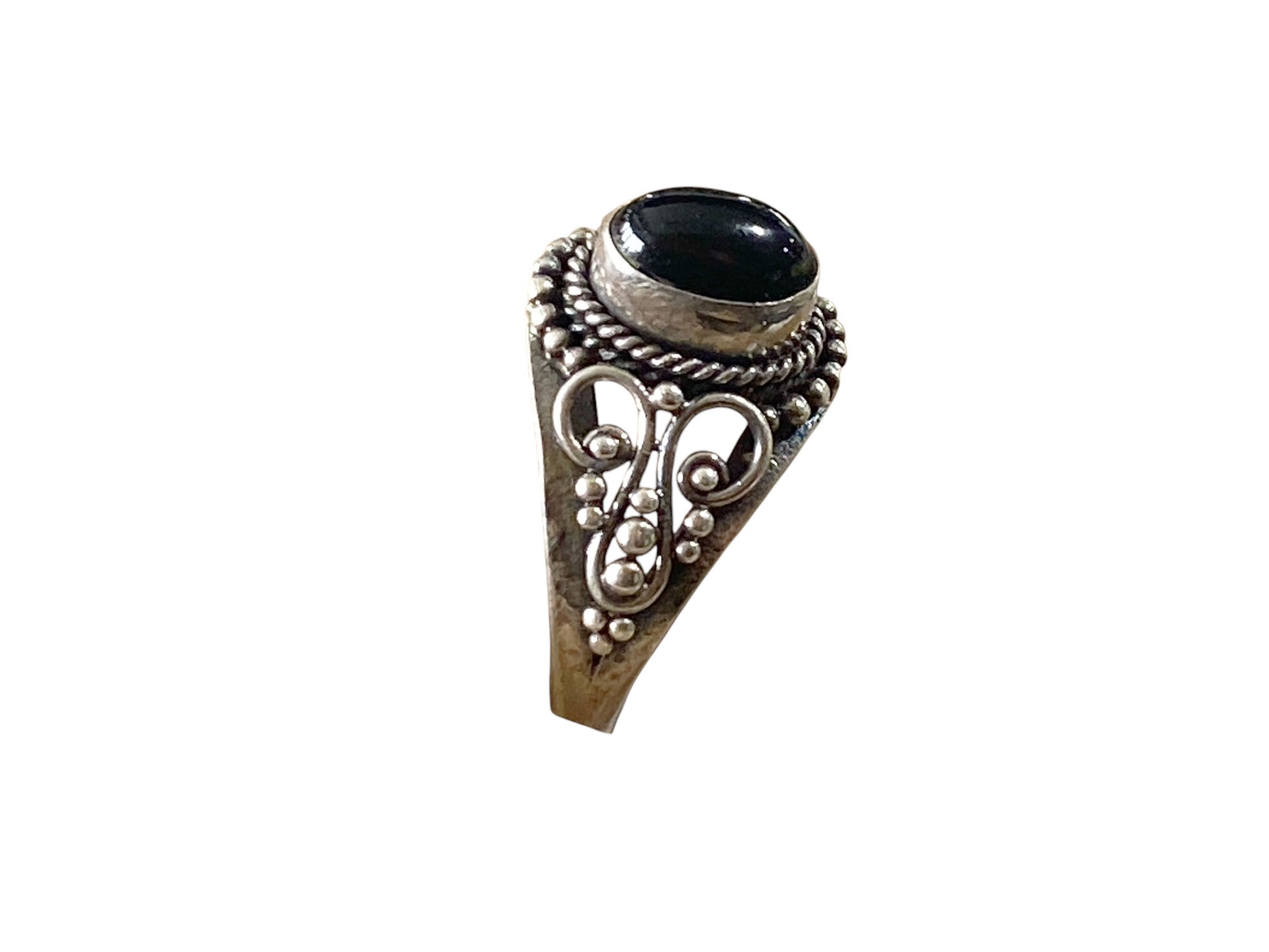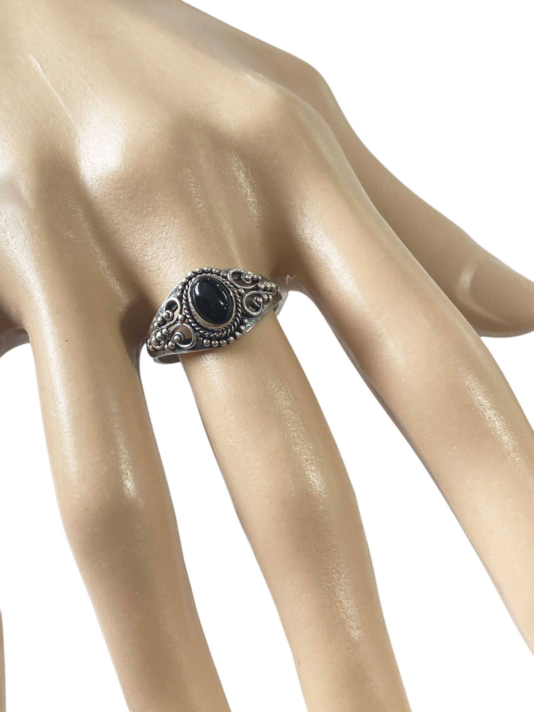 This is a beautiful Unisex silver ring with a large oval black stone. The ring is made of 925 silver and features intricate high relief detail ring size 7