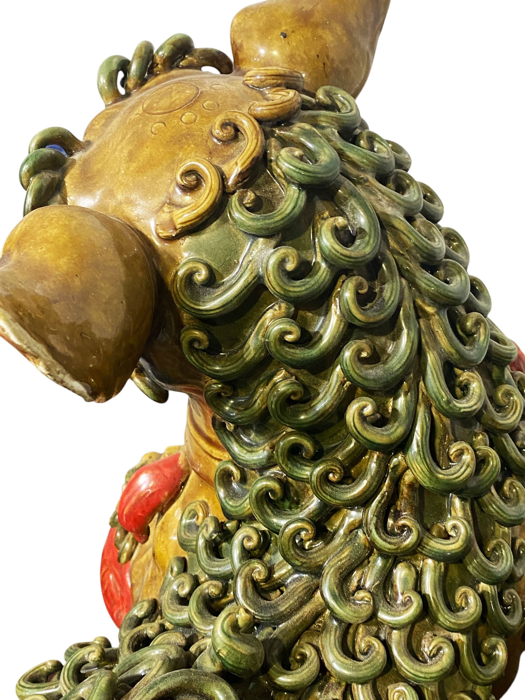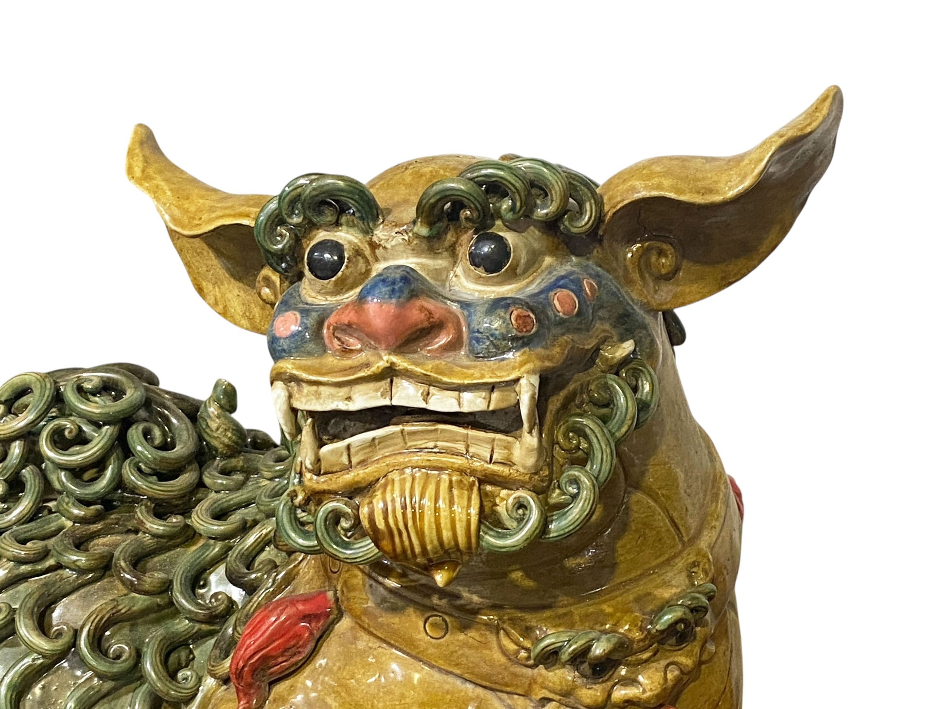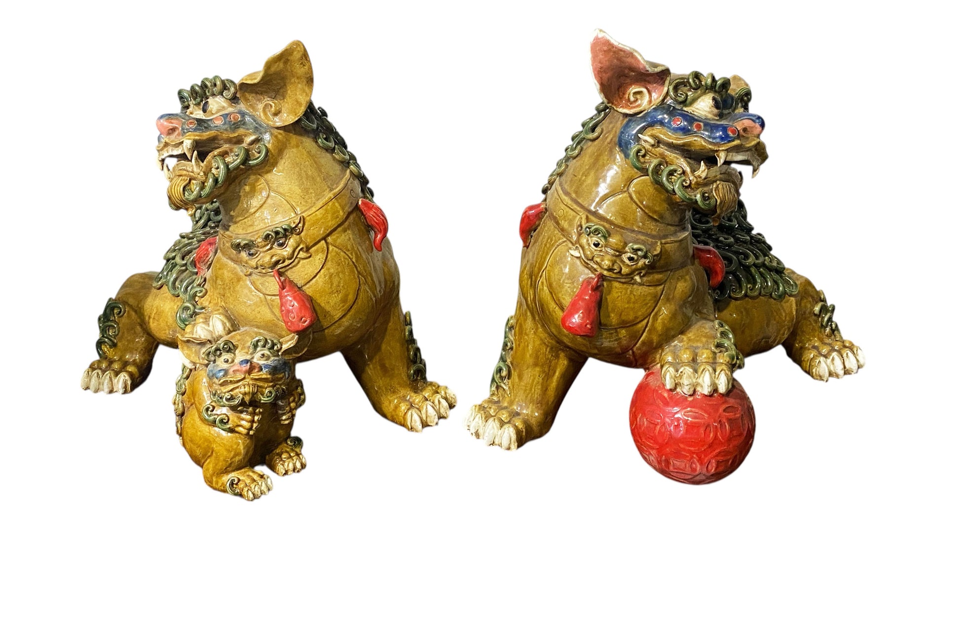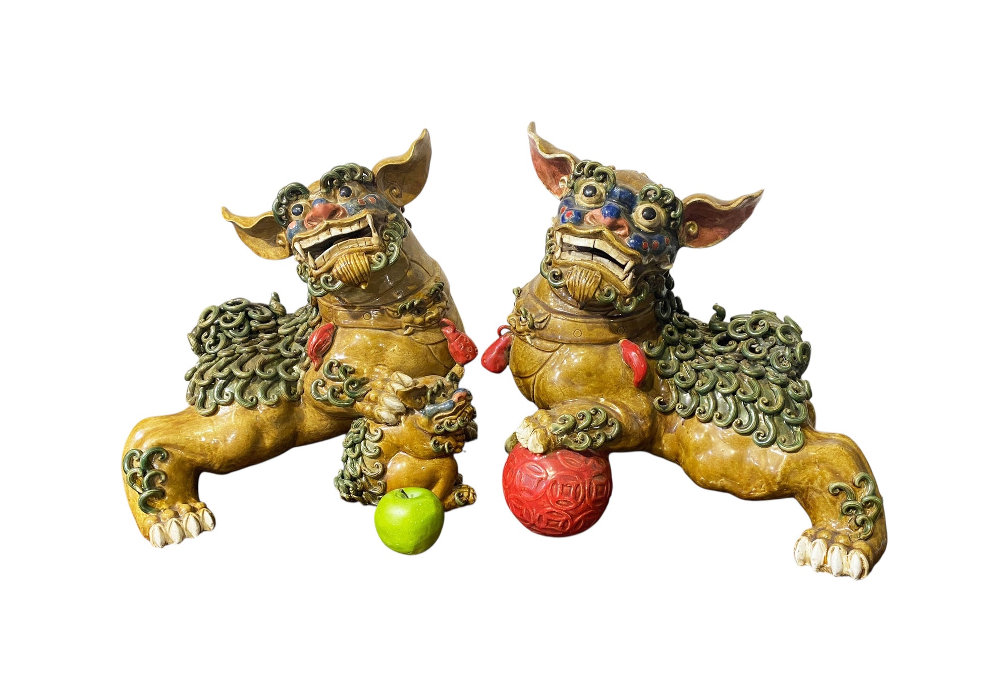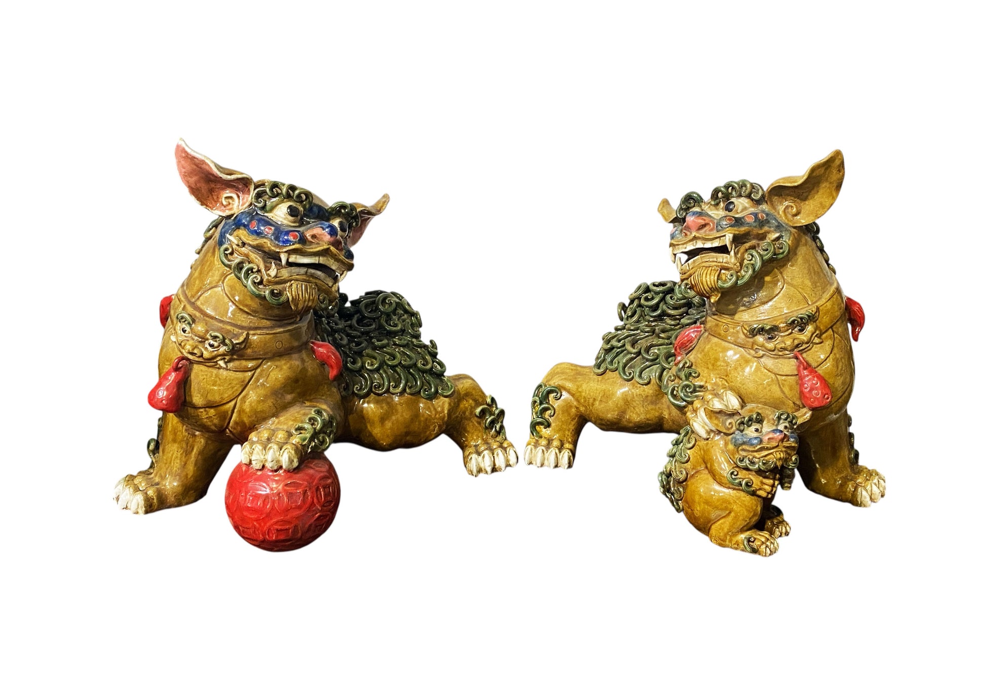 Exquisite Vintage Chinoiserie Sancai Glaze Pottery Foo Dogs, authentically crafted as a mirror pair. These hand-carved and meticulously painted guardians feature intricate detailing with vibrant yellow, green, and red enamel work. Representing the balance of Yin and Yang energies, the male (19"H × 12"W × 16"D) and female (18.5"H × 12"W × 20"D) create a harmonious pairing. These substantial decorative pieces offer both cultural significance and aesthetic distinction for the discerning collector.