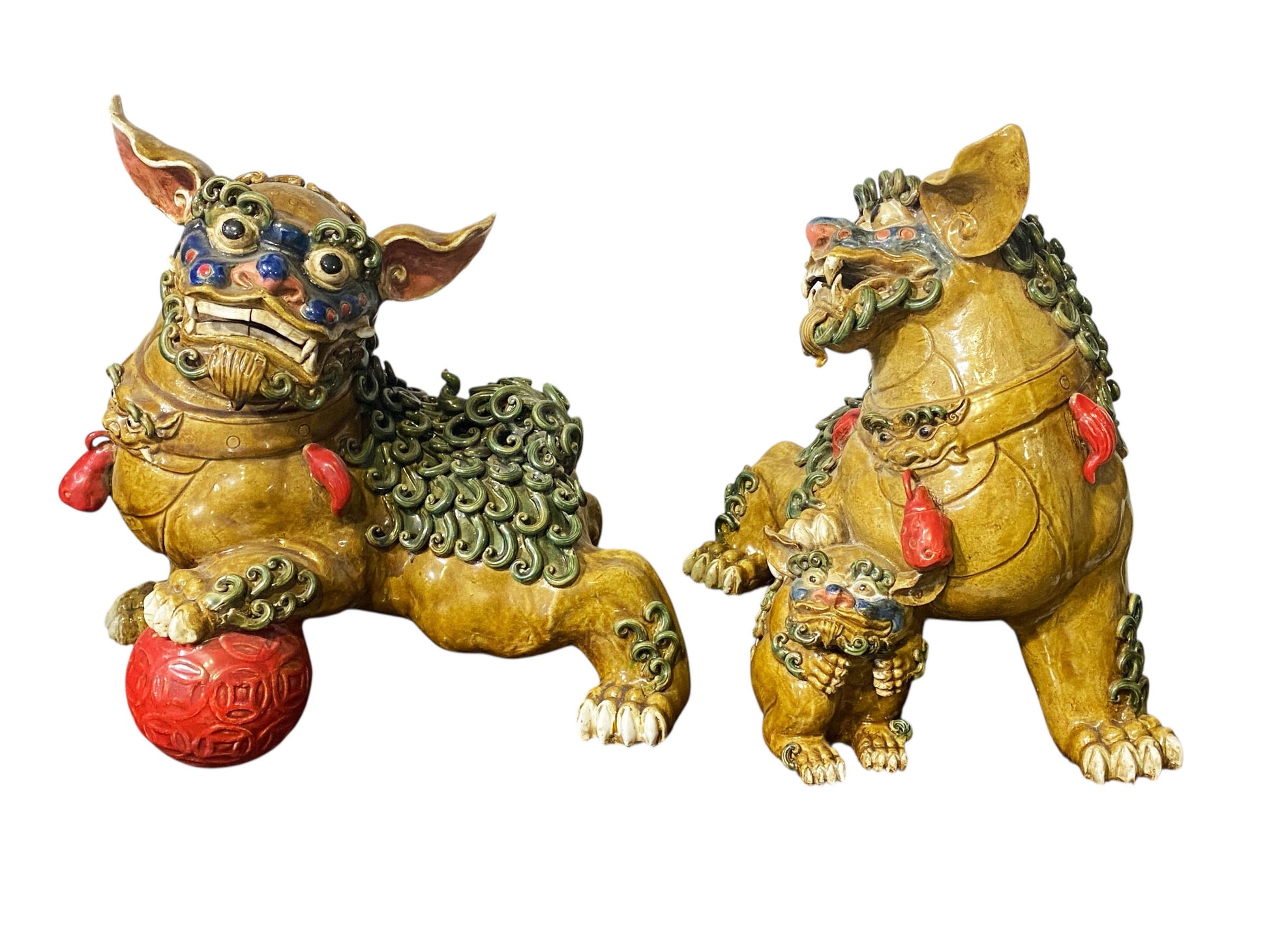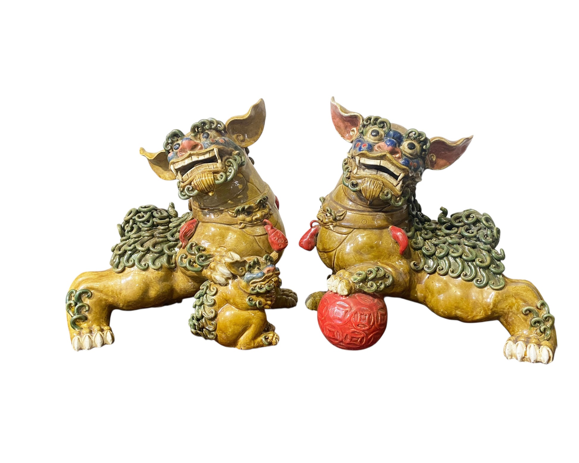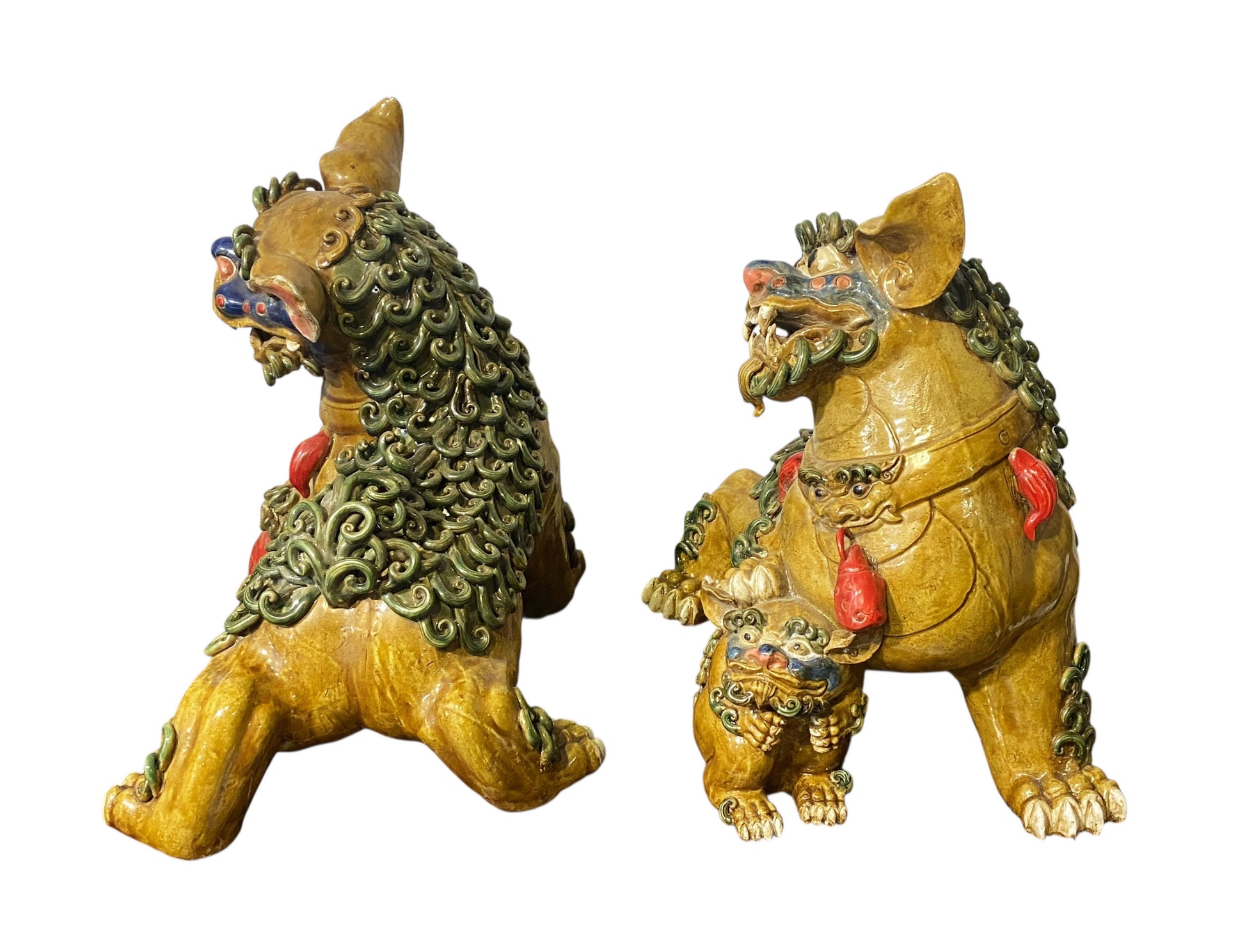 #6352 Vintage Large Chinoiserie Sancai Glaze Pottery Foo Dogs - a Pair 19" H