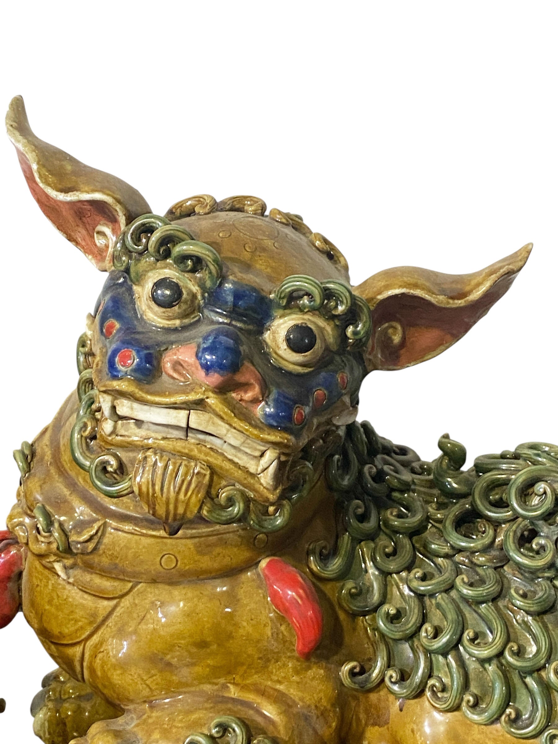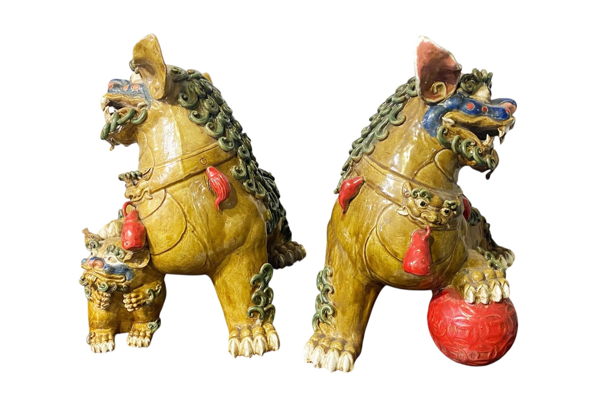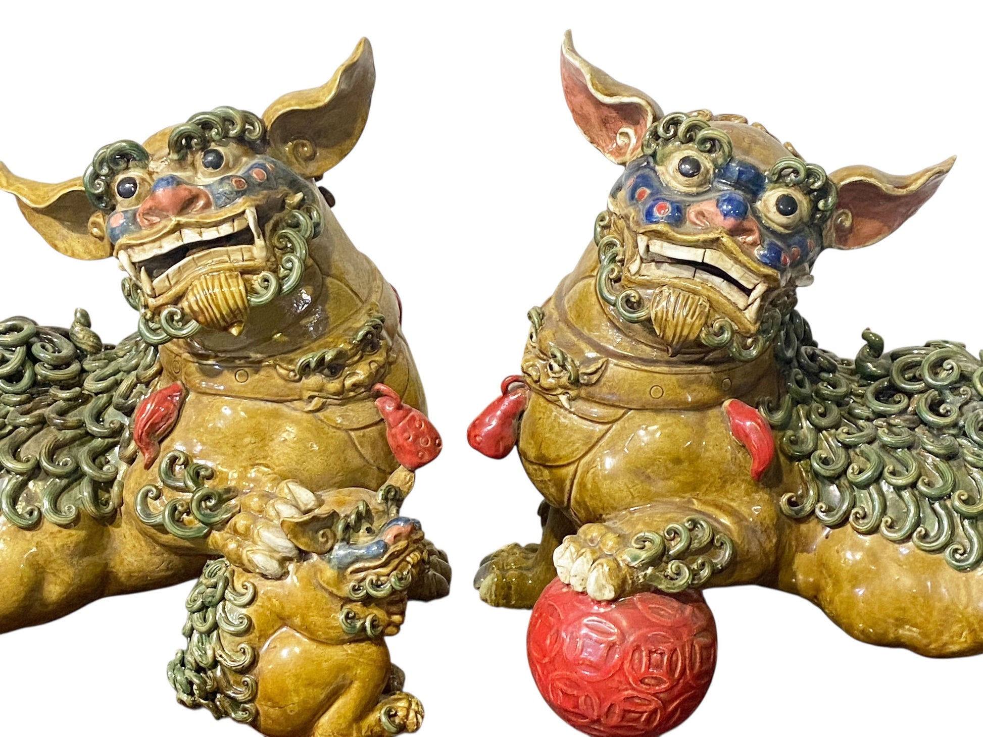 #6352 Vintage Large Chinoiserie Sancai Glaze Pottery Foo Dogs - a Pair 19" H