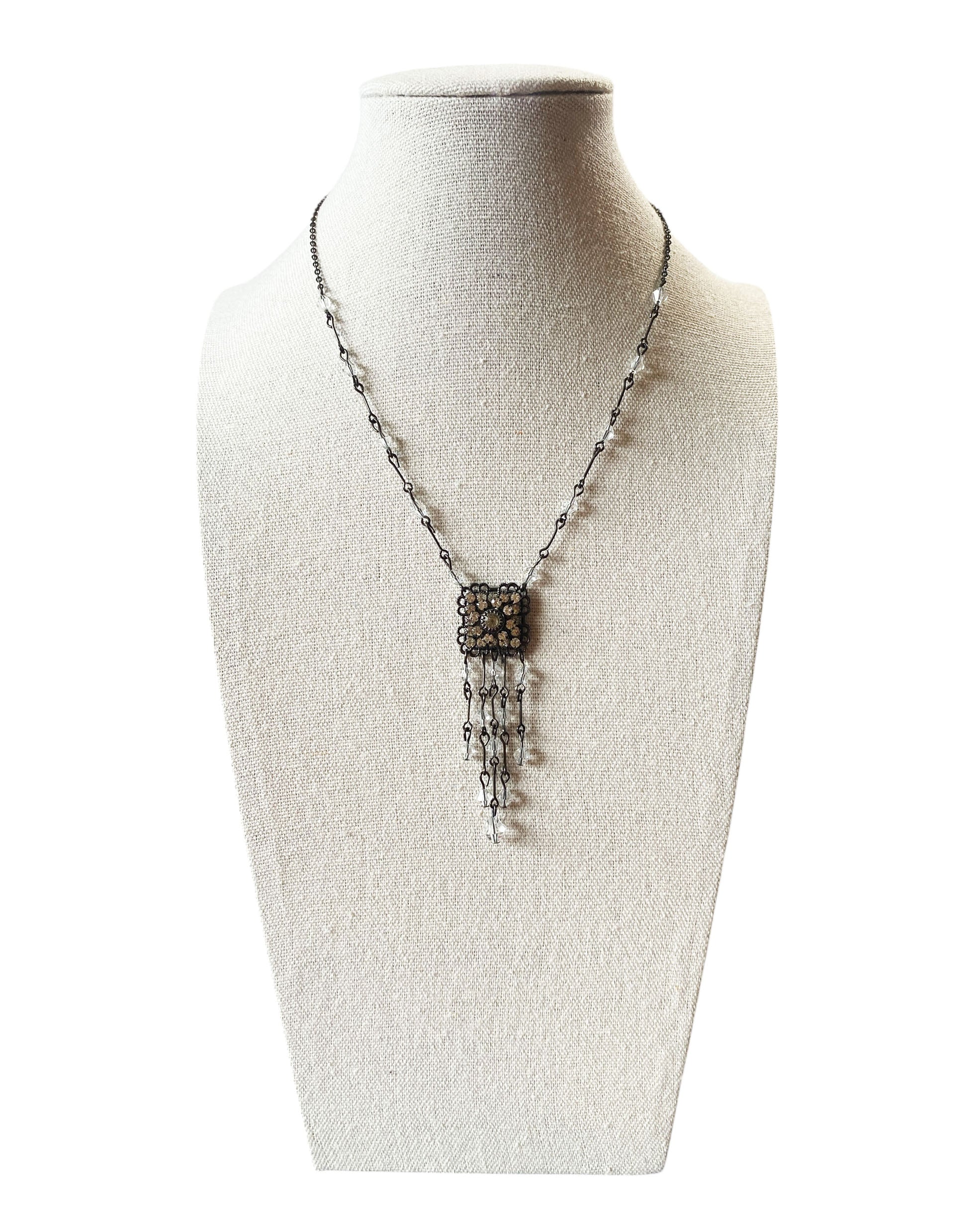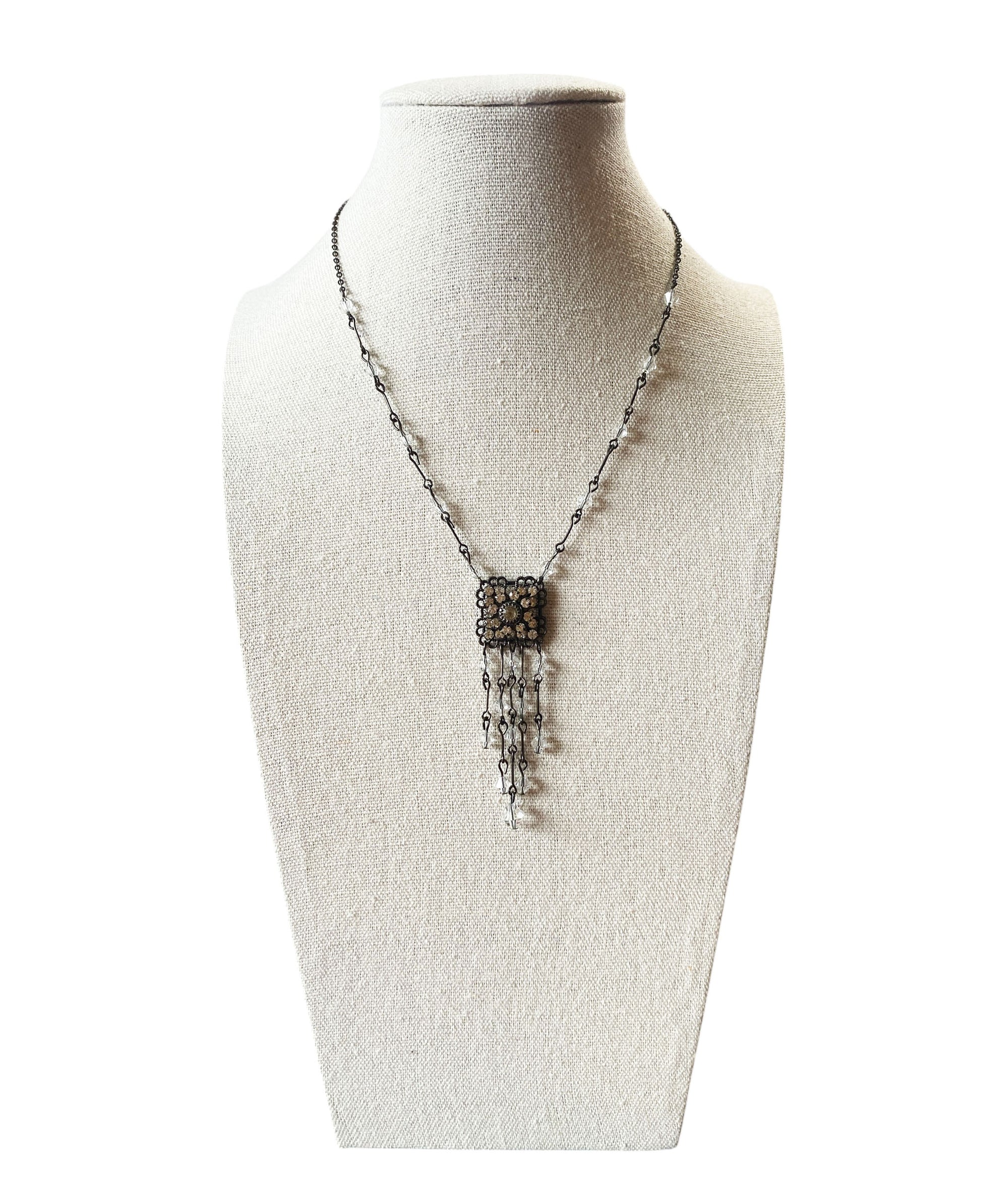 this delicate Vintage Choker Necklace Crafted from gun metal and embellished with different size dainty Czech clear Cristal , is an elegant piece in excellent condition. Measuring 9.5 inches in height and with a neck circumference of 7 inches, 0.25" D t is a valuable addition to any jewelry collection