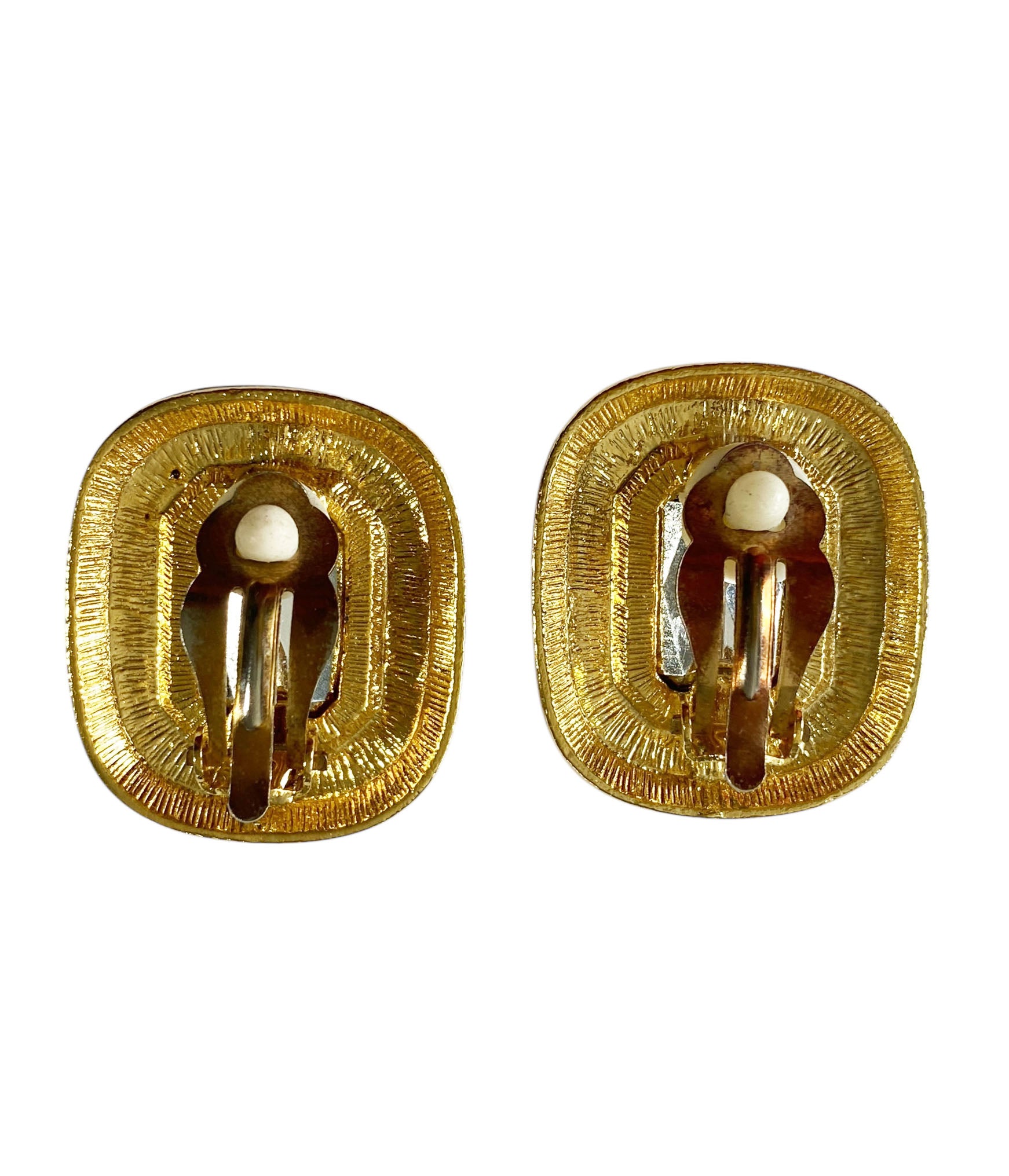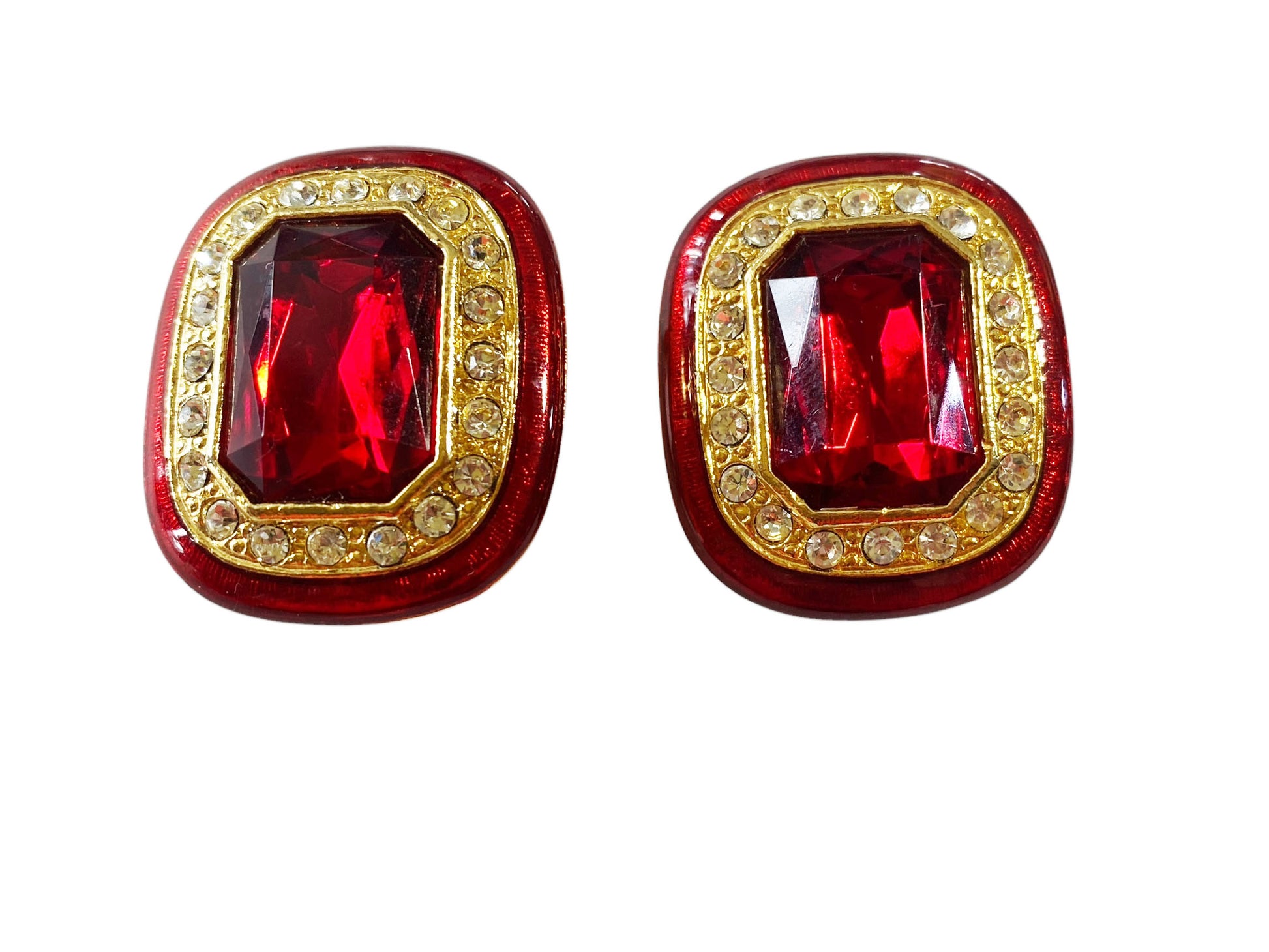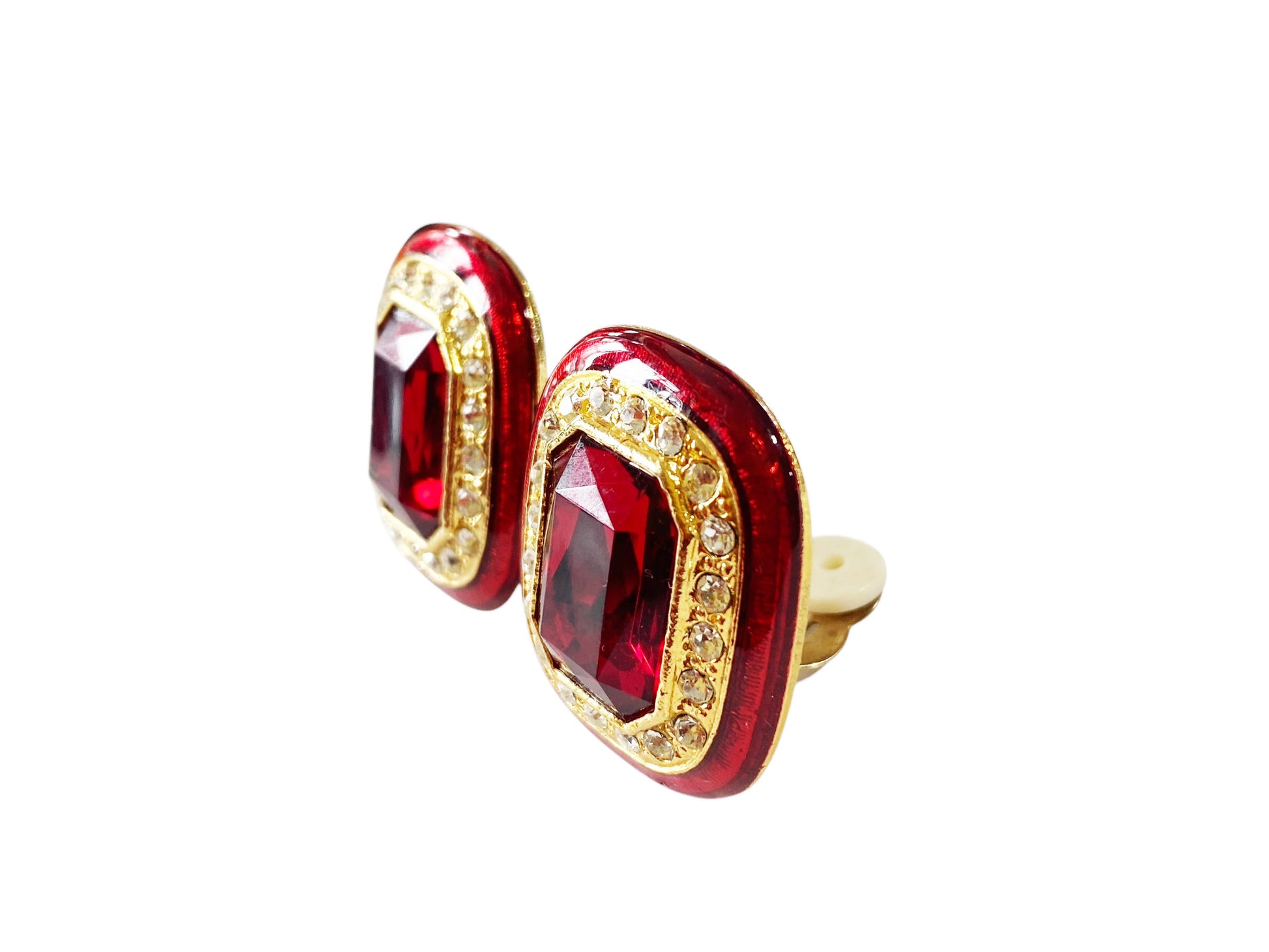 #6393 Vintage Red Enamel And Faux Ruby /Clear Rhinestone Clip on Earrings