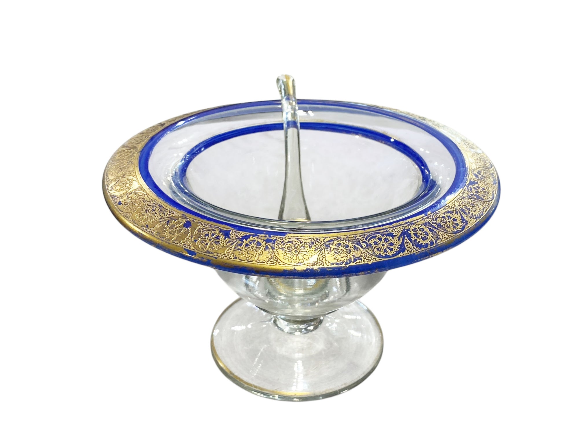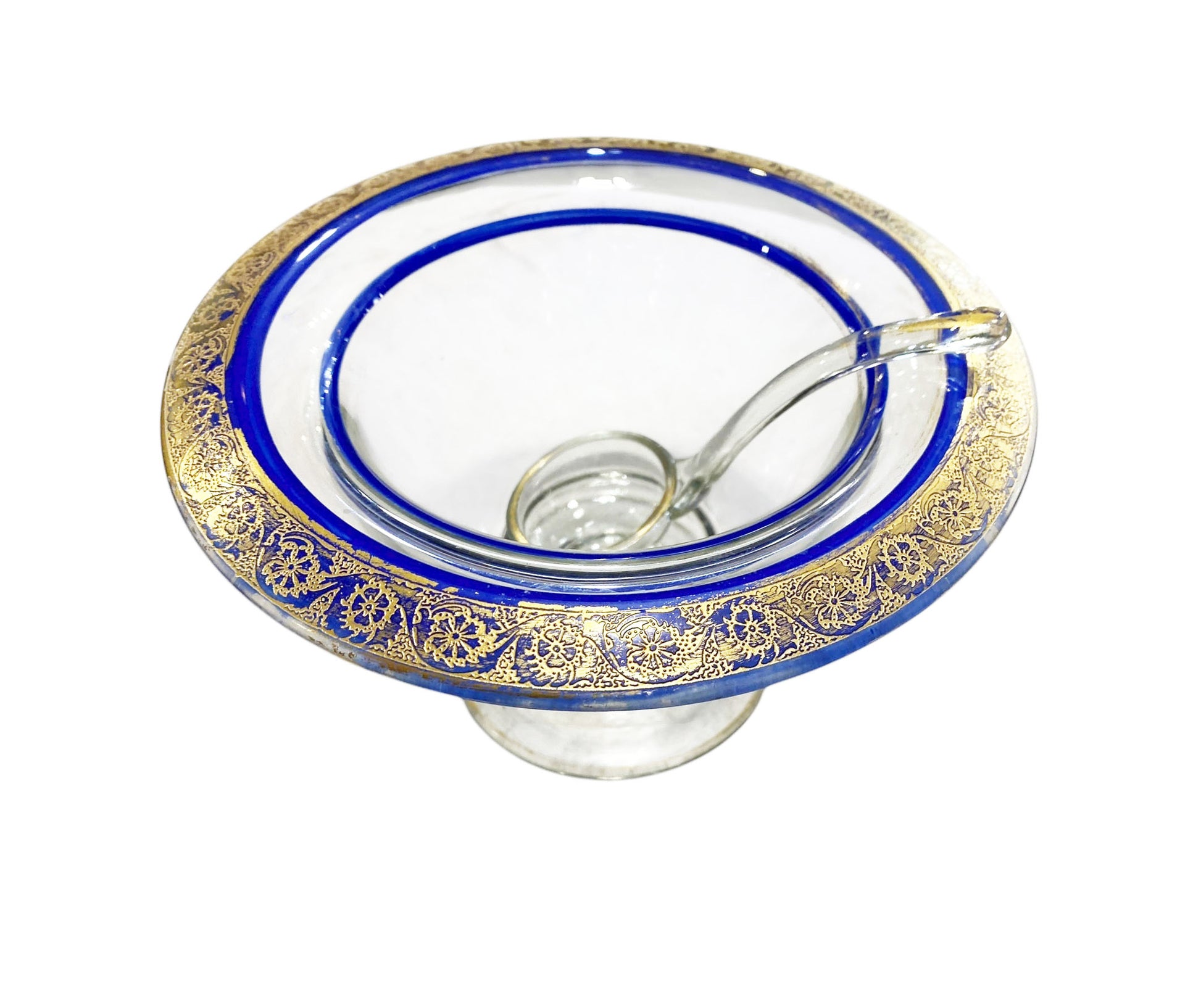 This exquisite French footed glass bowl showcases hand-etched round surface with delicate blue enamel accents, and gilded embellishments. 4 inches tall by 6.75-inch diameter, the footed bowl accommodates condiments or caviar ,accompanied by its original spoon, this piece bears the subtle patina of age, with minor wear consistent with its antique provenance.