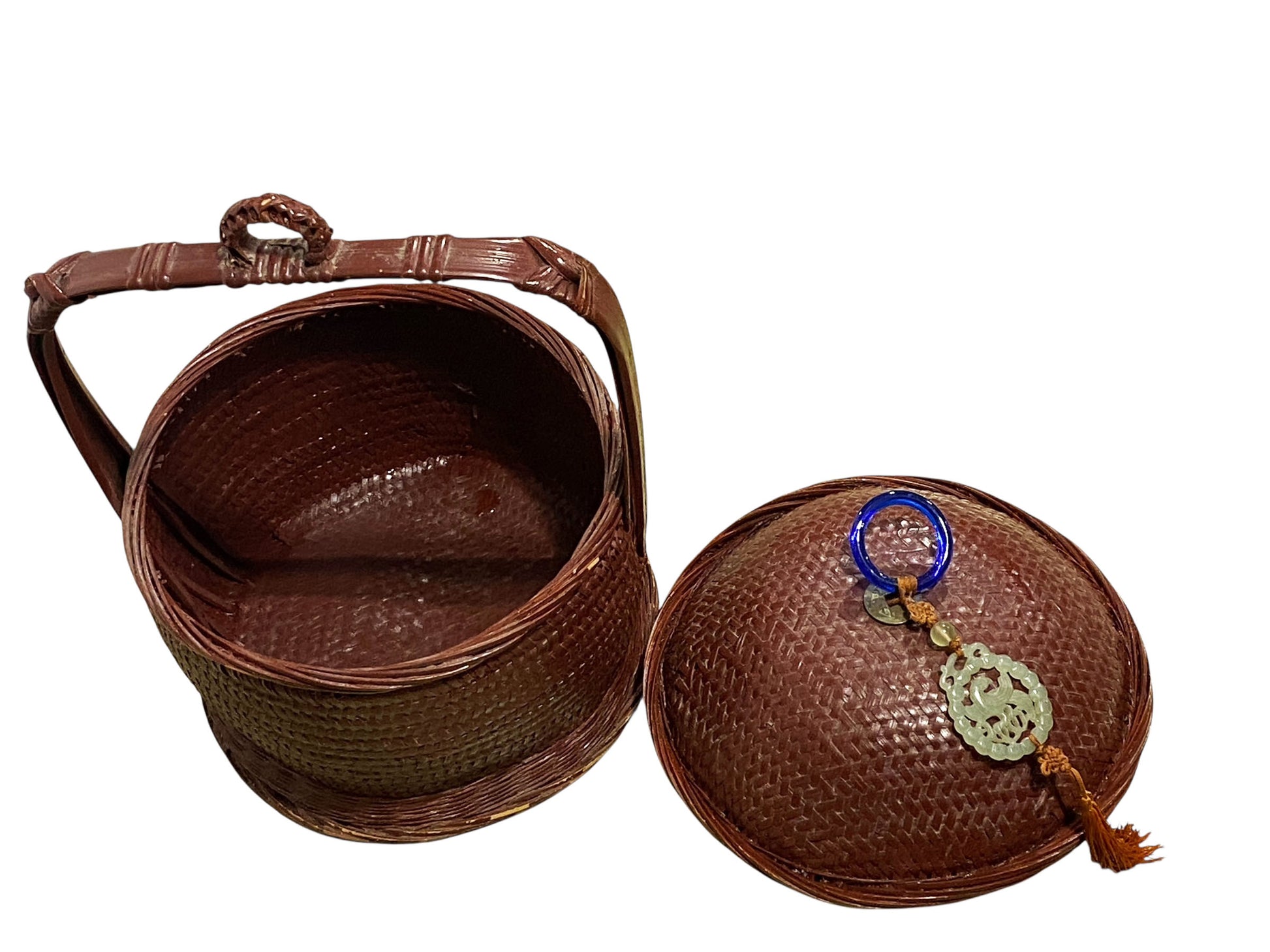 Vintage chinoiserie woven wicker storage basket and a fitted lid.. This 12.5" tall piece showcases jade-green carving & red silk tassel with a blue glass ring and a fitted lid, perfect for decorative storage or display. Approximately 8" in diameter.