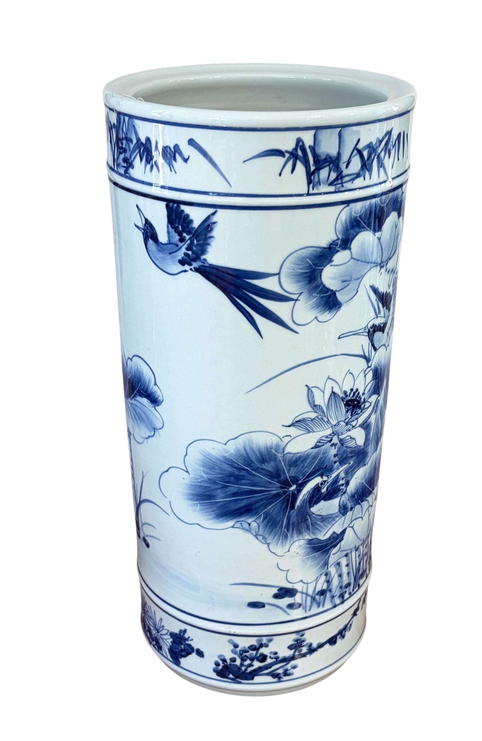 Superb Chinoiserie Blue and White Porcelain Vase/Umbrella Holder or walking sticks stand , featuring traditional hand-painted motifs with lotus flowers and birds in rich cobalt blue on a white background. this versatile piece add a touch of classic Chinoiserie charm to any interior. 20"h by 9.5" Diameter
