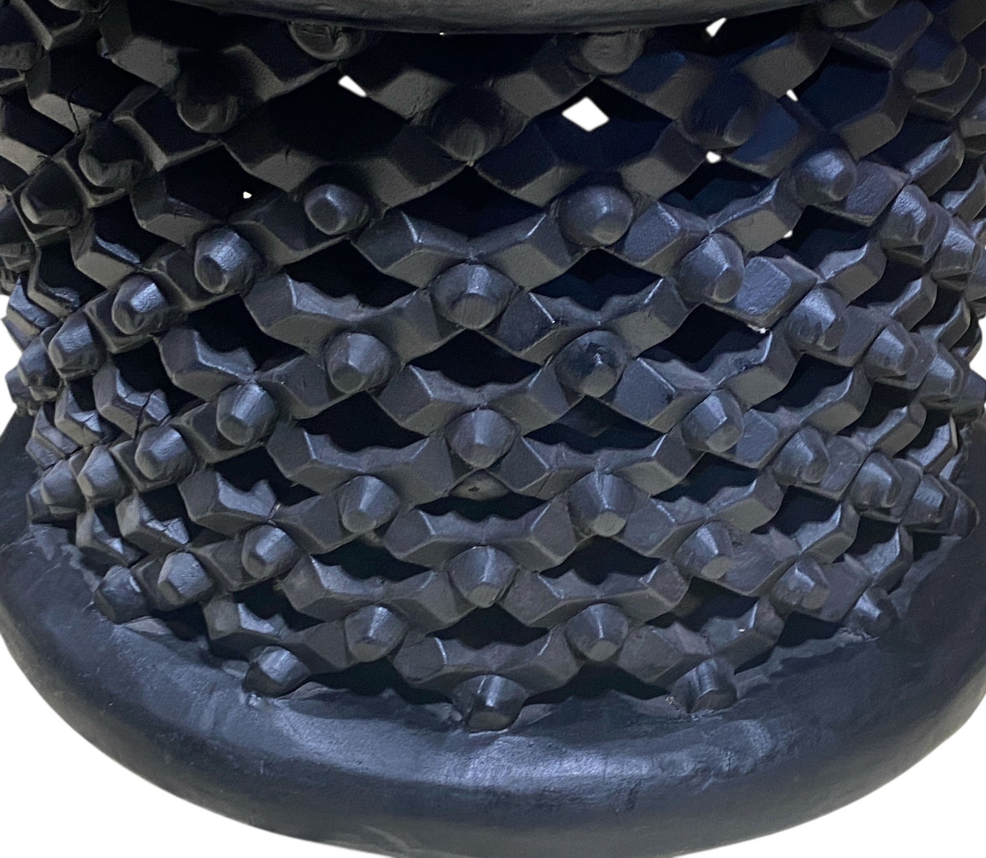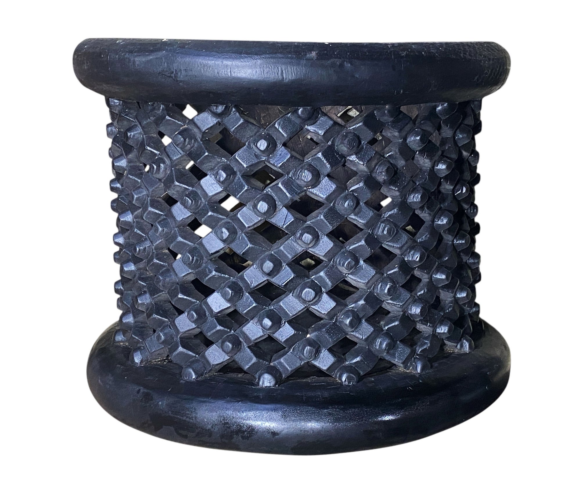 This vintage African Bamileke Spider Stool/Table is carved from a single piece of wood and boasts a beautiful Bamileke spider cross design from Cameroon, it stands 17" tall and 21" in diameter, ready for use.