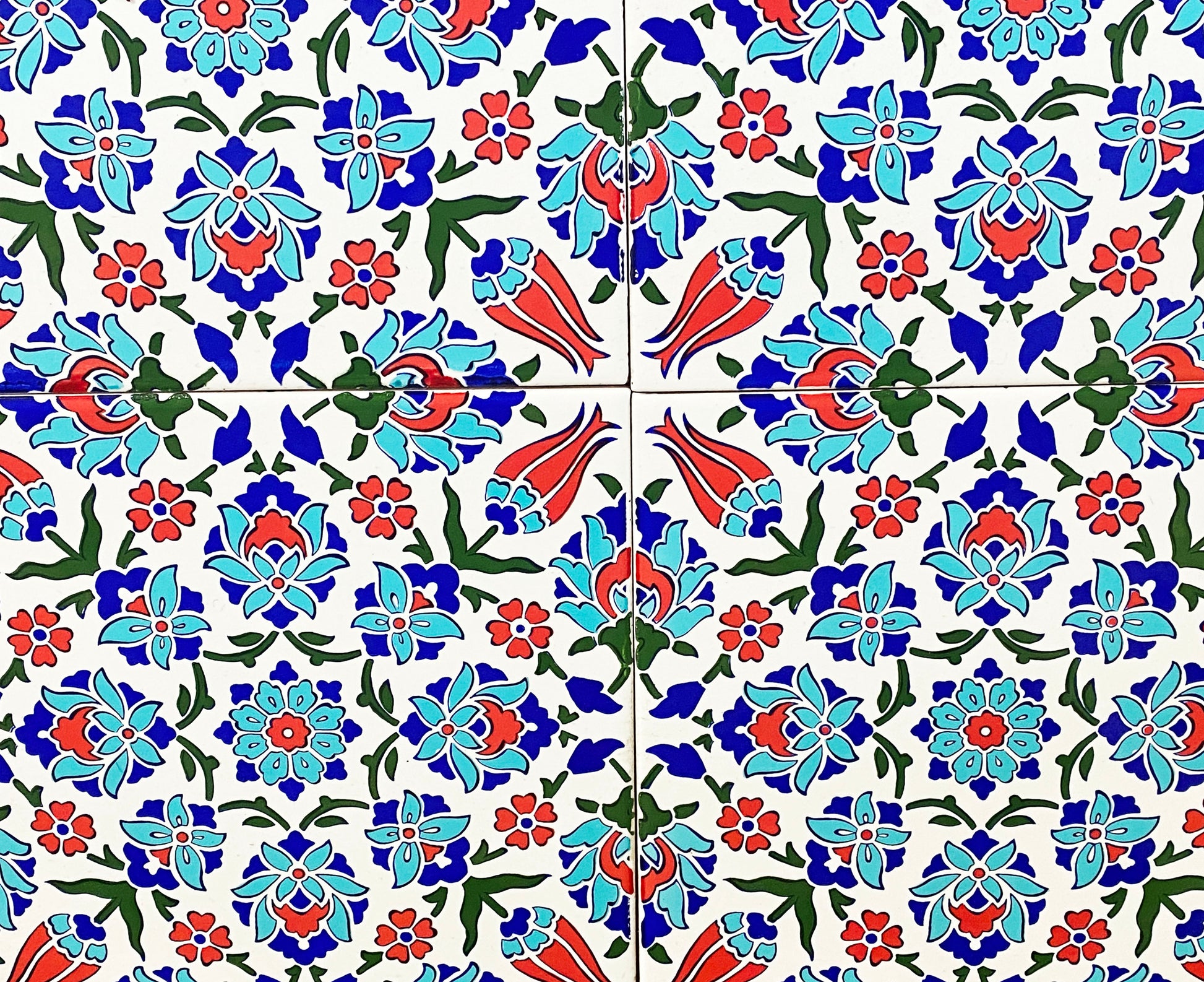 This Turkish ceramic tile collection features four individual 8"x8" pieces that combine to form a striking 16"x16" composition. Crafted in the traditional Iznik style, each quarter-inch-thick tile showcases intricate floral motifs inspired by 16th and 17th-century Ottoman design, rendered in red, white, light blue, and deep blue tones. The protective glaze finish makes these tiles suitable for moisture-prone environments.