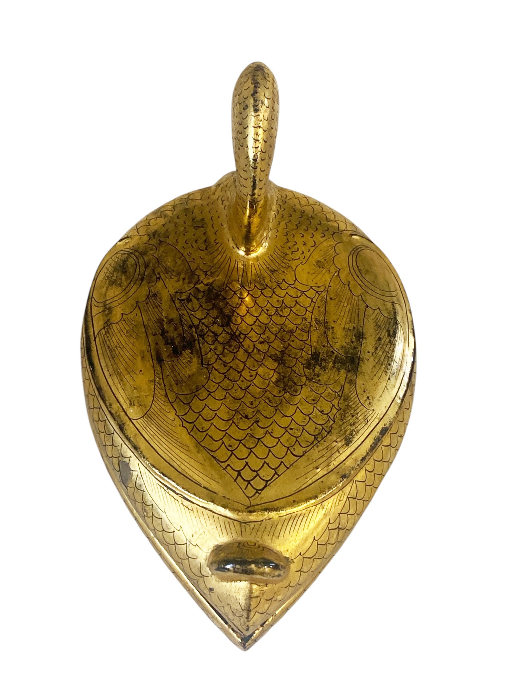 This charming Burmese trinket box showcases traditional lacquerware craftsmanship, featuring a duck form adorned with gold painted details on wood. Measuring 5" wide by 5" high by 8" deep, the piece displays the patina of age with minimal wear to the tail feathers, preserving its authentic character.