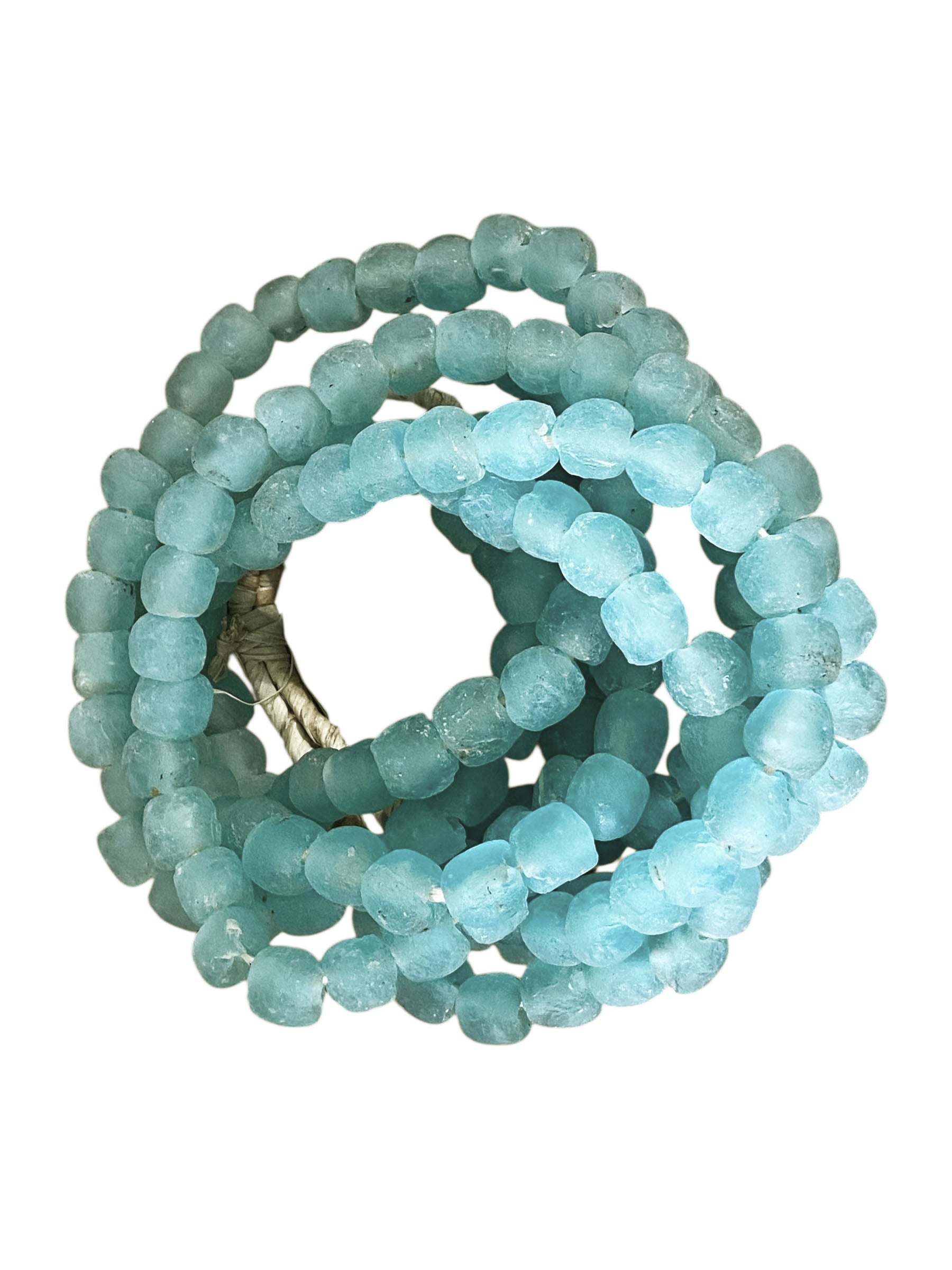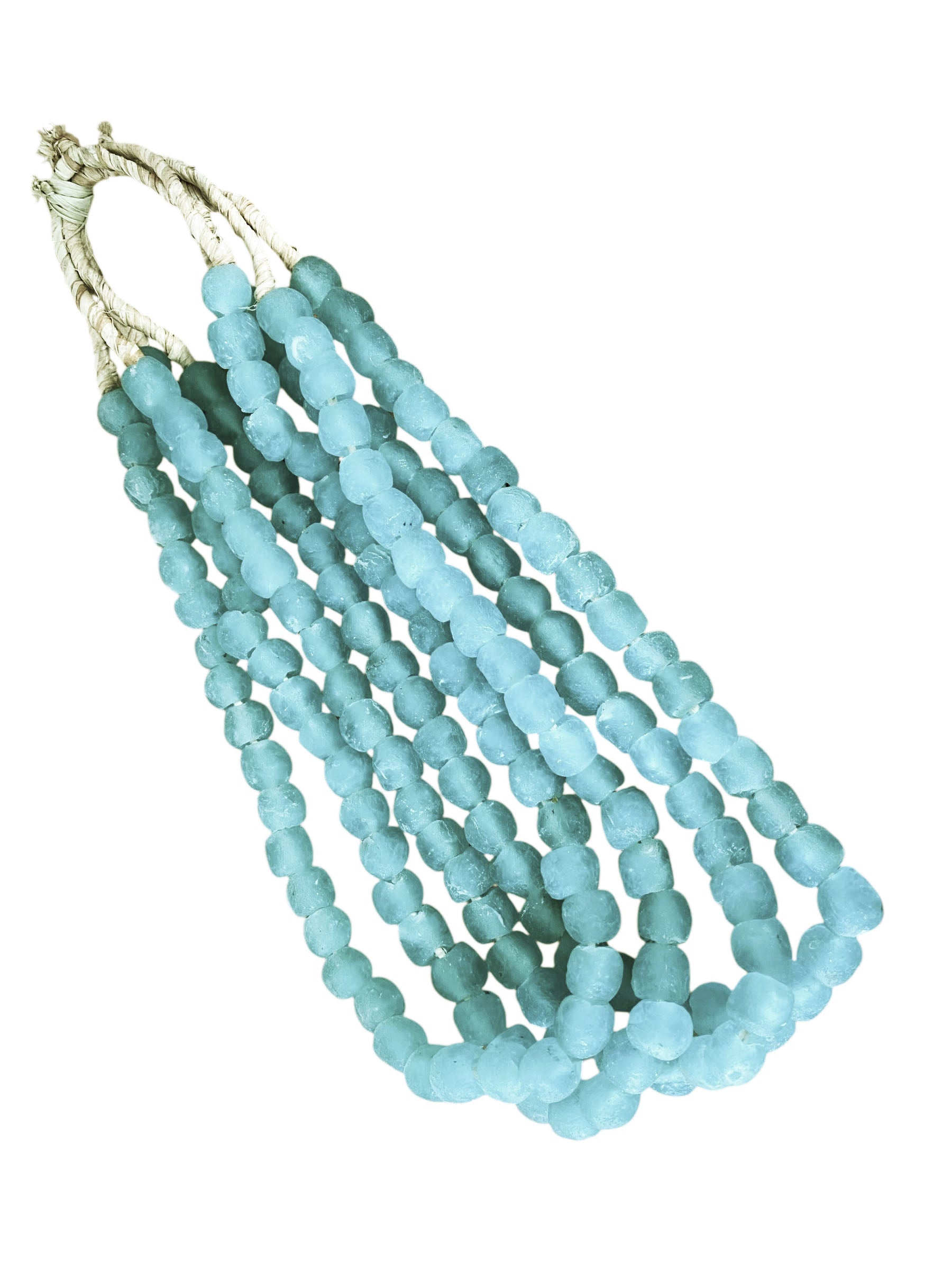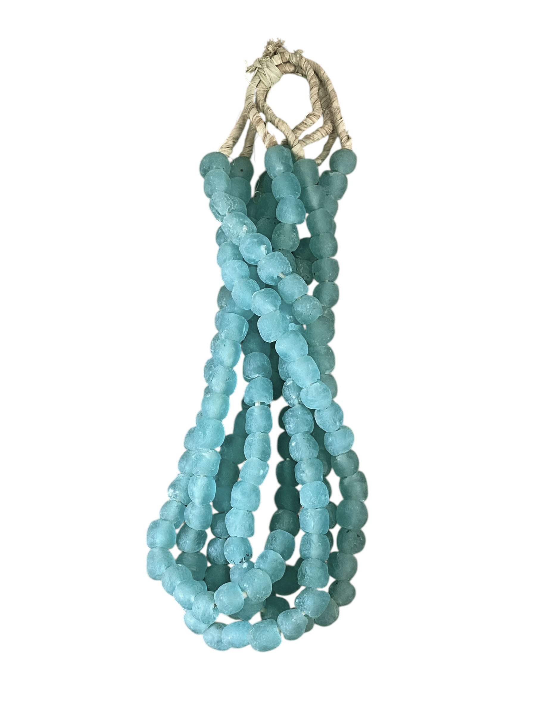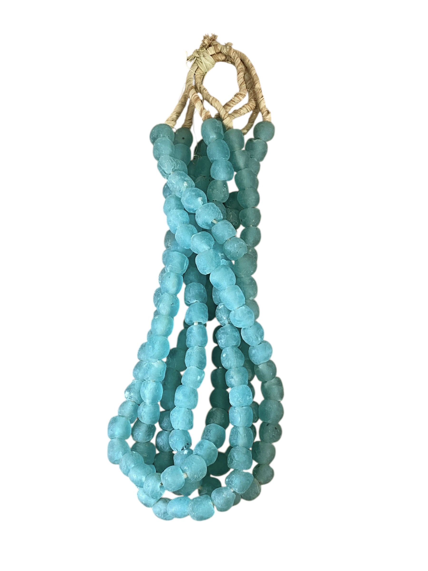 This impressive strand features Aqua glass African trade beads crafted by the Krobo artisans of Ghana, carefully strung on raffia. Measuring 13" in length with beads approximately 1/2" in size, each strand is distinct, perfect for layering in decor or as a unique accessory.
