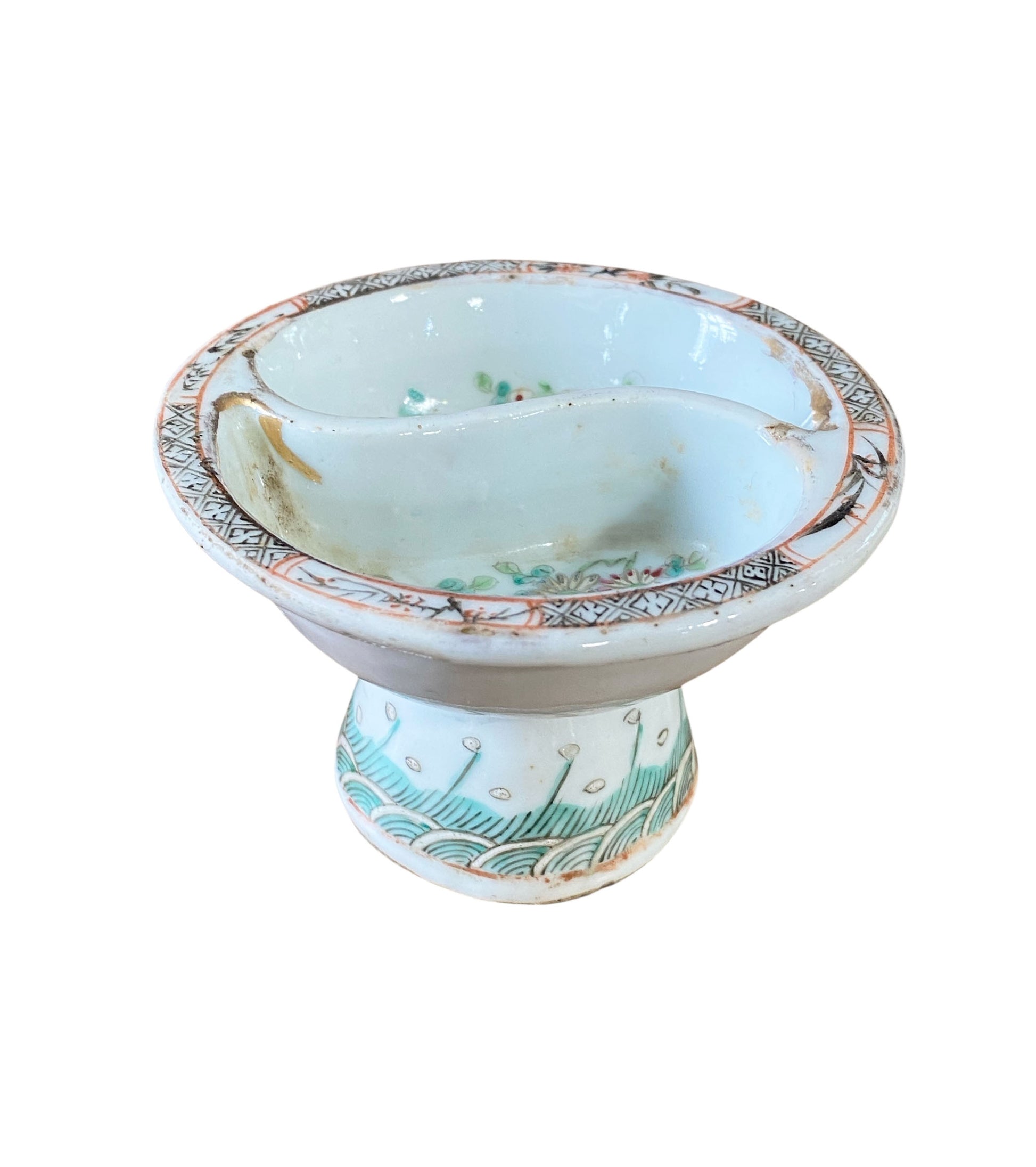 This exceptional Antique Chinese famille rose footed loop dipping bowl, crafted from glazed porcelain in the 19th century, showcases intricate hand-painted floral designs with raised glaze detailing. Its unique S-shaped central divider is ideal for separating sauces, while the elevated footed base exemplifies classic Chinese artisanal techniques. Though it shows minor signs of age-appropriate wear, the piece is preserved in good overall condition. 2.5" H by 3.75" diameter .
