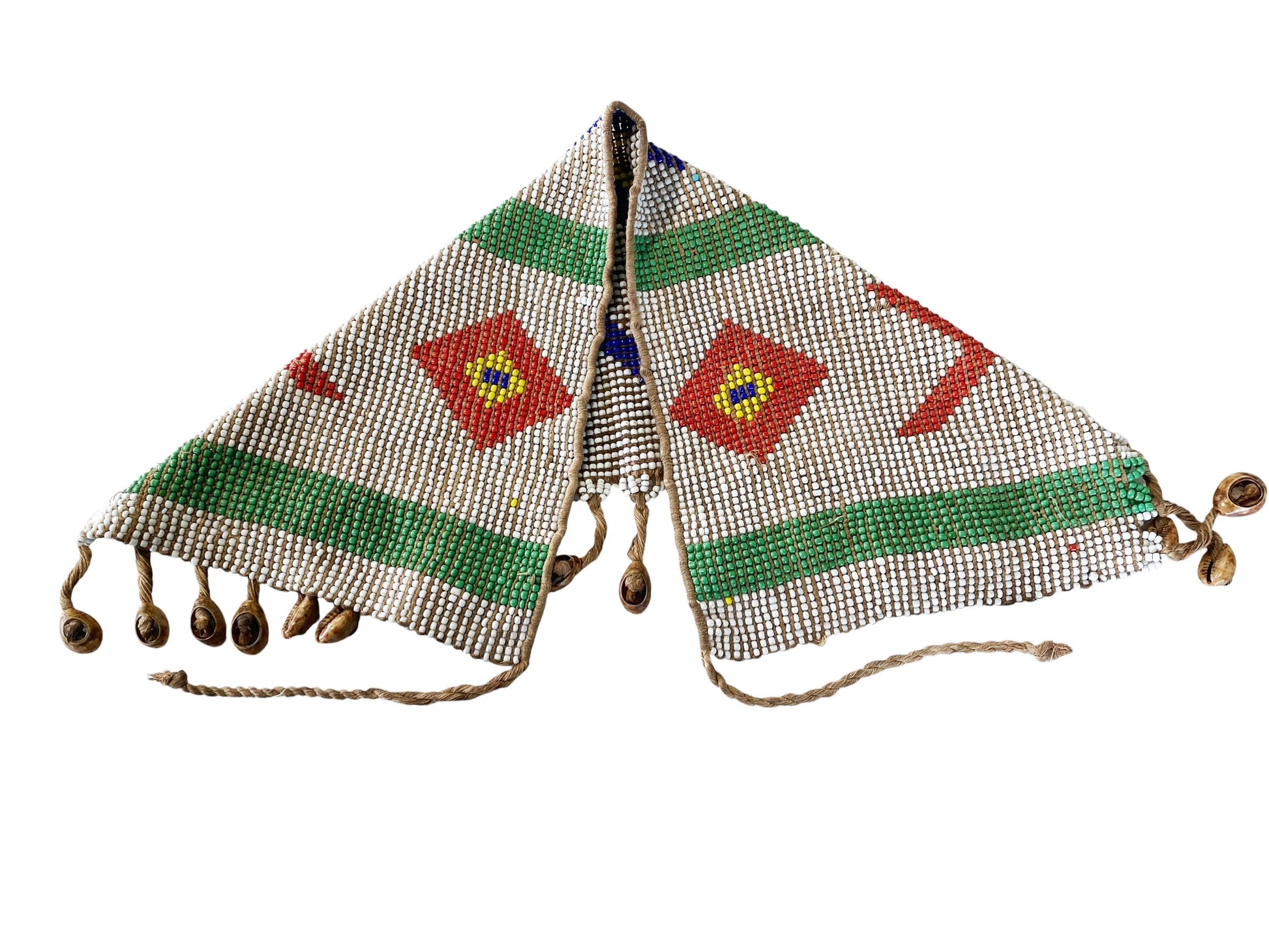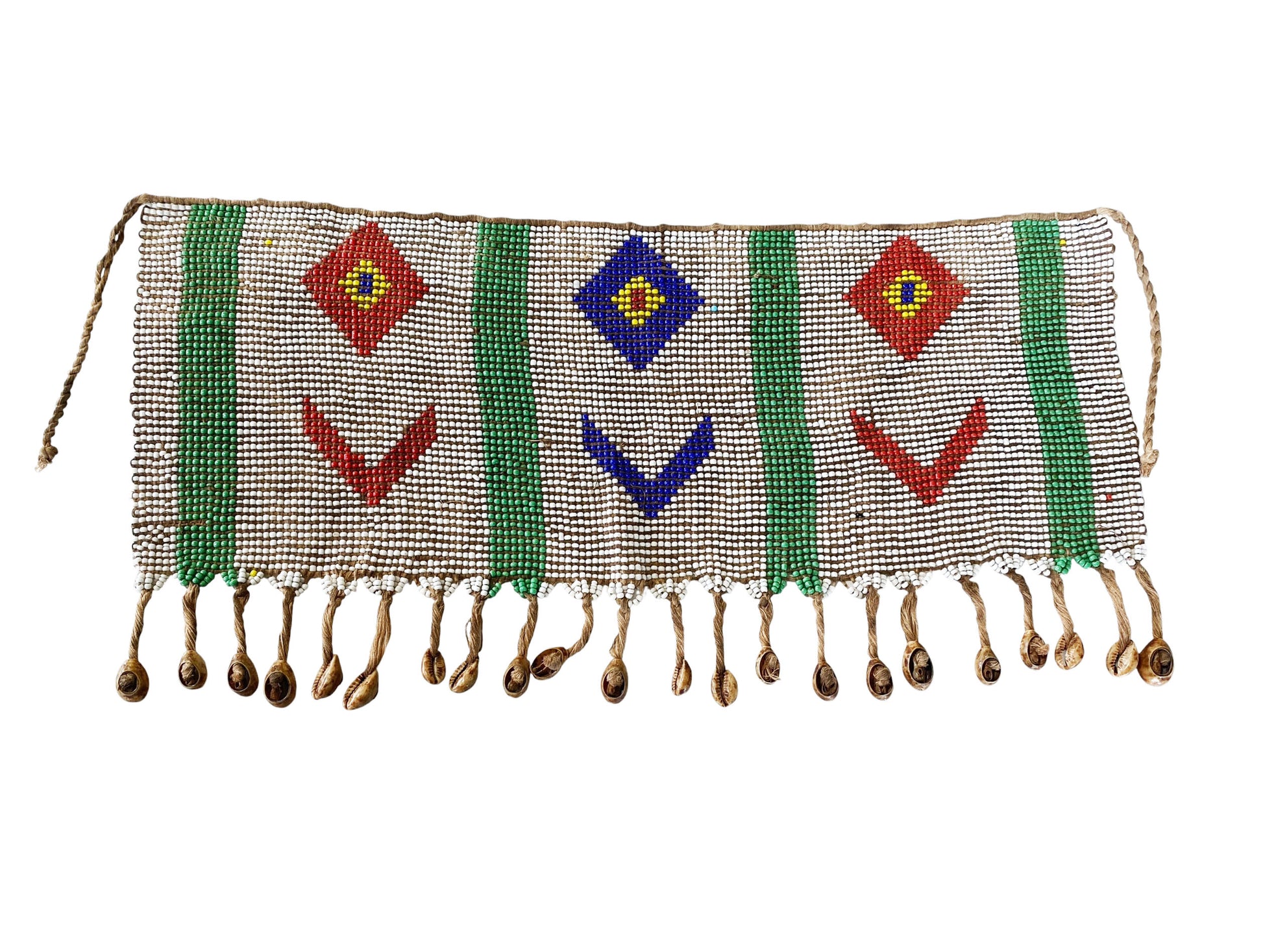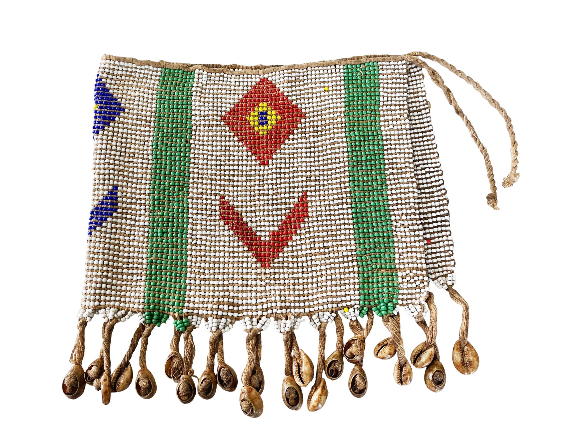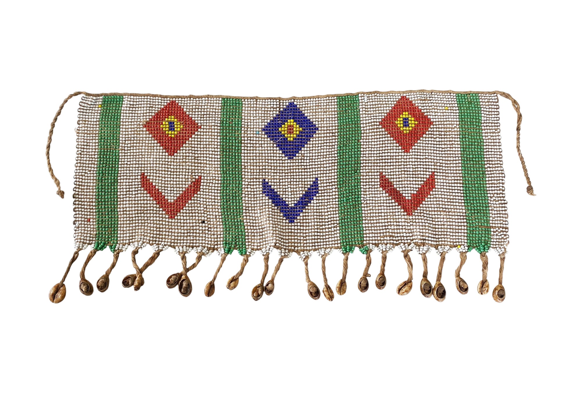 This exquisite skirt or apron is meticulously hand-beaded with vibrant colors, measuring 18" wide by 9" high. Among certain Cameroonian communities, women traditionally wore pubic aprons, known as 'caches sexes'—meaning 'to hide the sex'—until around 1961, when laws mandated full clothing. Despite this, the custom endures through elaborately beaded versions still worn today. In the Mandara mountains region, Matakam women crafted these aprons from small iron strips secured by fiber belts, reflecting a rich cultural heritage.