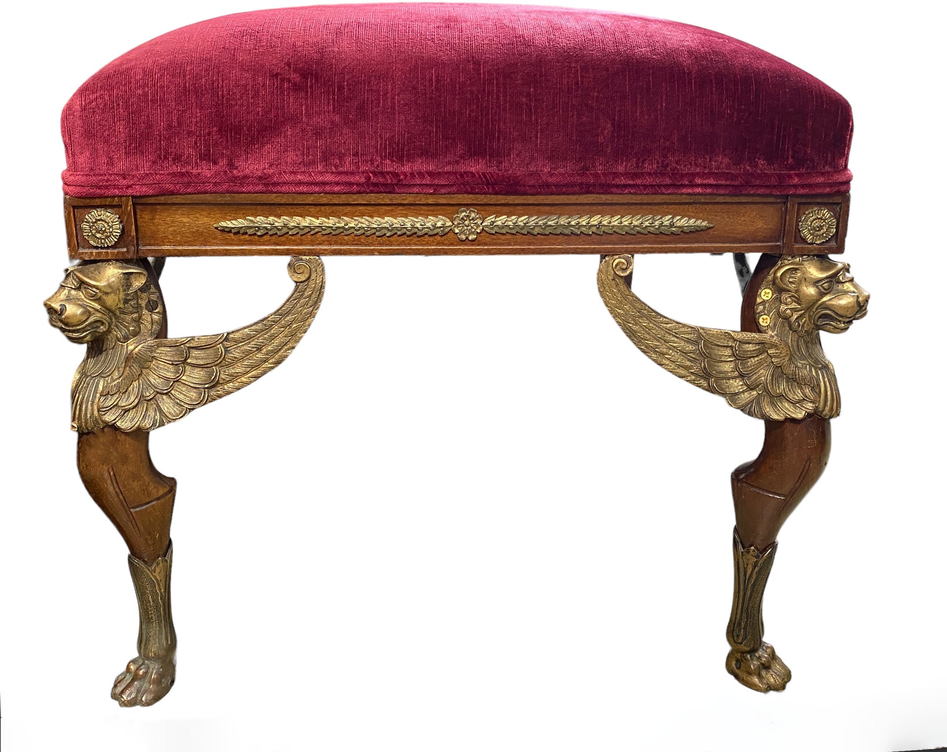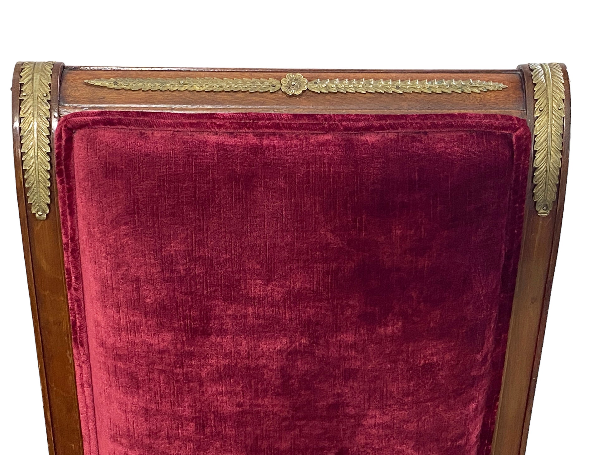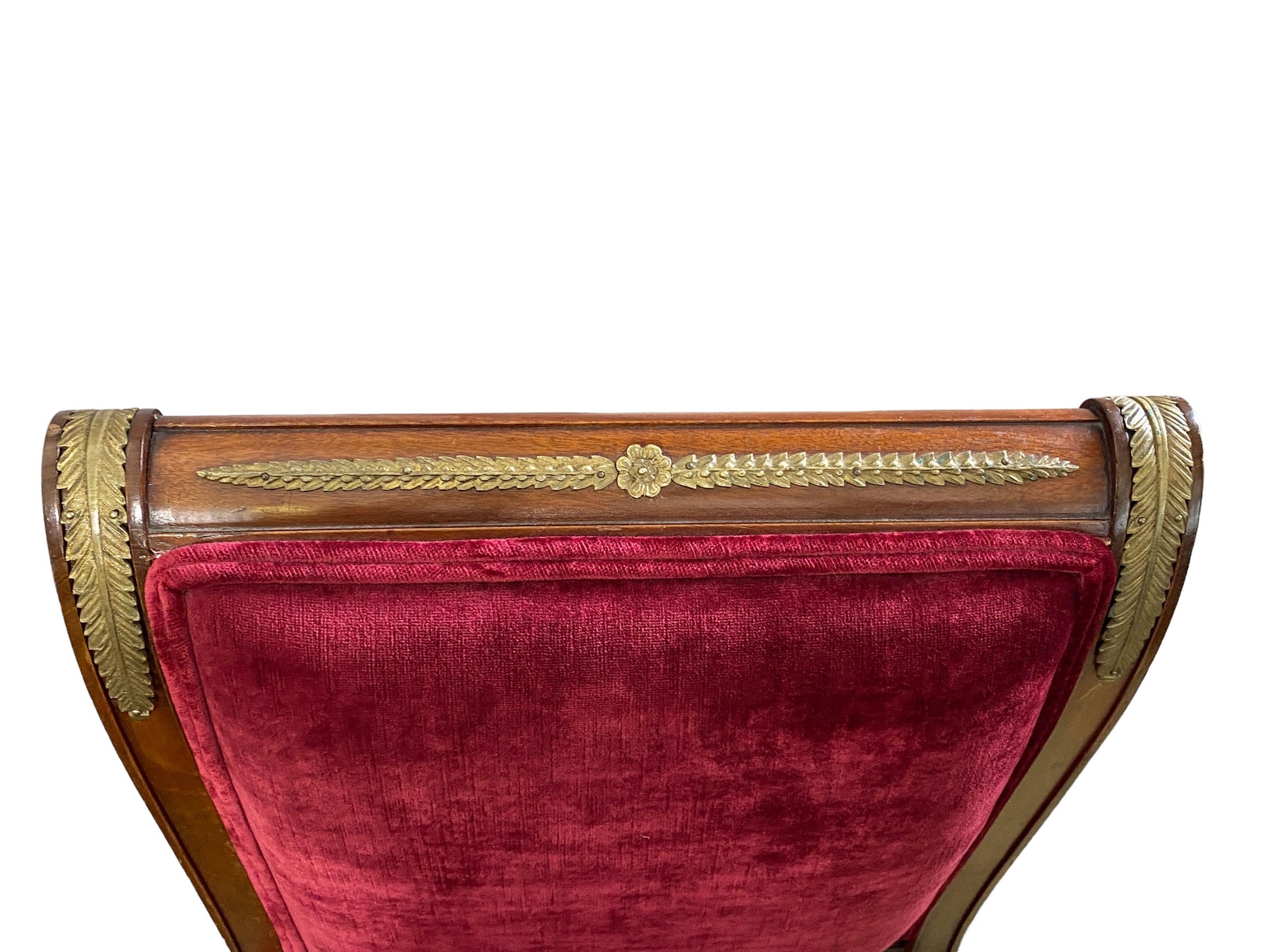 Dating back to the Late 19th century ,This rare and tasteful French Empire or Napoleon III style mahogany chair is characterized by the bronze mounts in the shape of winged lions and feet, atop a lavish red velvet upholstery showcasing some flaw spots. this piece is in overall very good condition.