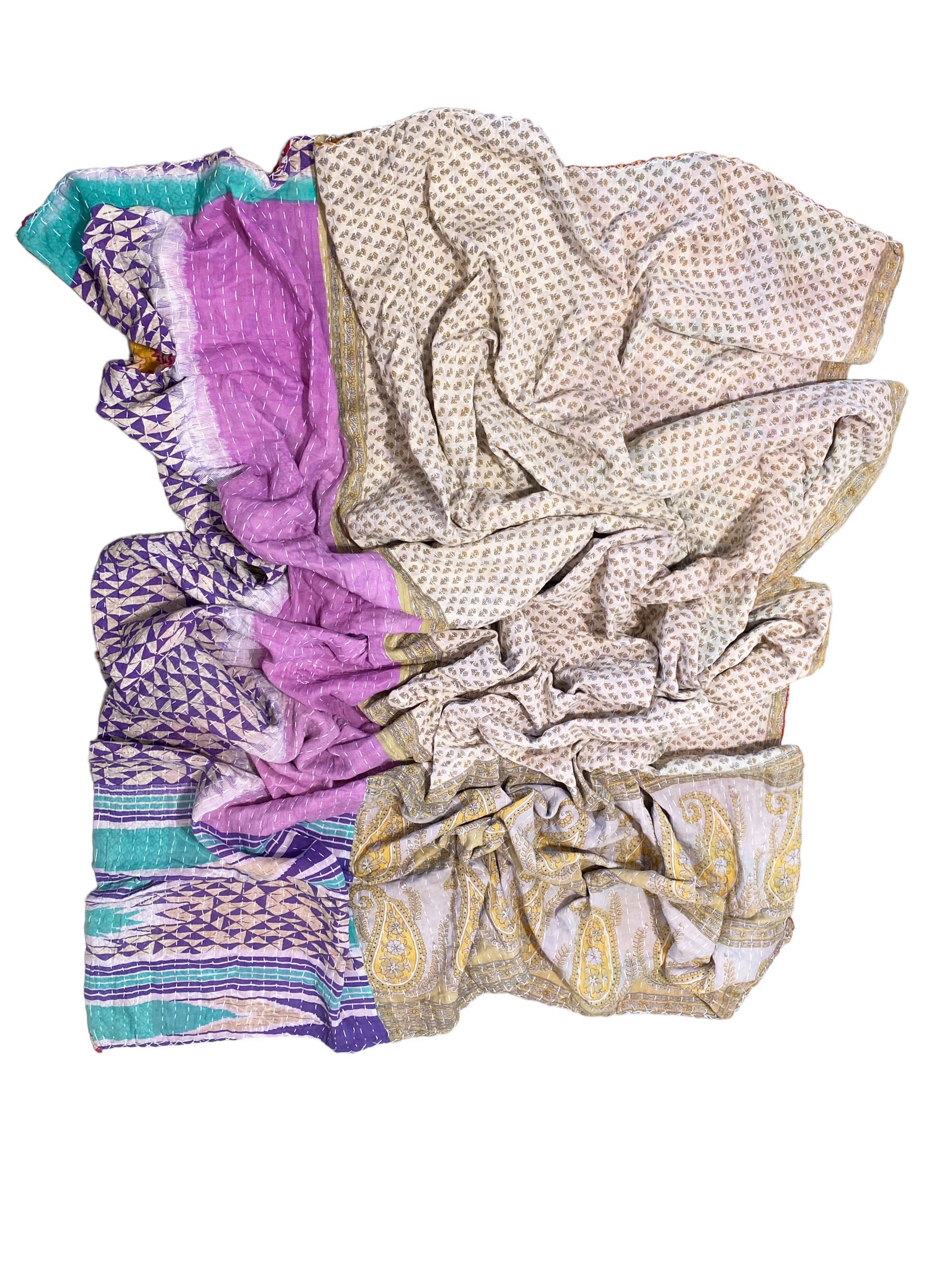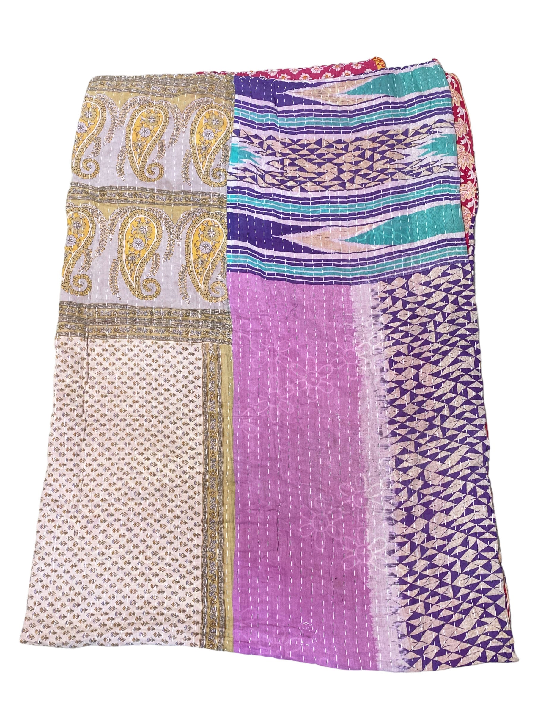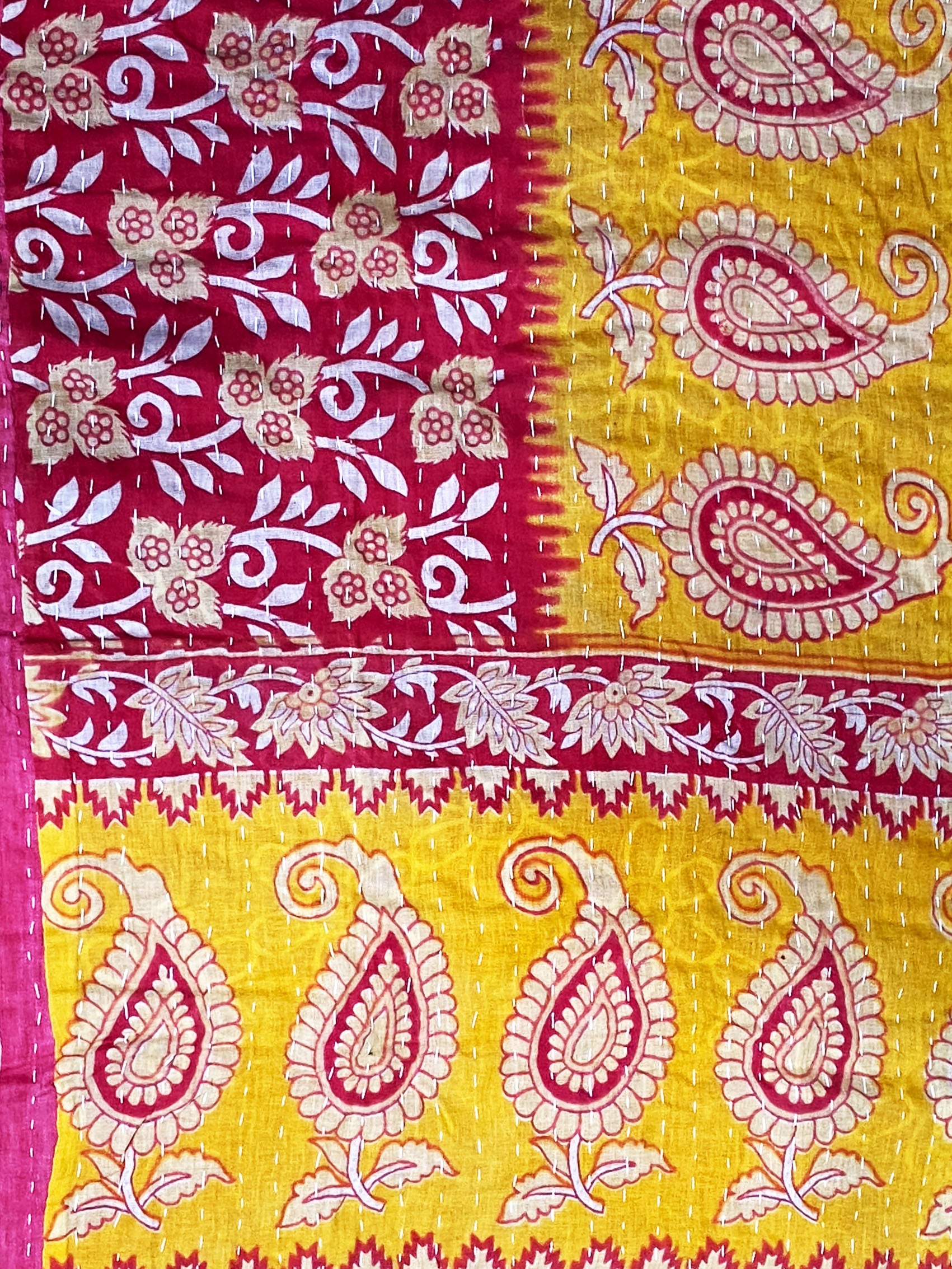 This 83" by 52" W Vintage Throw Kantha Quilt is crafted from 100% Old Cotton Recycled Fabric with two layers of sarees stitched together with small, delicate Kantha stitches. These quilts are hand quilted by artisans in India and feature unique, warm colors, designs, and patterns on either side. This reversible quilt is made with enough strength and durability for hand washing, and the a multitude of straight stitches give it a one-of-a-kind lookPresents small spots and a patch due to its vintage, but remains in excellent condition overall.
