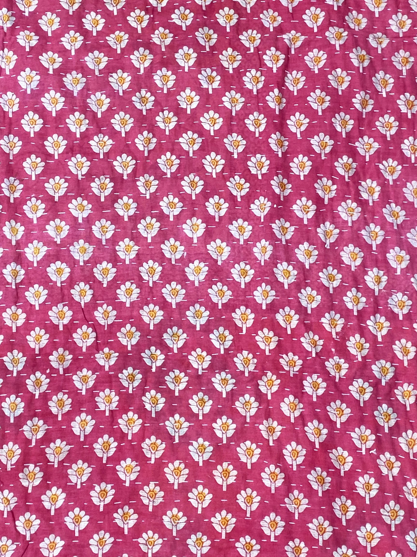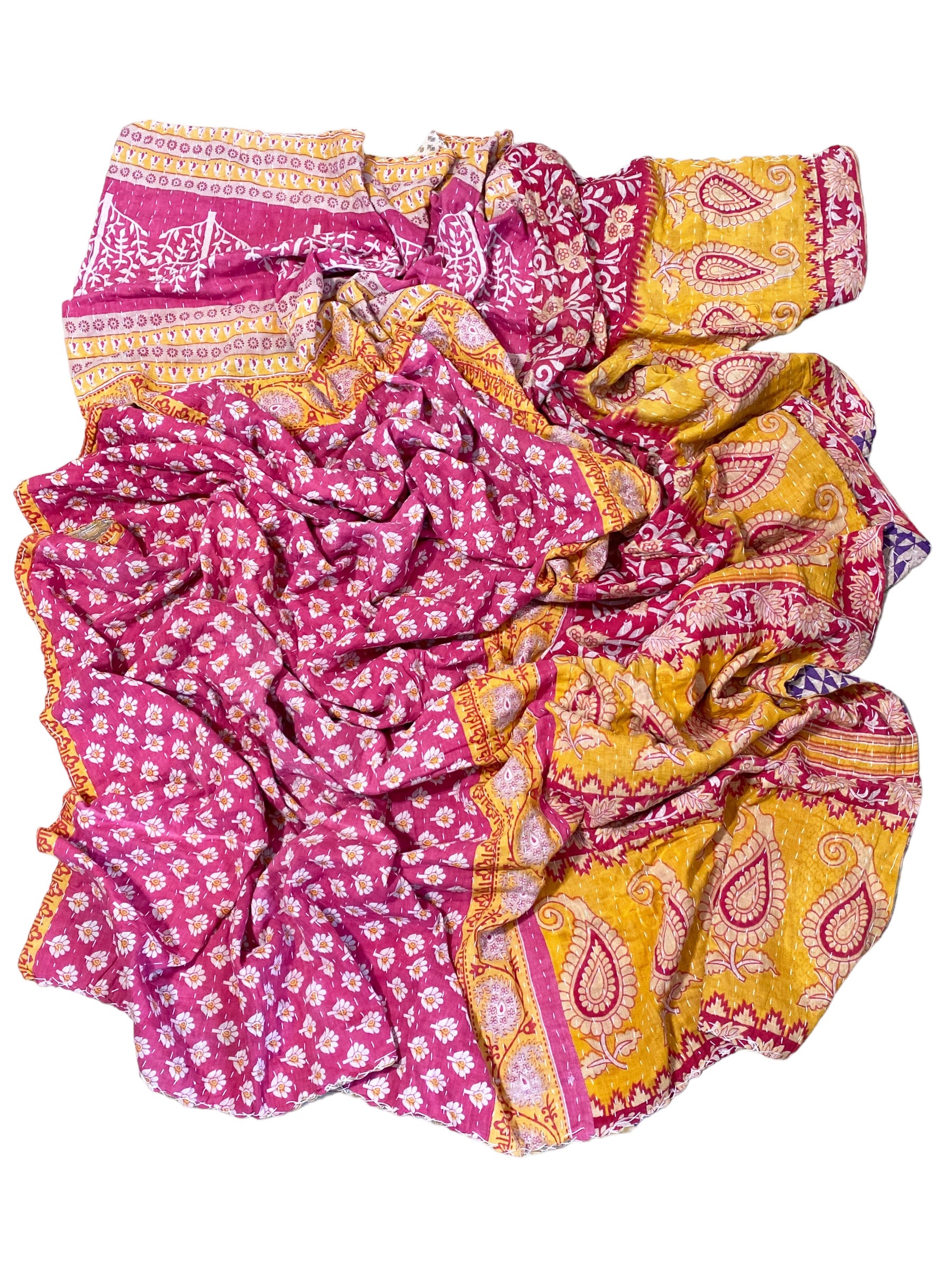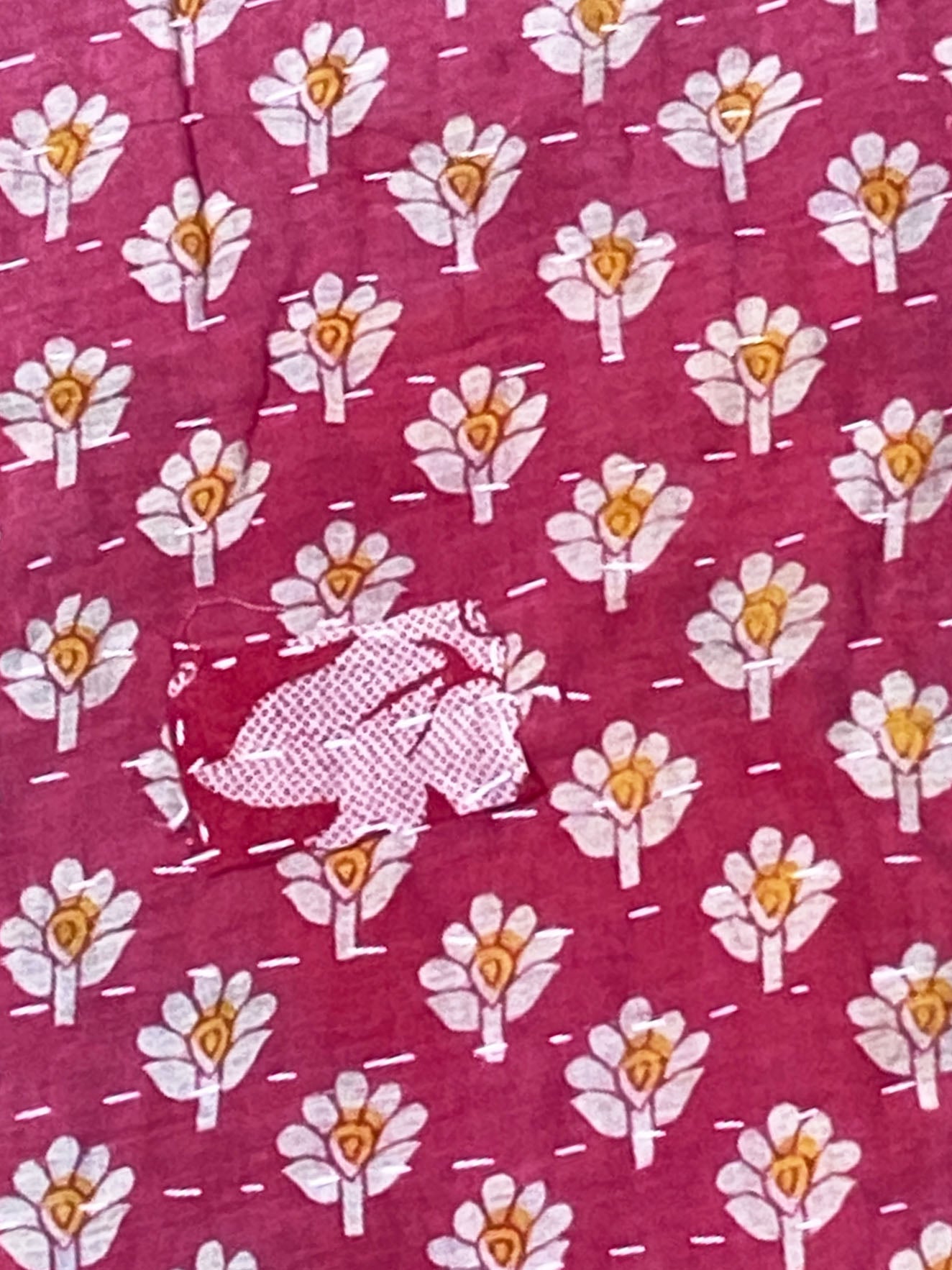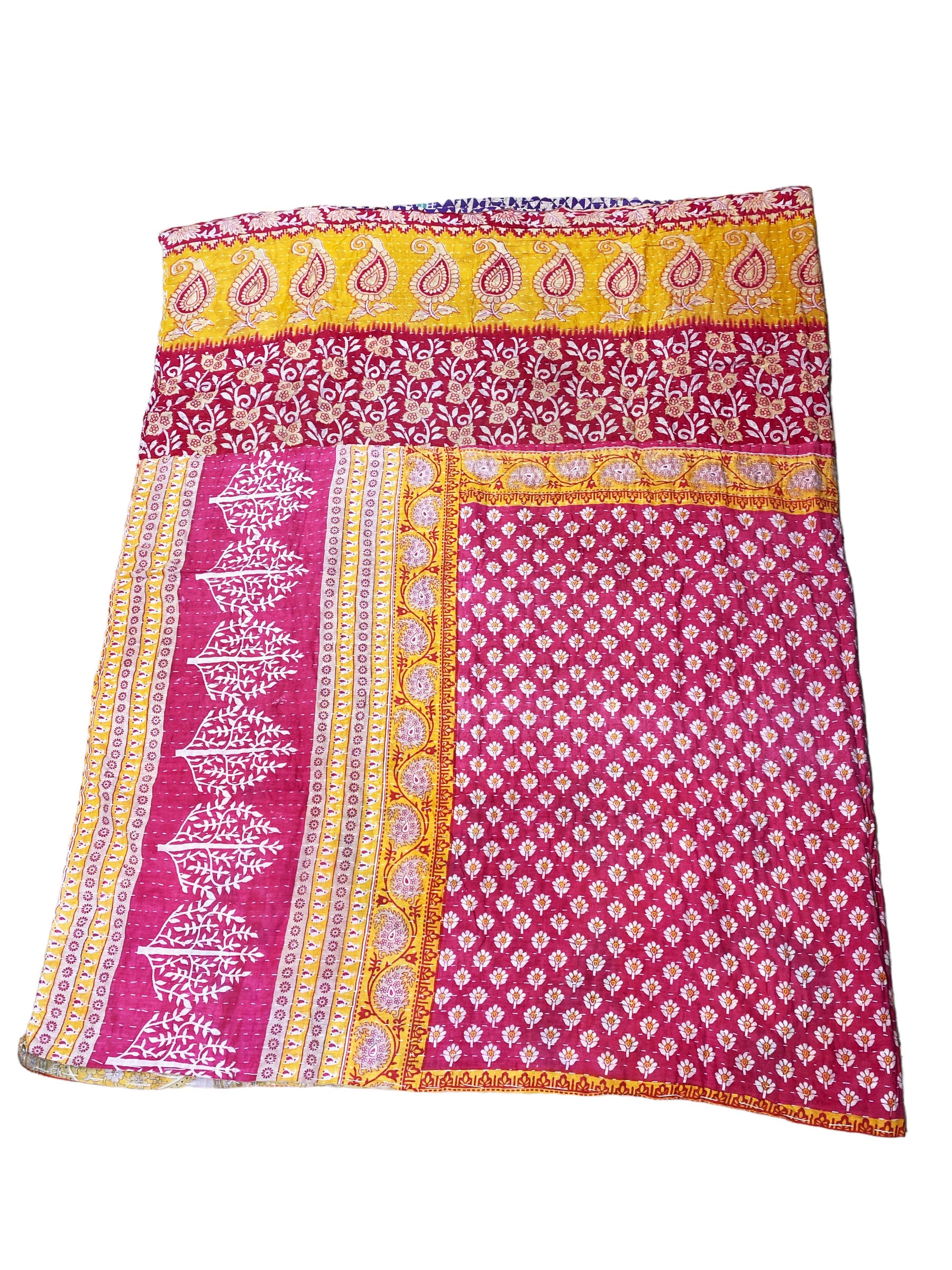 This 83" by 52" W Vintage Throw Kantha Quilt is crafted from 100% Old Cotton Recycled Fabric with two layers of sarees stitched together with small, delicate Kantha stitches. These quilts are hand quilted by artisans in India and feature unique, warm colors, designs, and patterns on either side. This reversible quilt is made with enough strength and durability for hand washing, and the a multitude of straight stitches give it a one-of-a-kind lookPresents small spots and a patch due to its vintage, but remains in excellent condition overall.