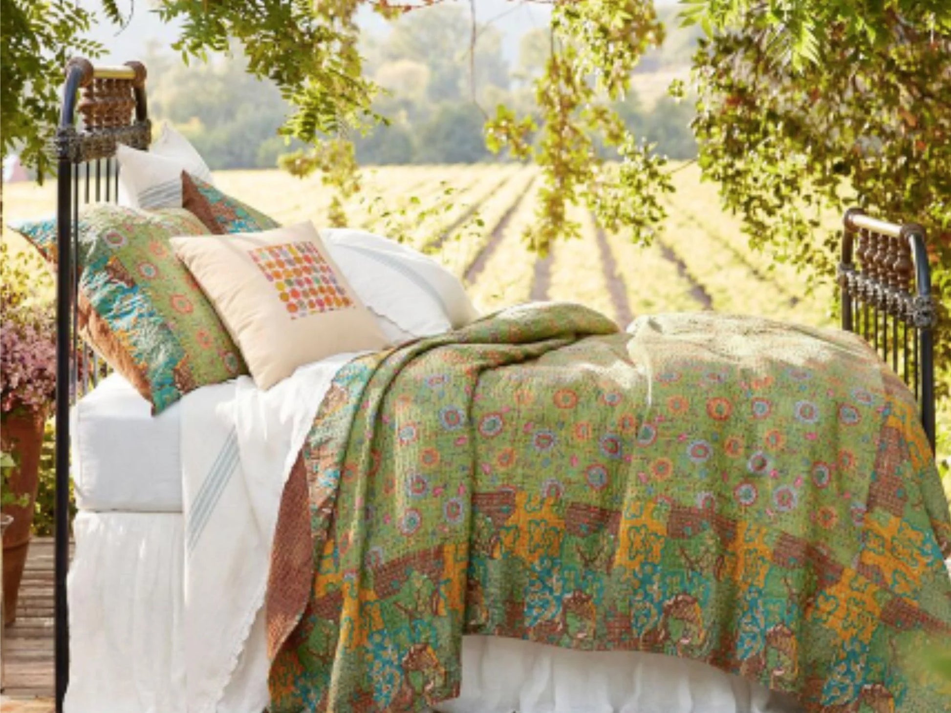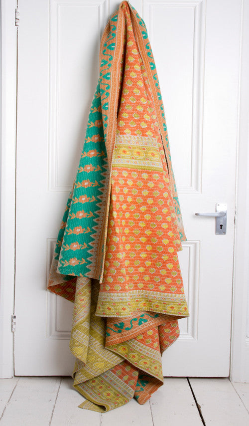 This 83" by 53" W Vintage Throw Kantha Quilt is crafted from 100% Old Cotton Recycled Fabric with two layers of sarees stitched together with small, delicate Kantha stitches. These quilts are hand quilted by artisans in India and feature unique, warm colors, designs, and patterns on either side. This reversible quilt is made with enough strength and durability for hand washing, and the a multitude of straight stitches give it a one-of-a-kind lookPresents small spots and a patch due to its vintage, but remains in excellent condition overall.