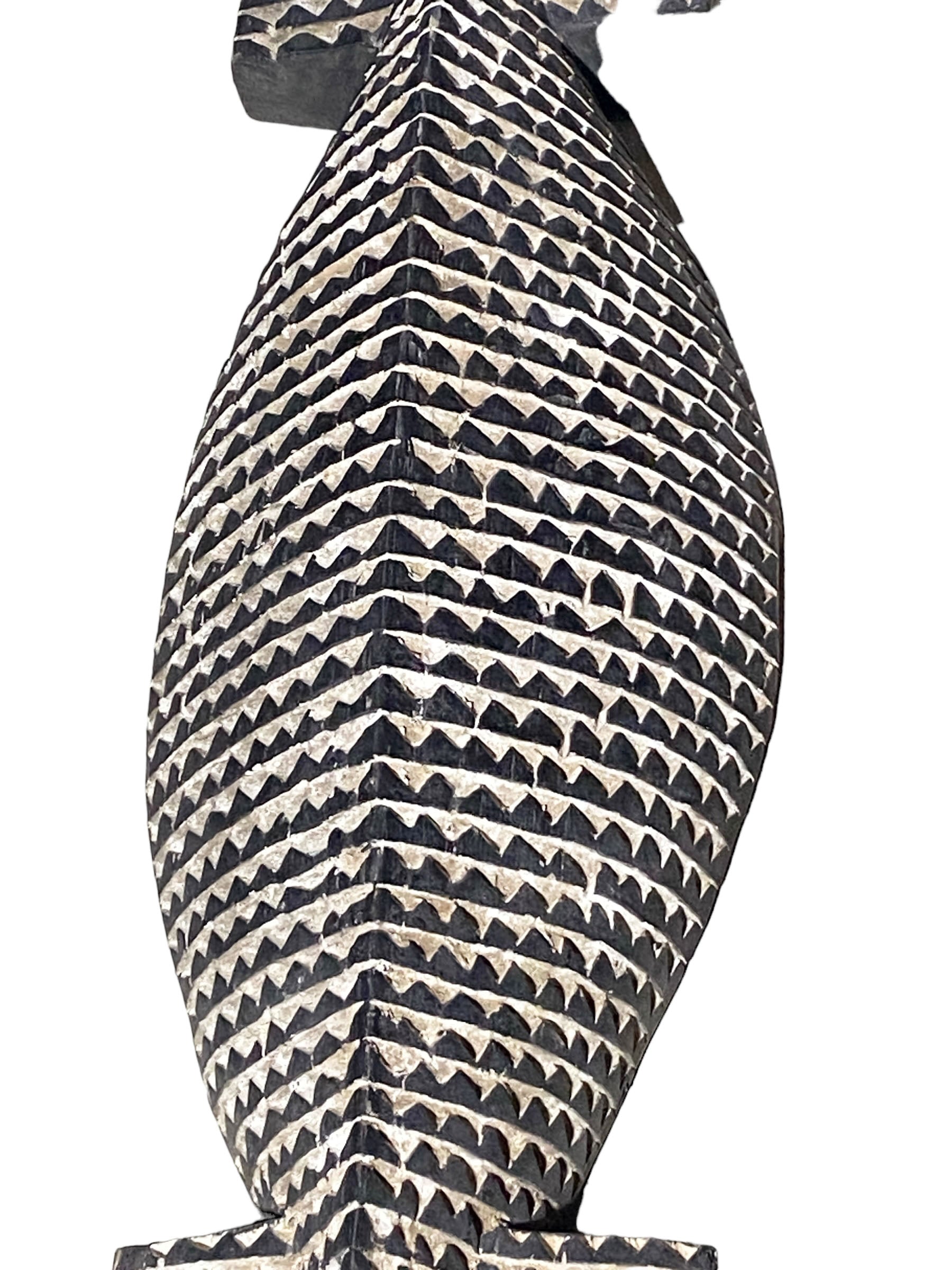 This remarkable life-size Bobo Nuna Crocodile is a product of the tribal people of Burkina Faso, measuring approximately 78"w by 12"D by 6"h . Carved from a single piece of wood, this animal-shaped mask is the iconic sculpted art form of these people. Attached to its black-and-white-checkered body is a long tail, legs, and a distinct snout, paying homage to the water spirit of fertility and prosperity. An ideal piece for any collection or home décor.Arrange local pick-up or schedule shipping through USHIP for convenience.