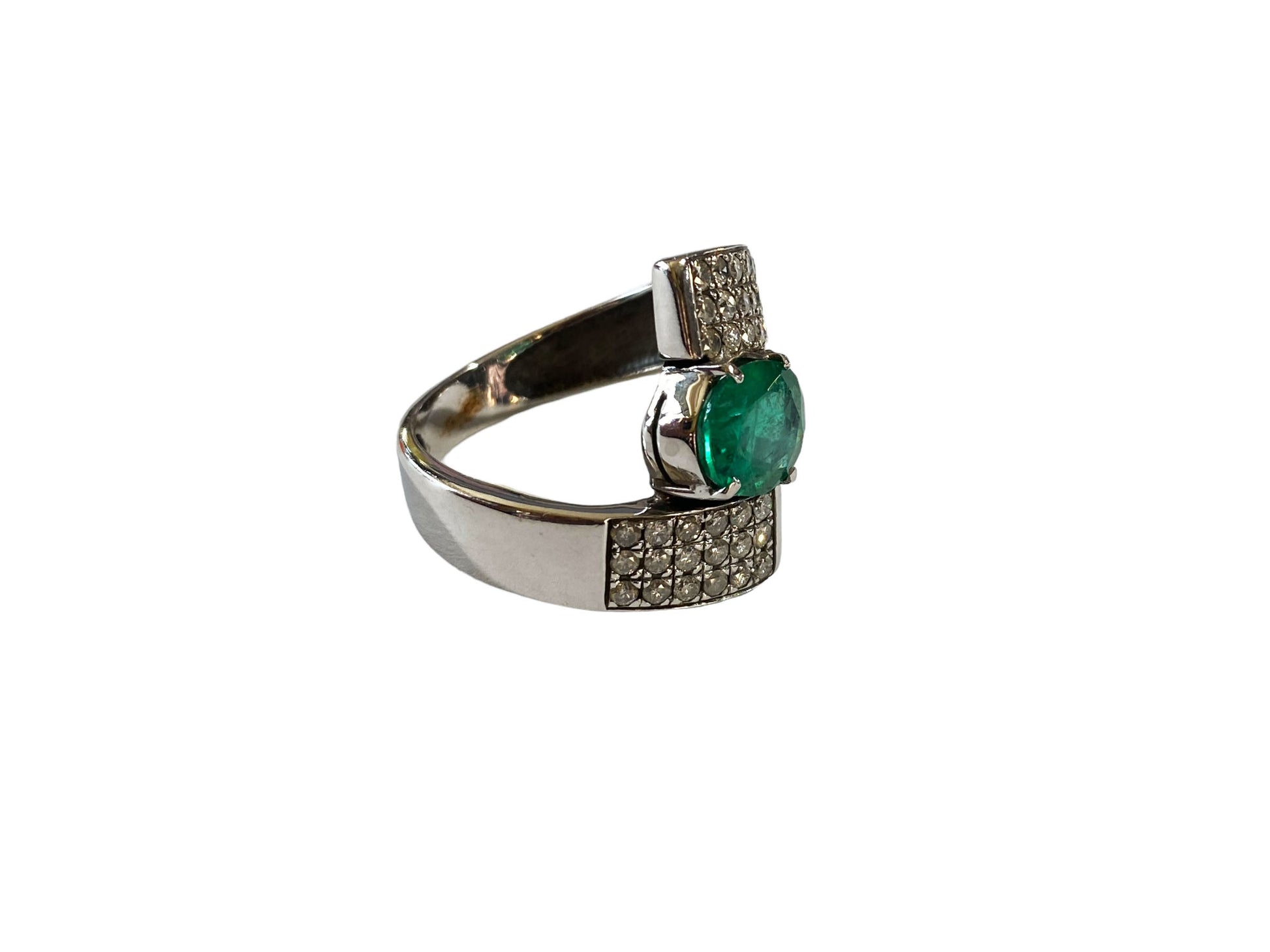 Superb and elegant Colombian Emerald and Diamond Ring 18k white gold by pass mounting with 4.5 to 6.5 flared mm shanking finger size 9 center 4 prong set with oval emerald 9.9 by 7.8 by 4.70 mm approximately 1.97 carats ,Shank pave set with 36 full cut 1.7mm 02 point diamond H/SL gold weight 4.9 dwt/7.61 grams ,1" H by 1" w by 0.50" D