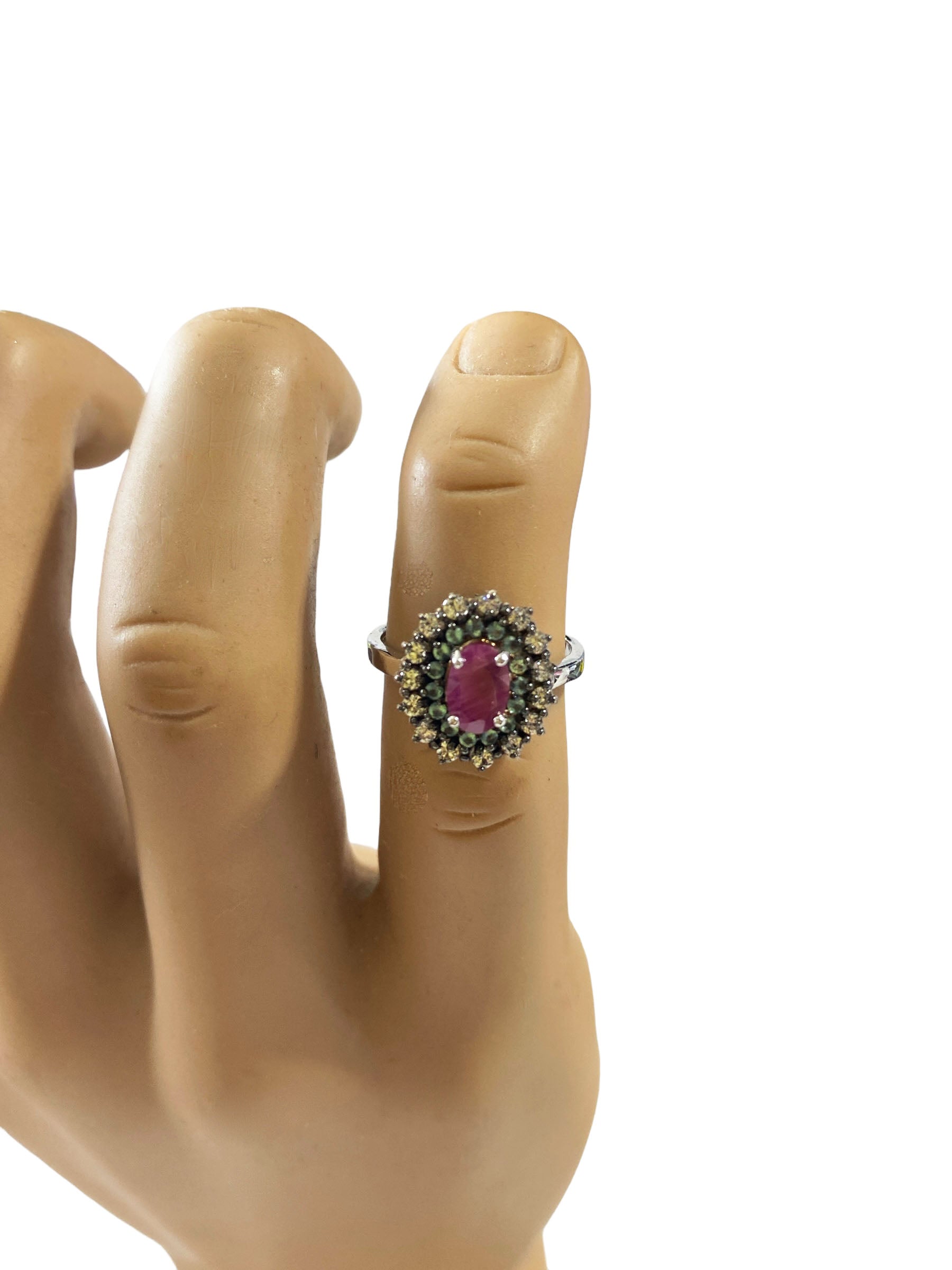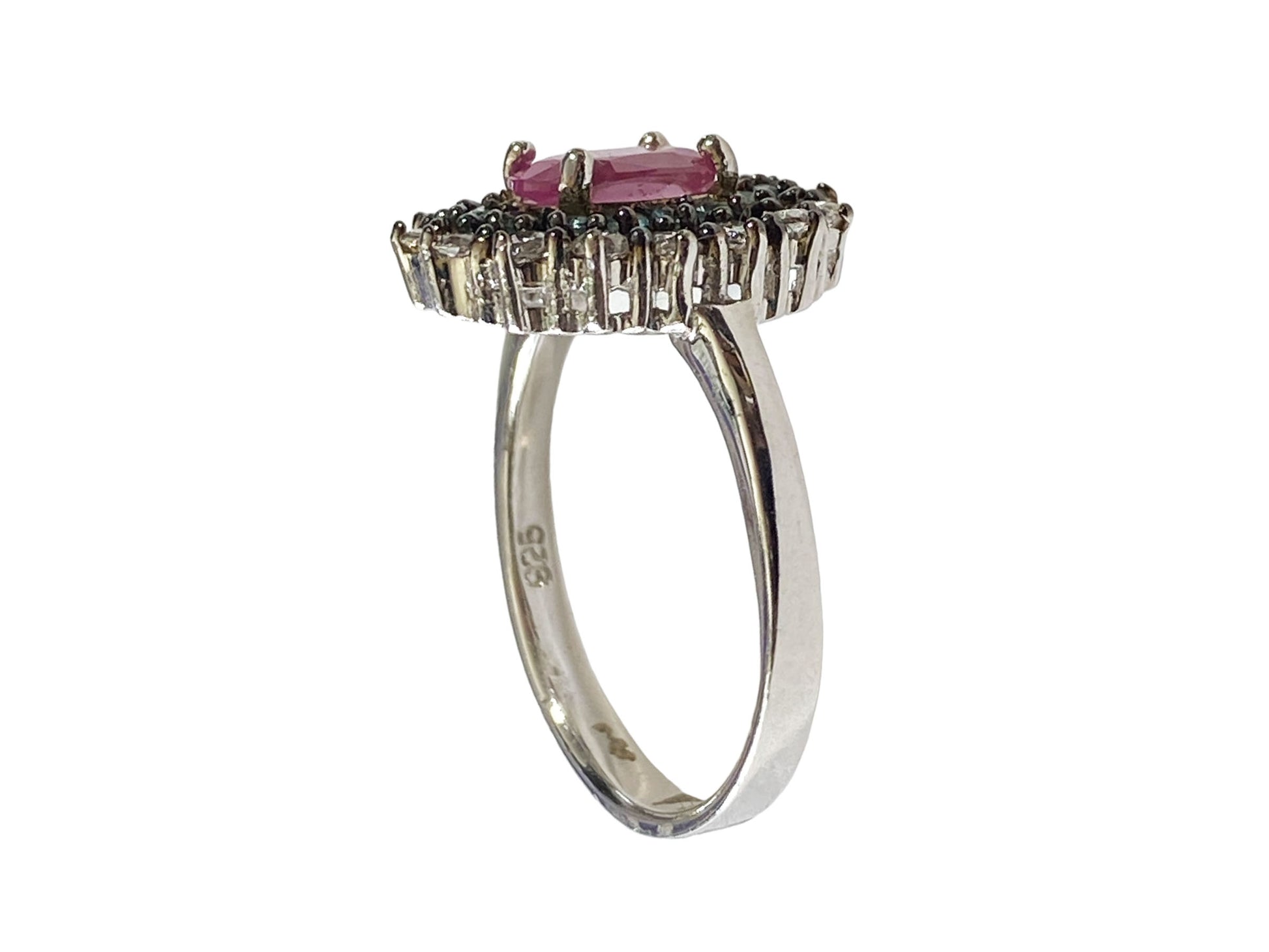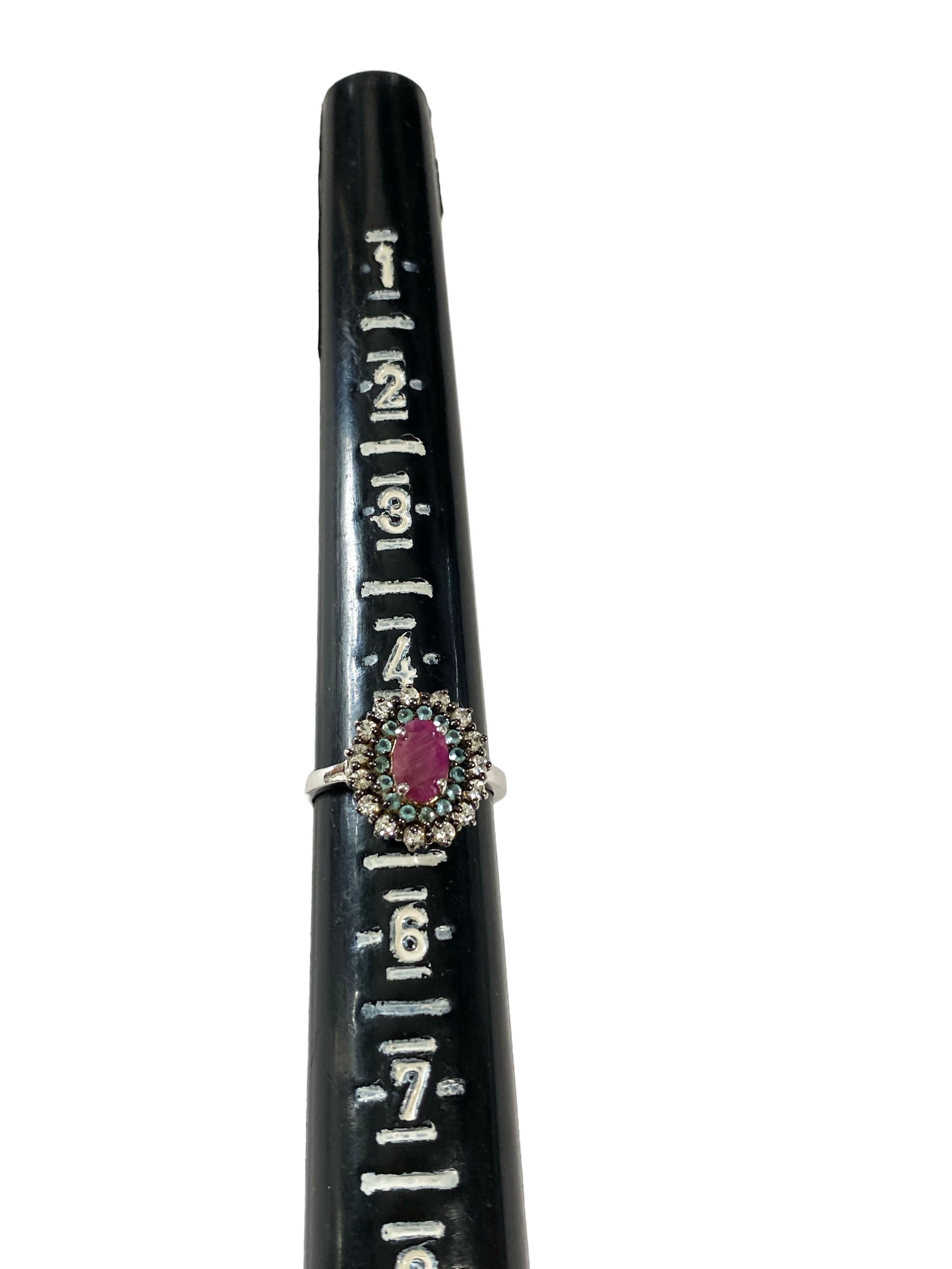 This elegant sterling silver ring size 5 is embellished with an oval Rubi and semi-precious round stones Aquamarine, along with sparkling glass diamonds. It is marked with the quality stamp "925" and can be easily adjusted to fit