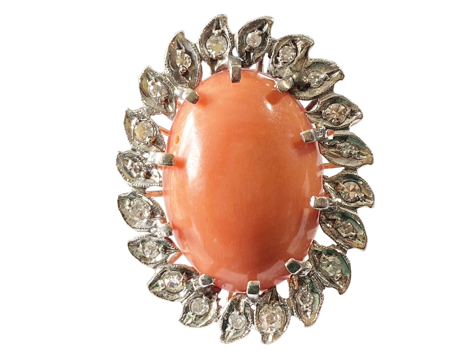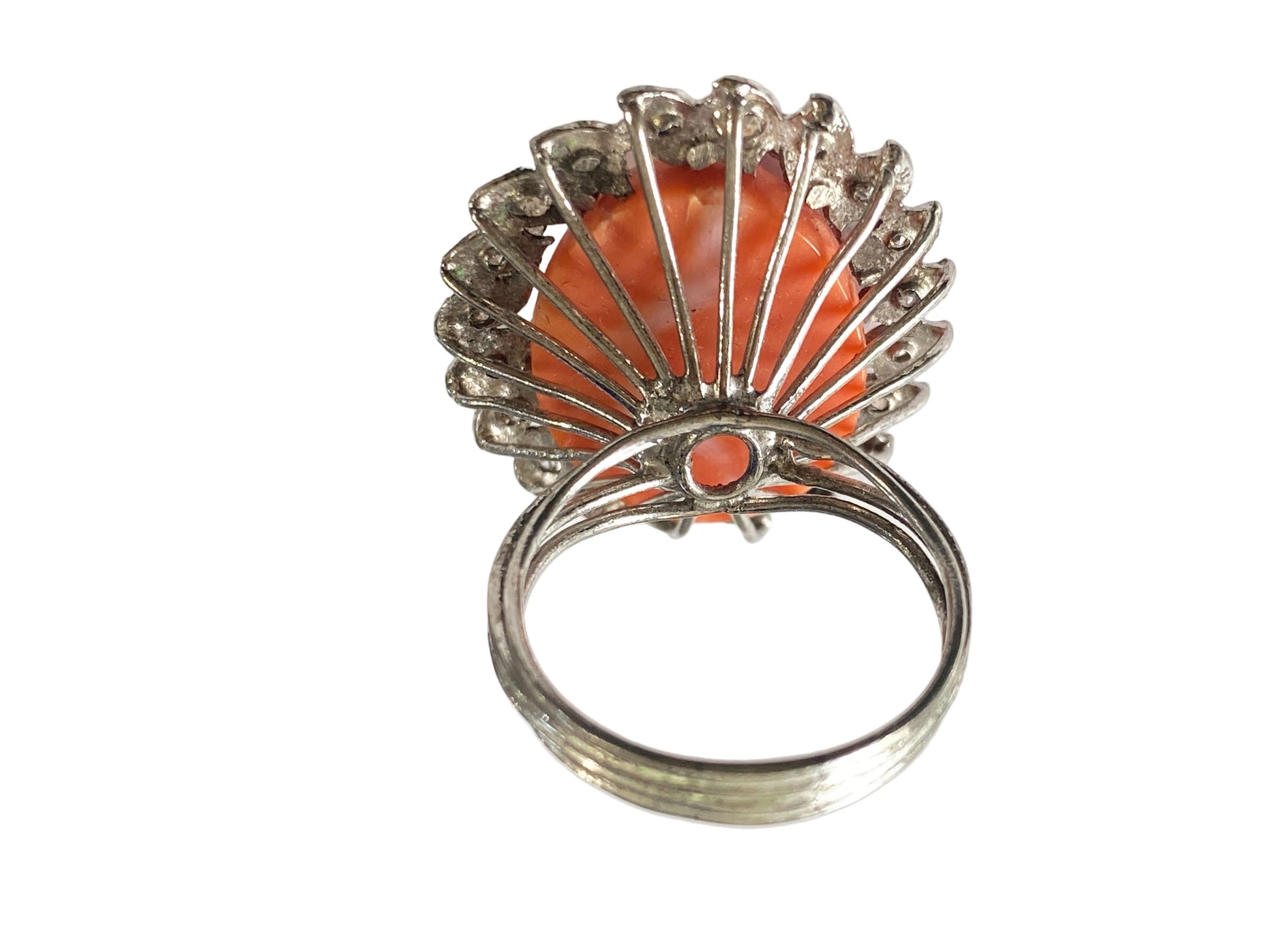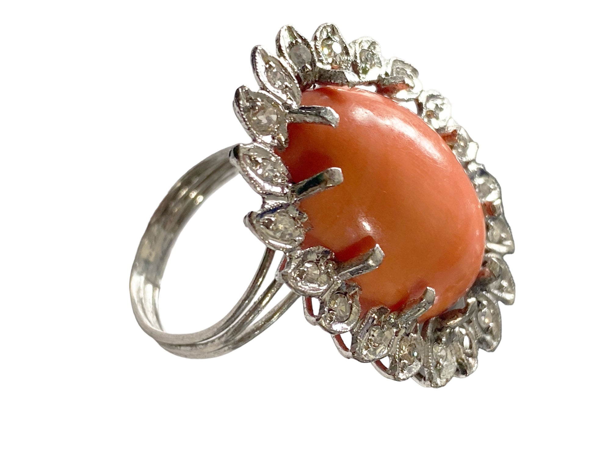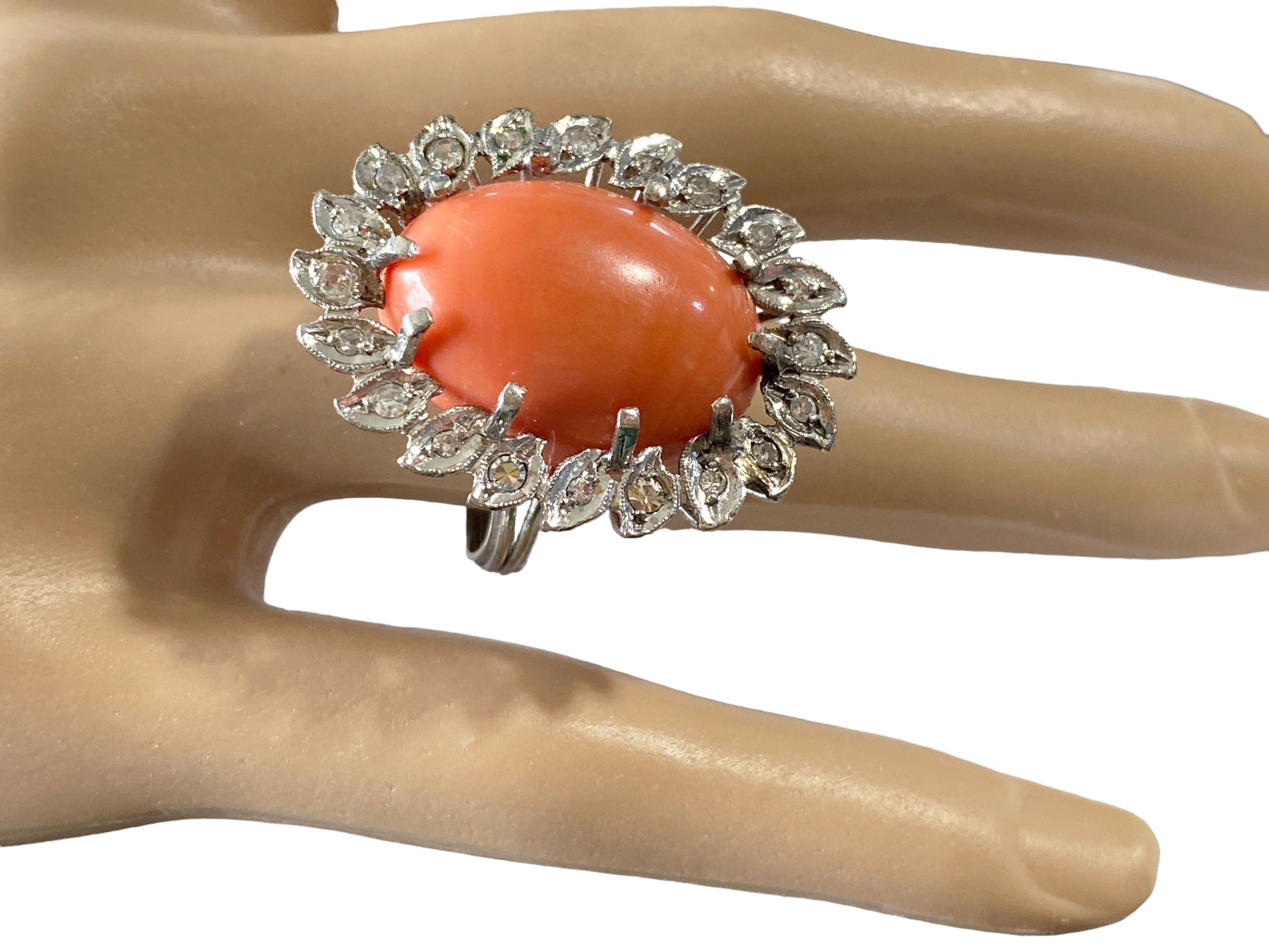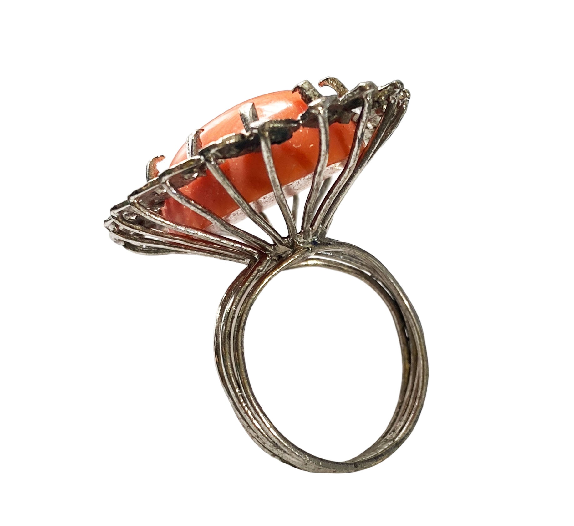 #7287 Retro Red Coral and Diamond Ring 14K White Gold ,Size 8.25
