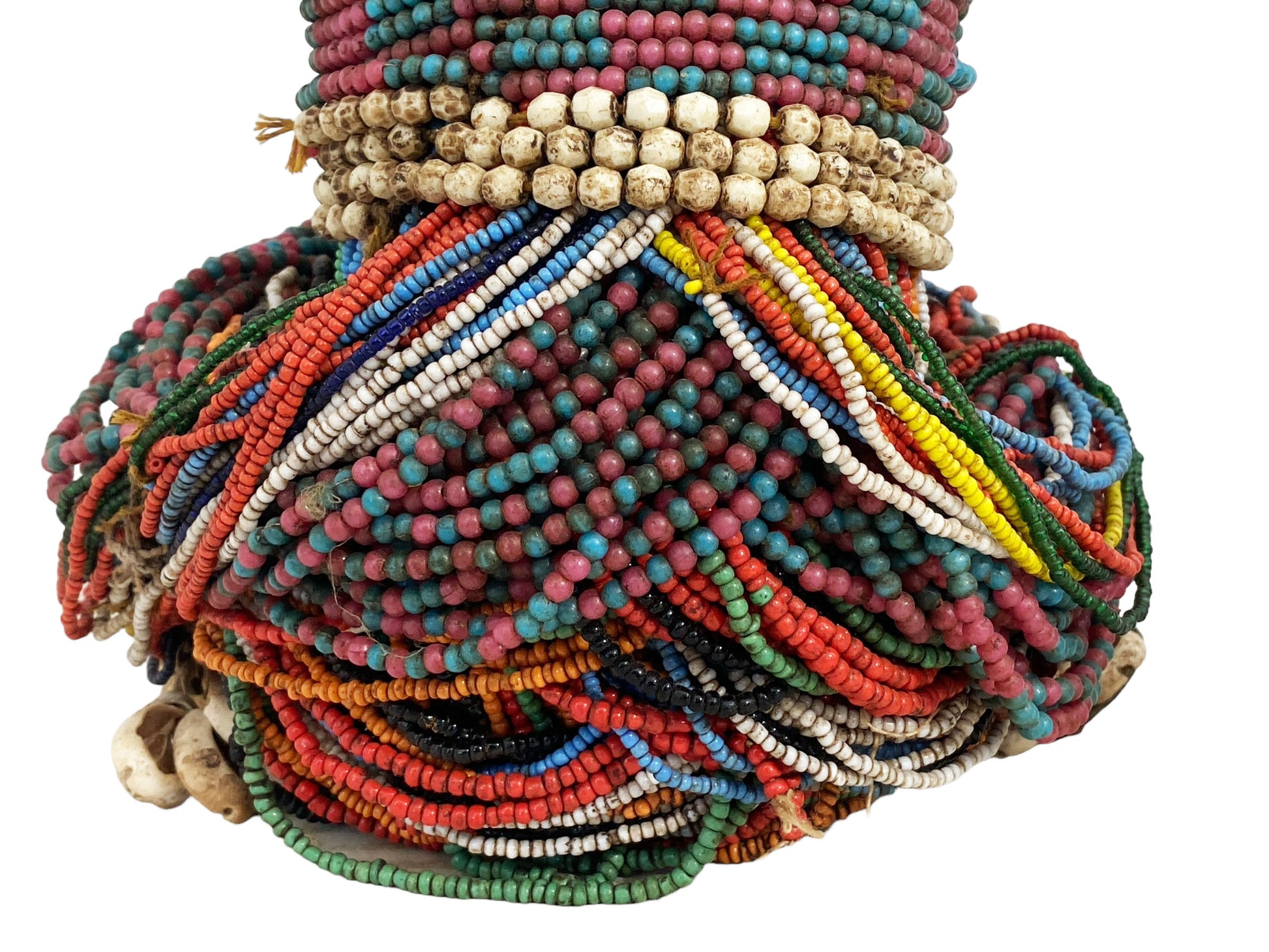 Superb large African Fali fertility doll decorated with multiple layers of trade glass beads and cowrie shells, minor beads and shells loss.