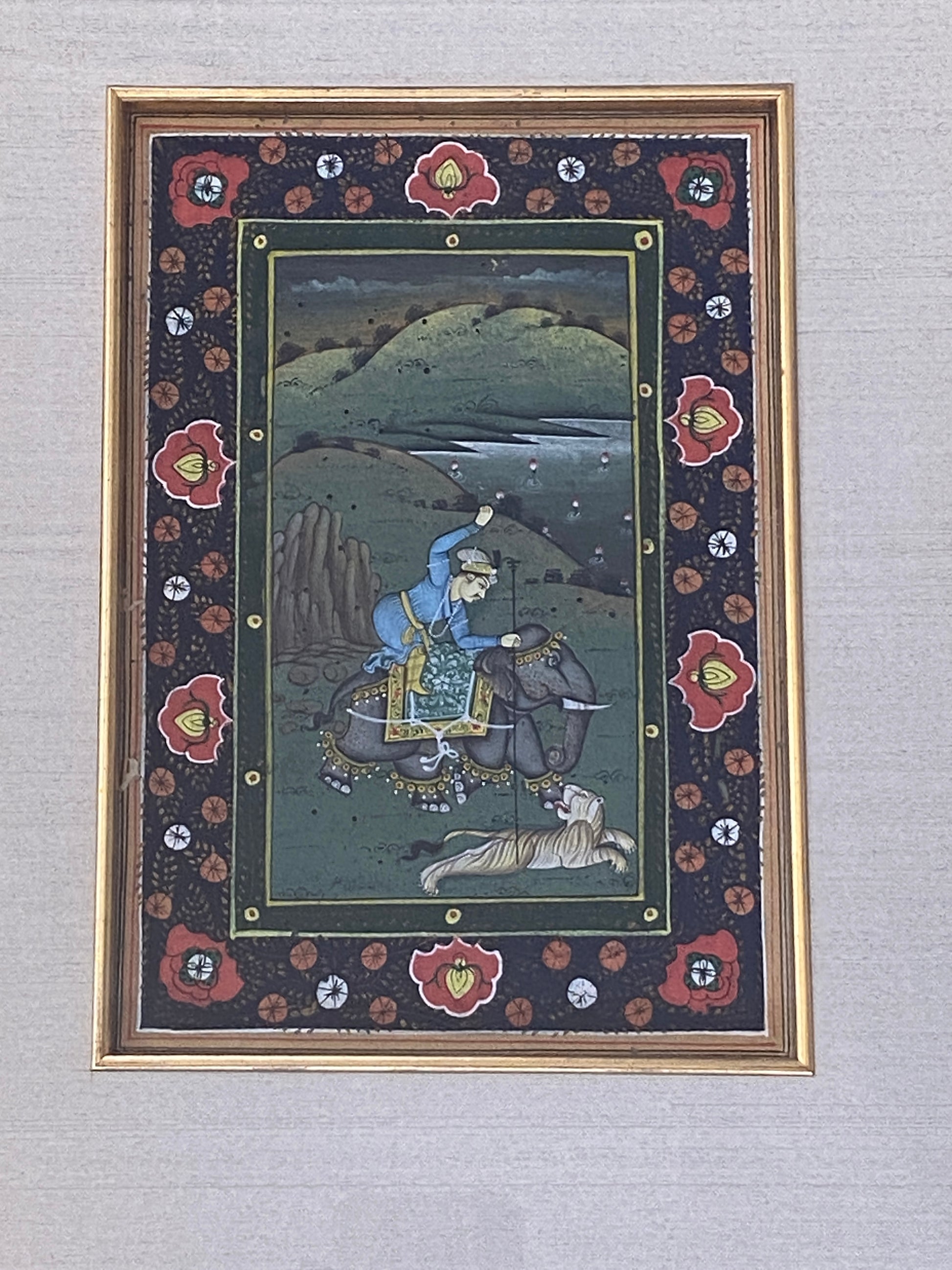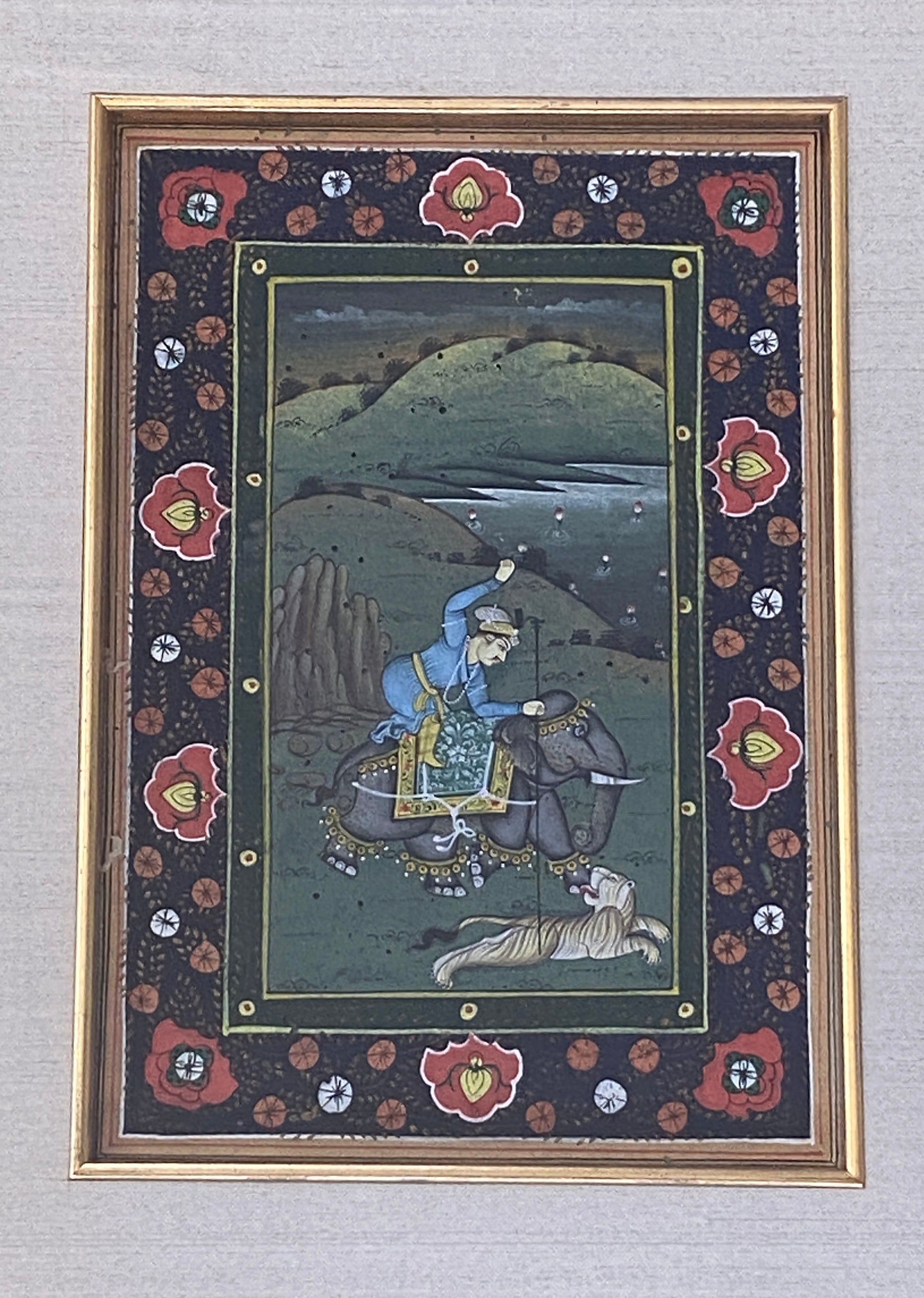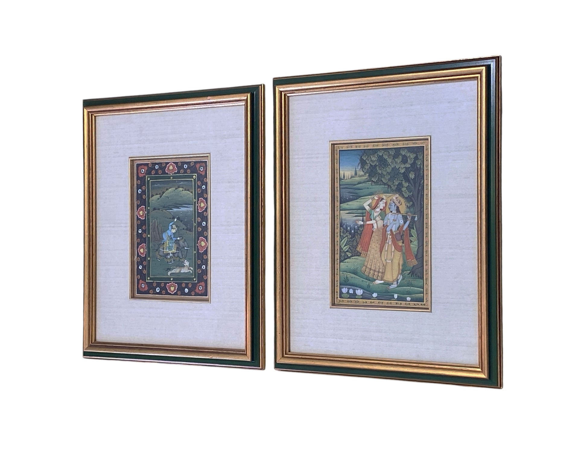 This remarkable set of miniature paintings illustrates a Mughal hunter atop an elephant alongside a courting couple, showcasing intricate craftsmanship that embodies the richness of Indian artistic tradition and the artist's skill. Created using gouache, these works are meticulously detailed and housed in refined gold and green frames from Hong Kong, making them an elegant addition to any sophisticated art collection. Dimensions: 15.75" H x 13.25" W x 1" D and 16" H x 13.25" W x 1" D.