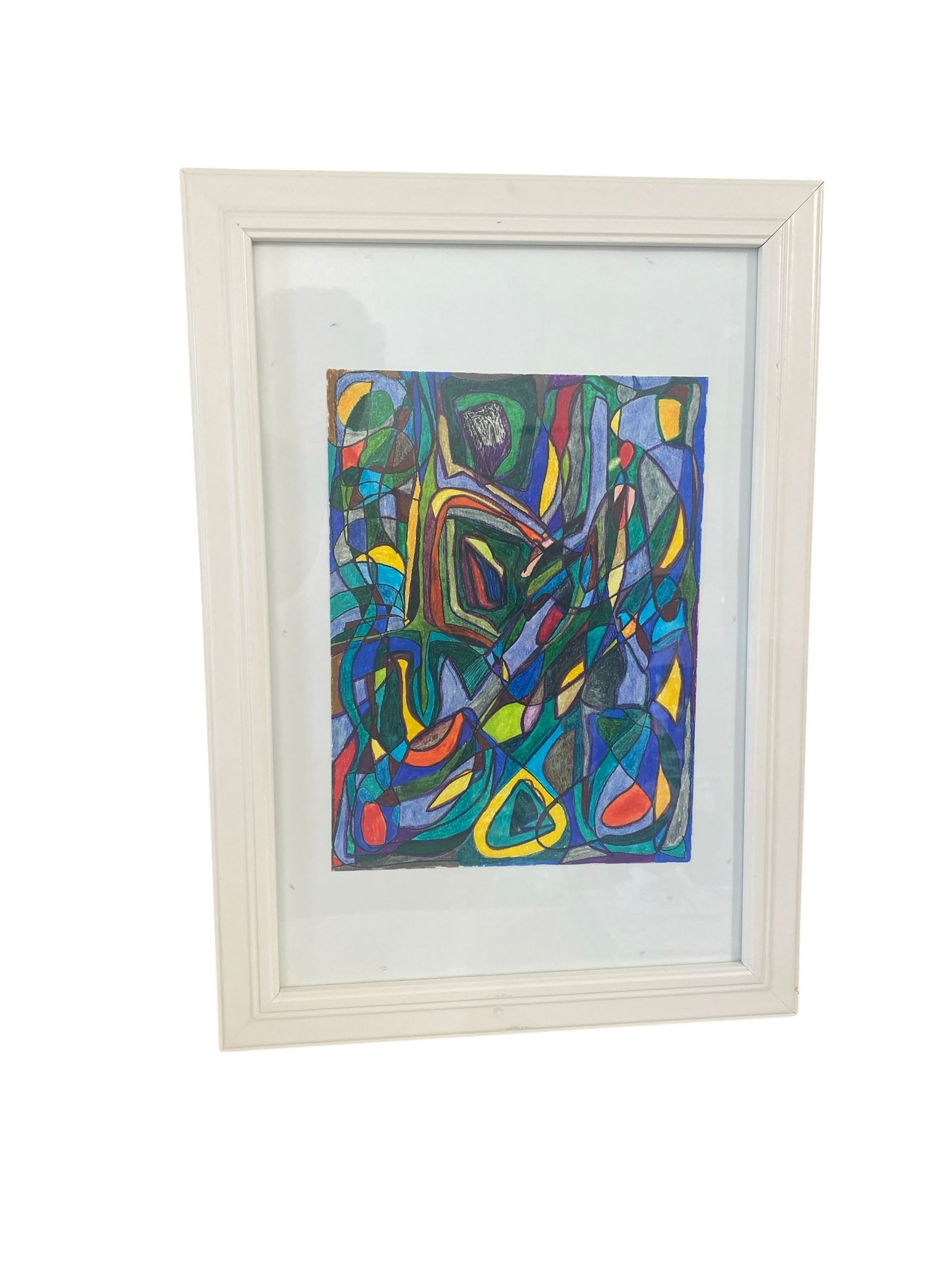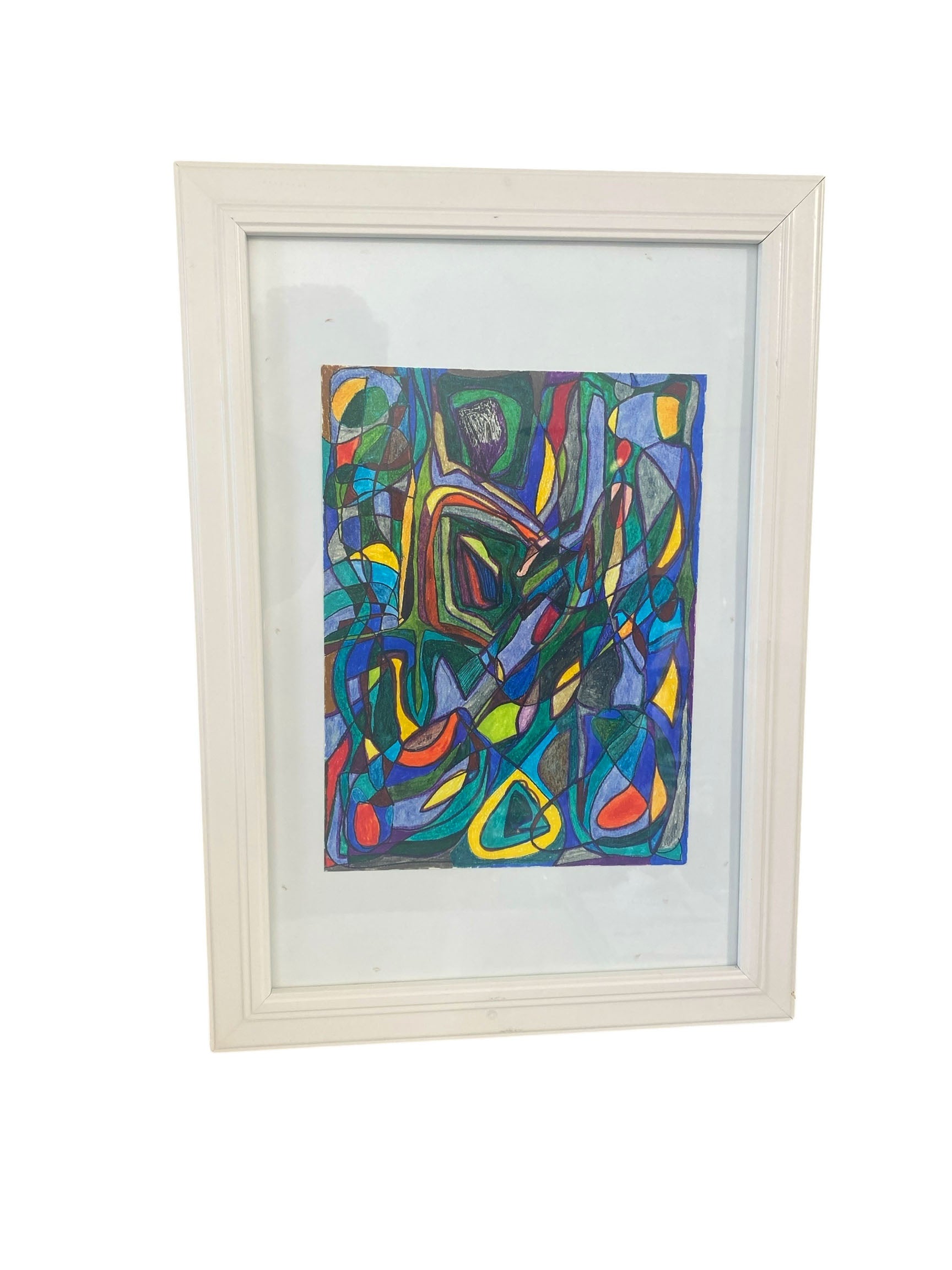 Felt Pens on paper abstract painting, measures 20.75" x 14.75" x 0.75" including the frame and is part of artist Yvonne Jean Rabie's (YJR) collection. titled Mosai window Signed on the back, and dated 2020 it captures the varied qualities of light filtering through Mosaic windows.