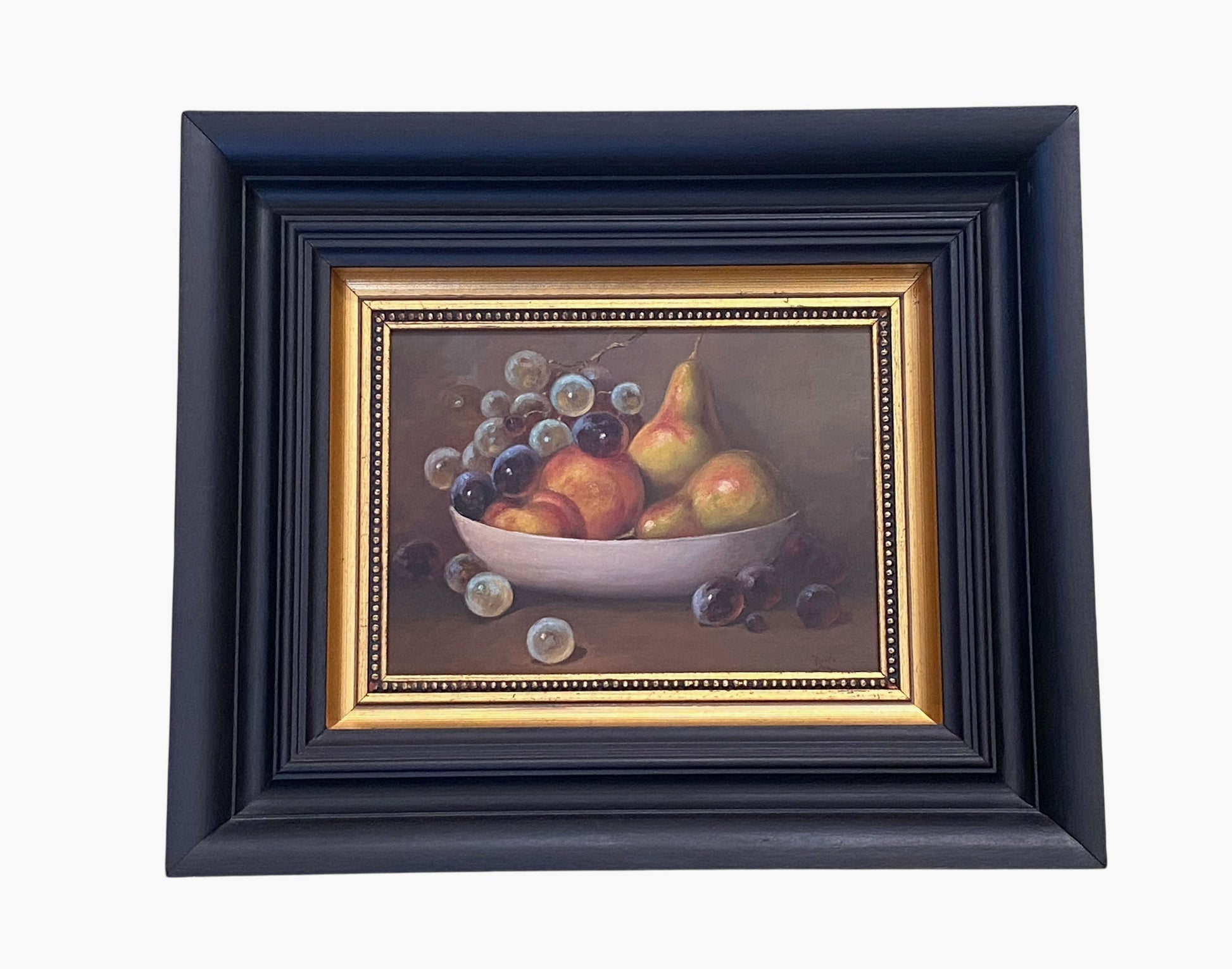 This exceptional vintage oil on wood still life features an arrangement of assorted fruits in a bowl, signed with a distinctive monogram. The framed artwork measures 16" wide by 13.5" high and has a depth of 2".
