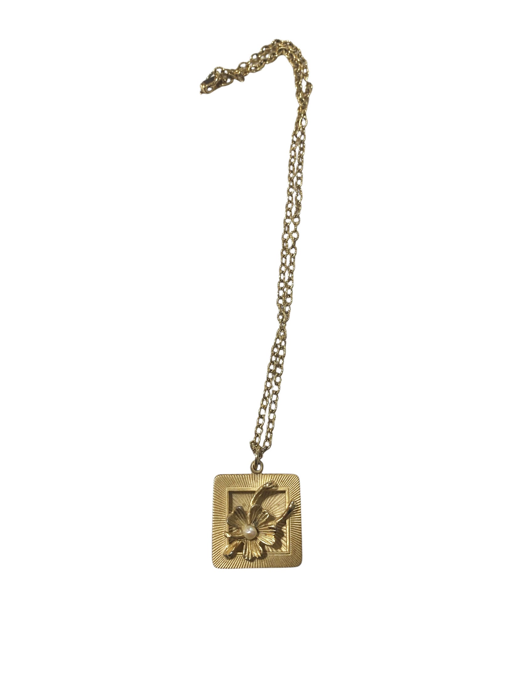 #88 Vintage Gold Tone Square Pendant and Chain With Flower