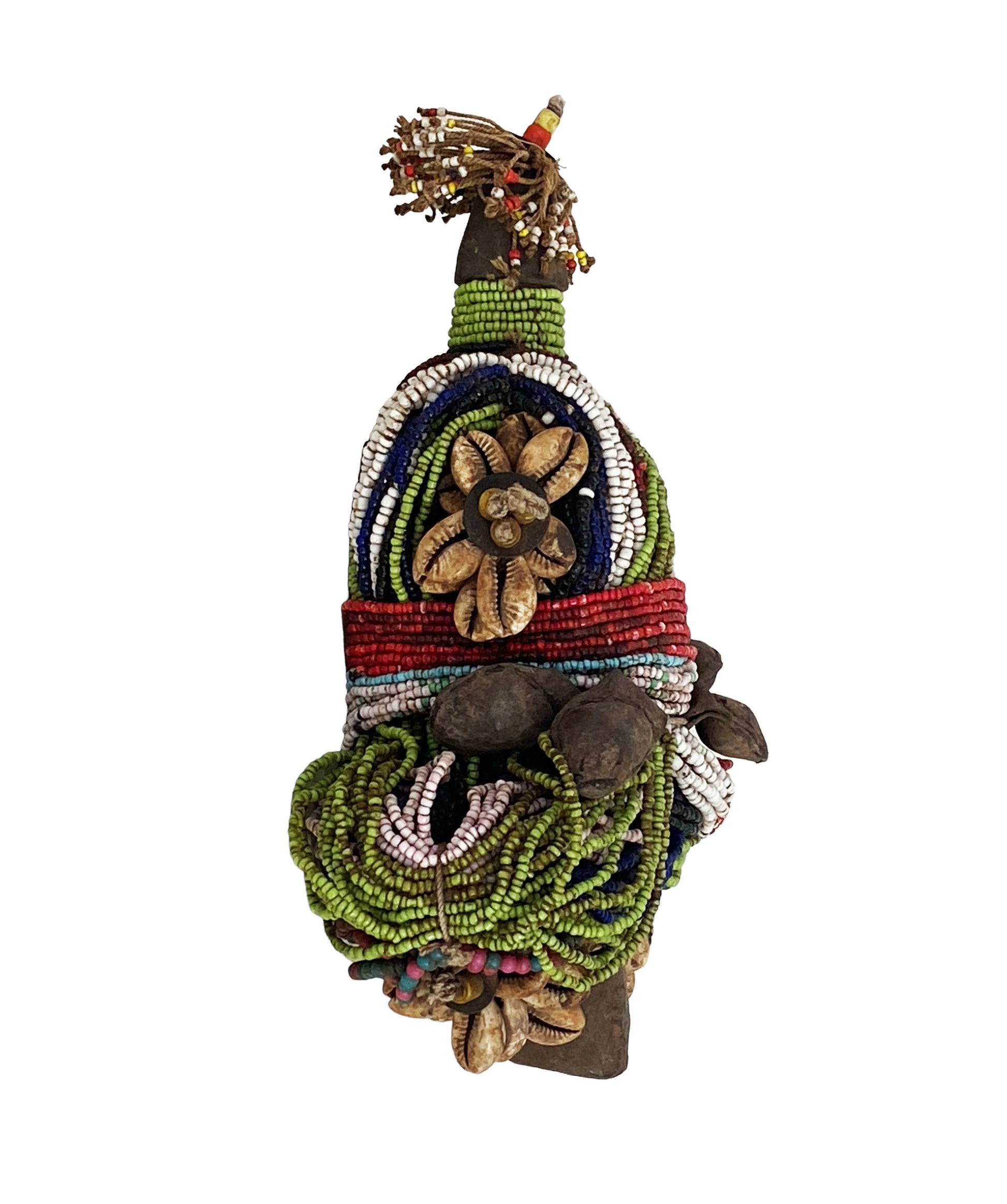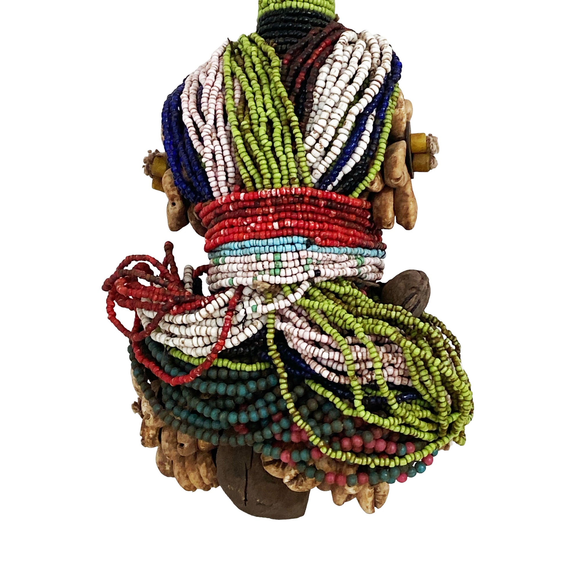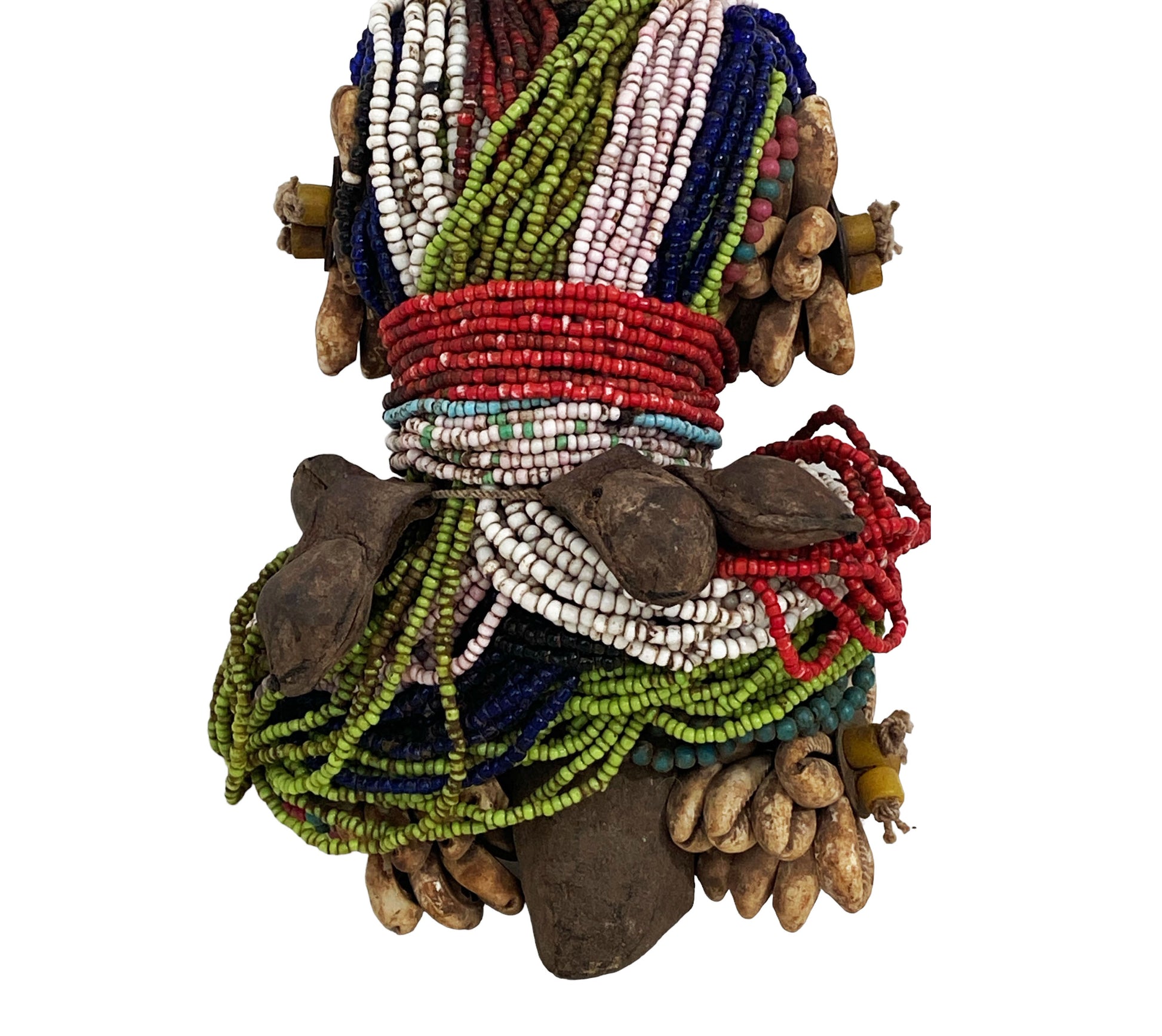 Superb African Fali fertility doll decorated with multiple layers of beads and cowrie shells, as well as leather amulets 9.25" h by 5" w by 4" d