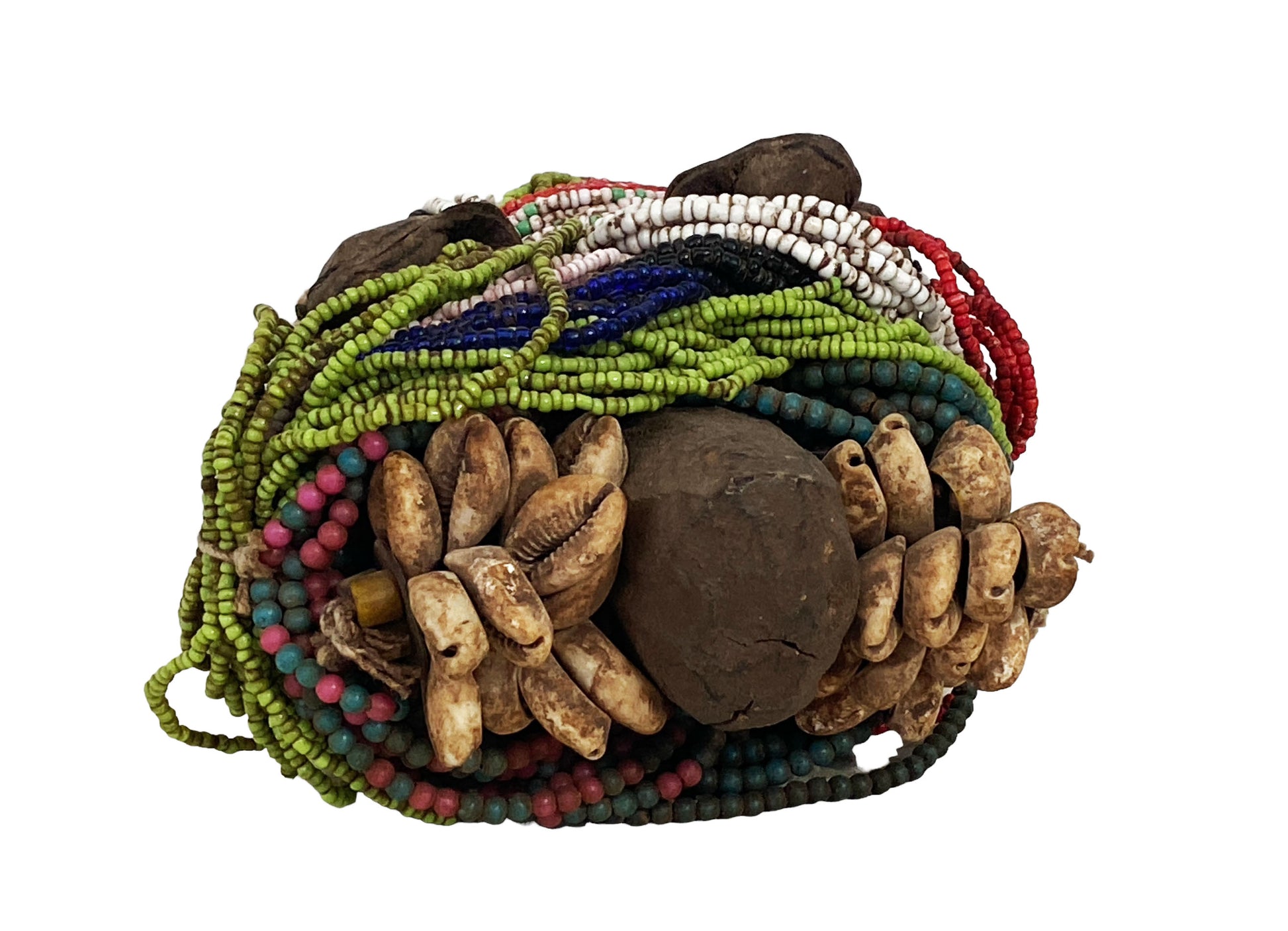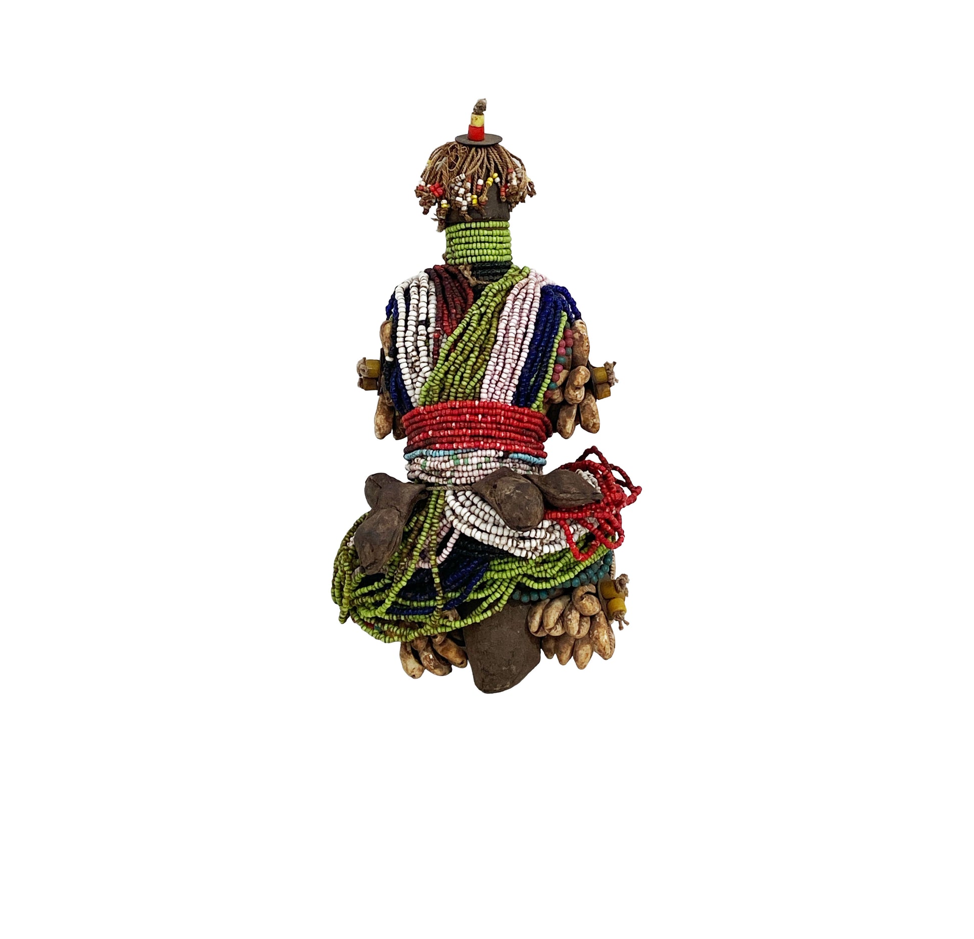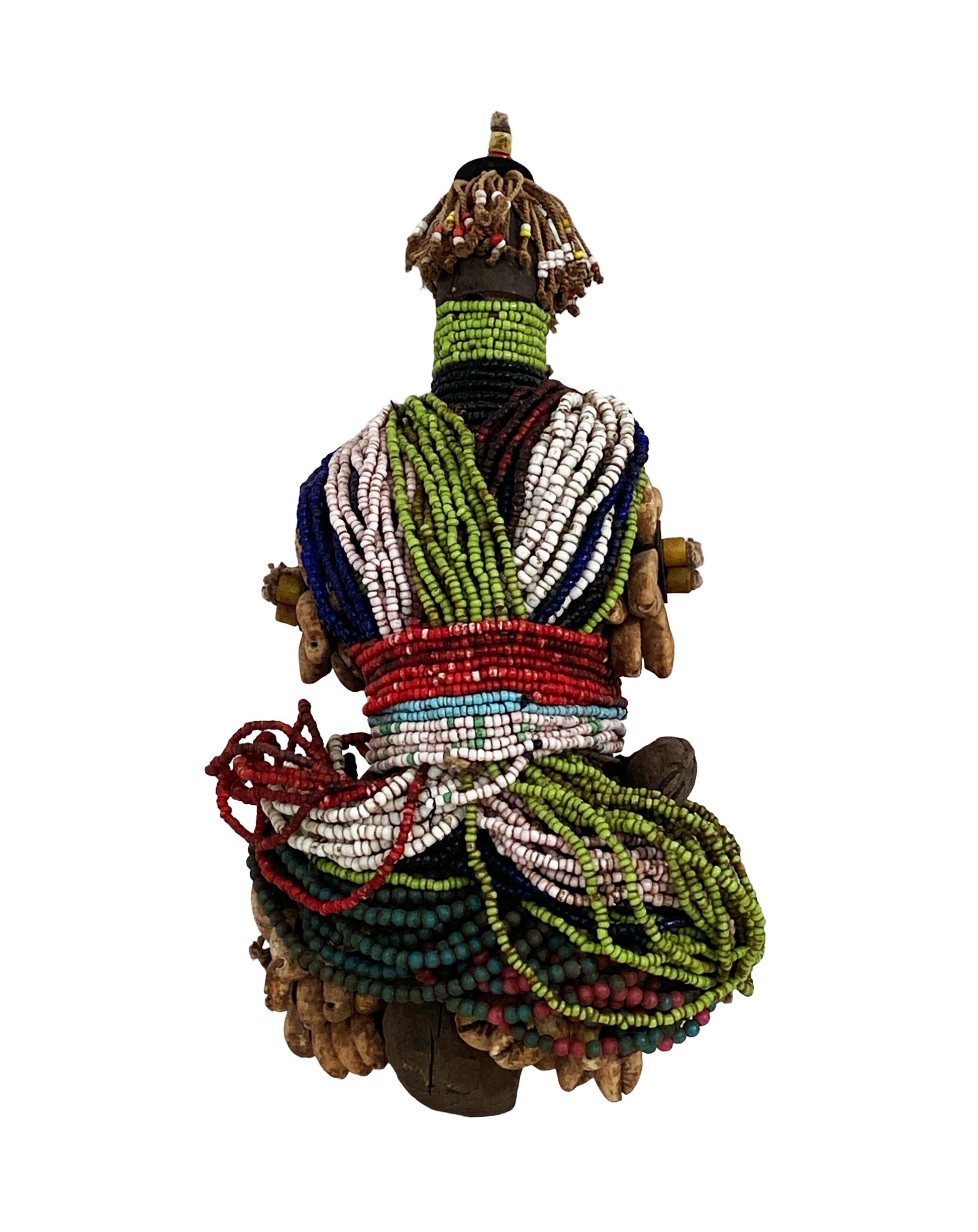 Superb African Fali fertility doll decorated with multiple layers of beads and cowrie shells, as well as leather amulets 9.25" h by 5" w by 4" d