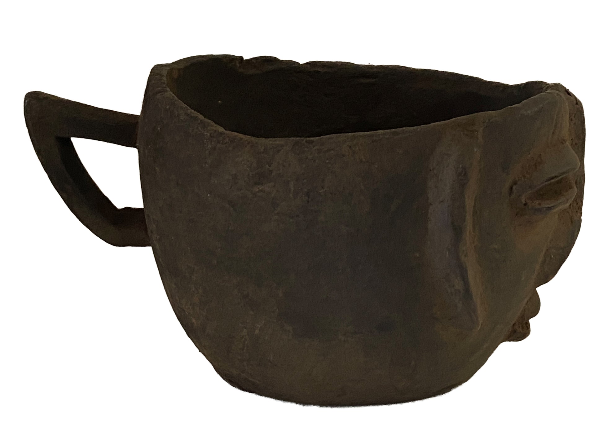 Superb and unique carved wood Kuba cup in the form of a human head. Figural cups such as this cups are among the most popular artifacts found in the Kuba , Democratic Republic of the Congo. These cups may be seen as the consecration of decorative art among the Kuba. Kuba society is devoted to the visual: The art of decoration reigns supreme. Kuba art is prized both for the quality and care of their craftsmanship and for the astounding power of their design (Bwiin) which touched sensitivity of western collectors and artists.