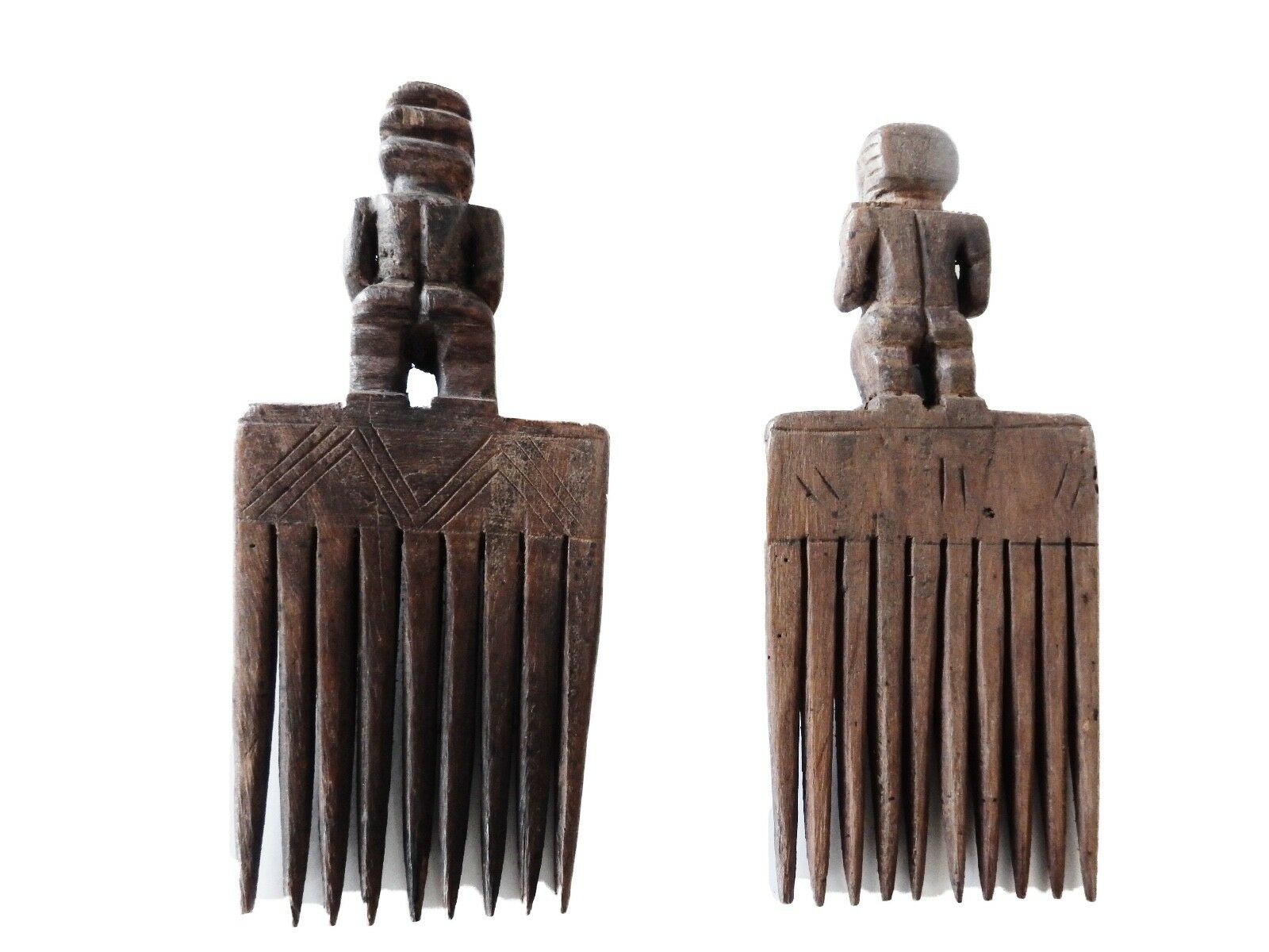 - handles decorated with geometric carvings,The Akan speaking women of Ghana include the Anyu, Baule, and Fante. All these women use wooden hair combs both for combing hair and for decoration and adornment. Combs are obtained as gifts from admirers or presented at marriage.Large bridal combs were prestigious and used to adorn the home. Depending on a woman's wealth or beauty she might own three or four very collectible minor wood losses ,old termite holes .