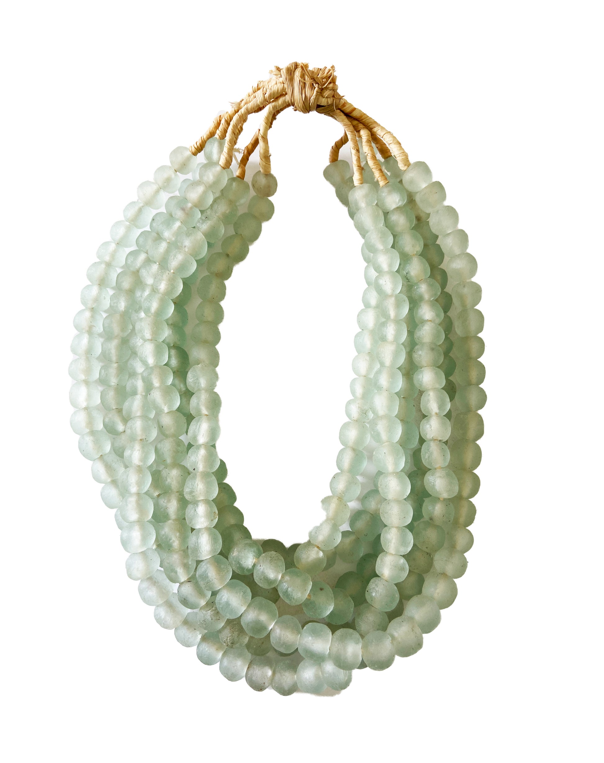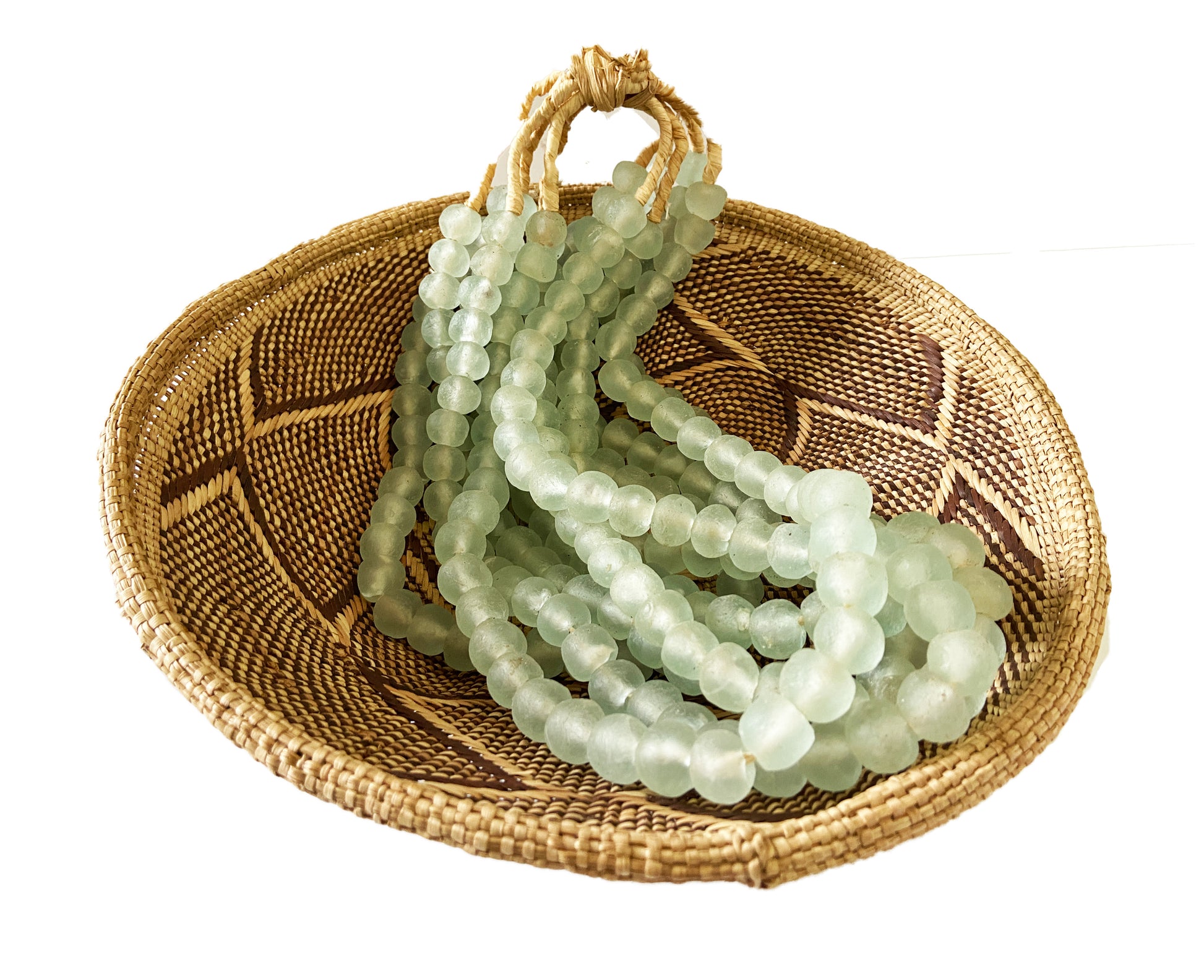 Great Six strands of Aqua glass African trade beads strung on raffia made by the Krobo People of Ghana, Africa. Powder glass beads are made by crushing glass to a fine powder and heating it so that the particles fuse together.Length of Strand: 26" Bead Size: 1/2"... For layering in decor or wearing.(the basket is not included in the sale )