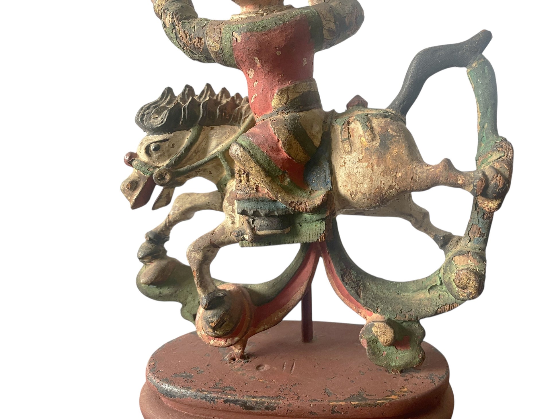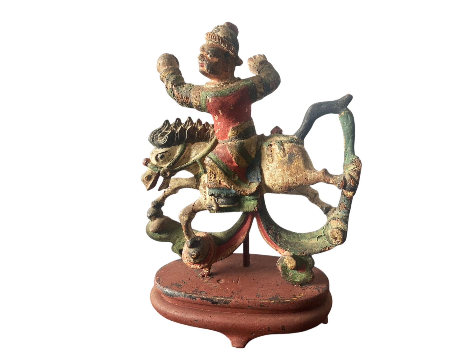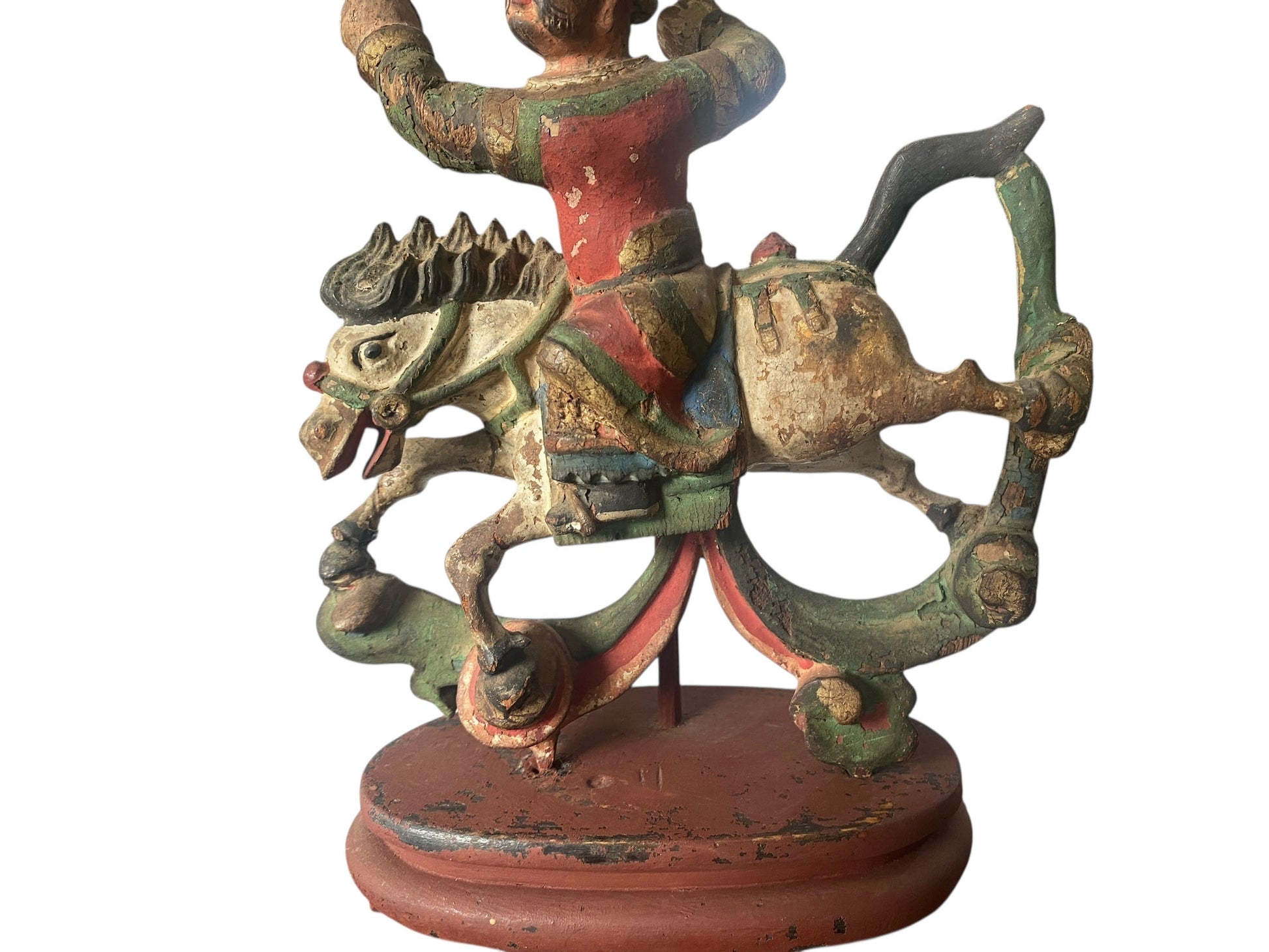Antique and rare Asian hand carved wood figure of a equestrian/man riding a horse on a stand amazing art work ,antique polychrome missing some due to time, pls check pictures for the condition overall very good 6ʺW × 2.5ʺD × 8ʺH