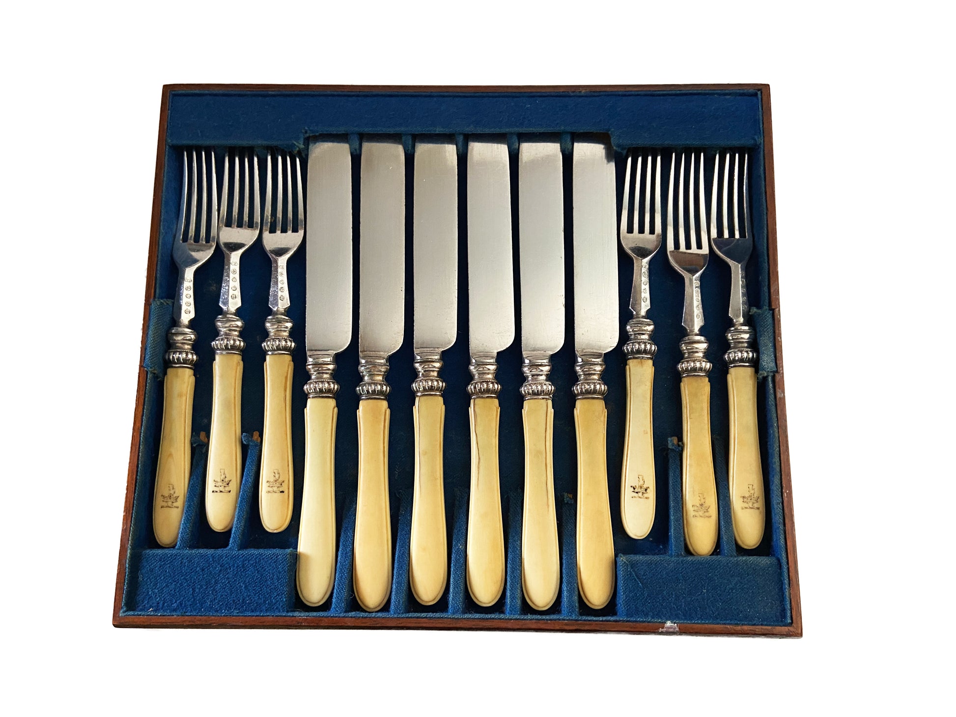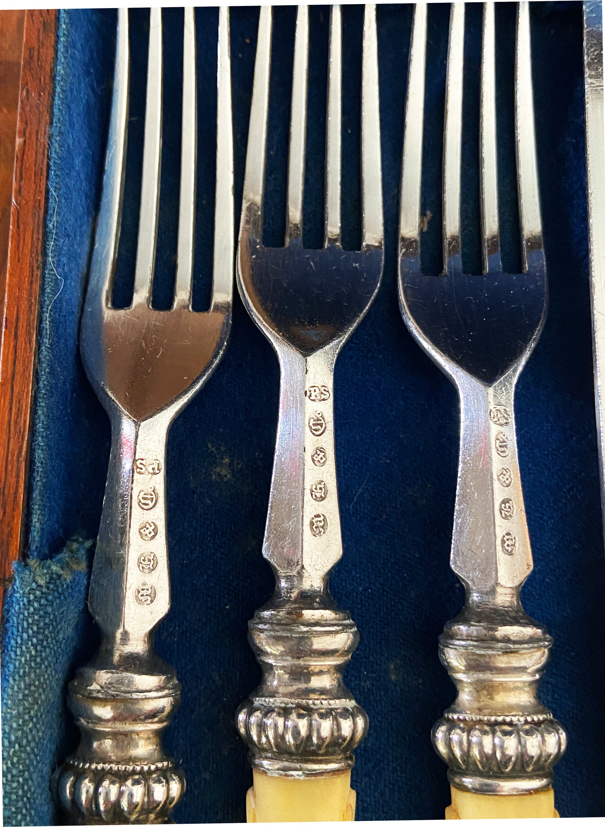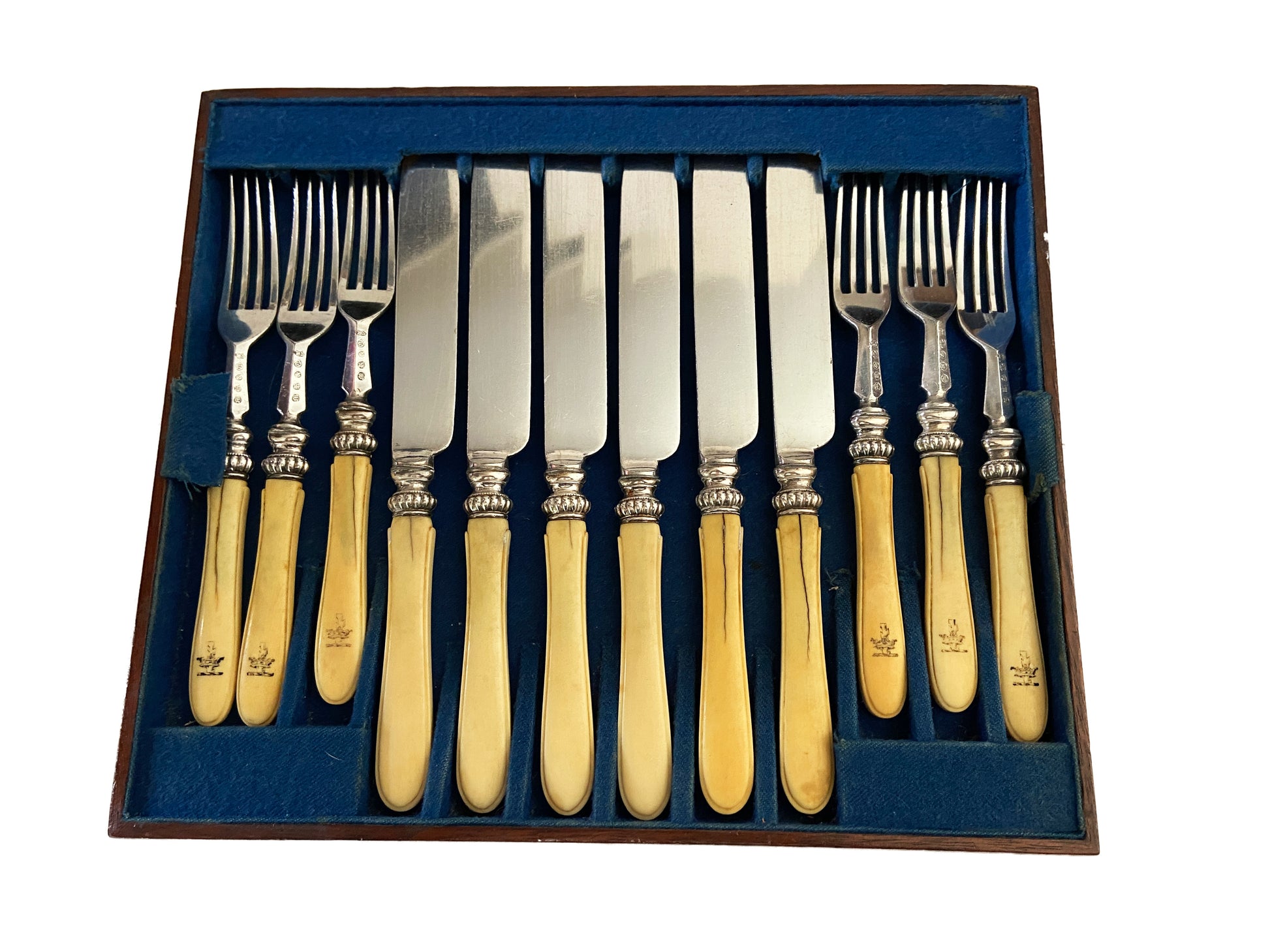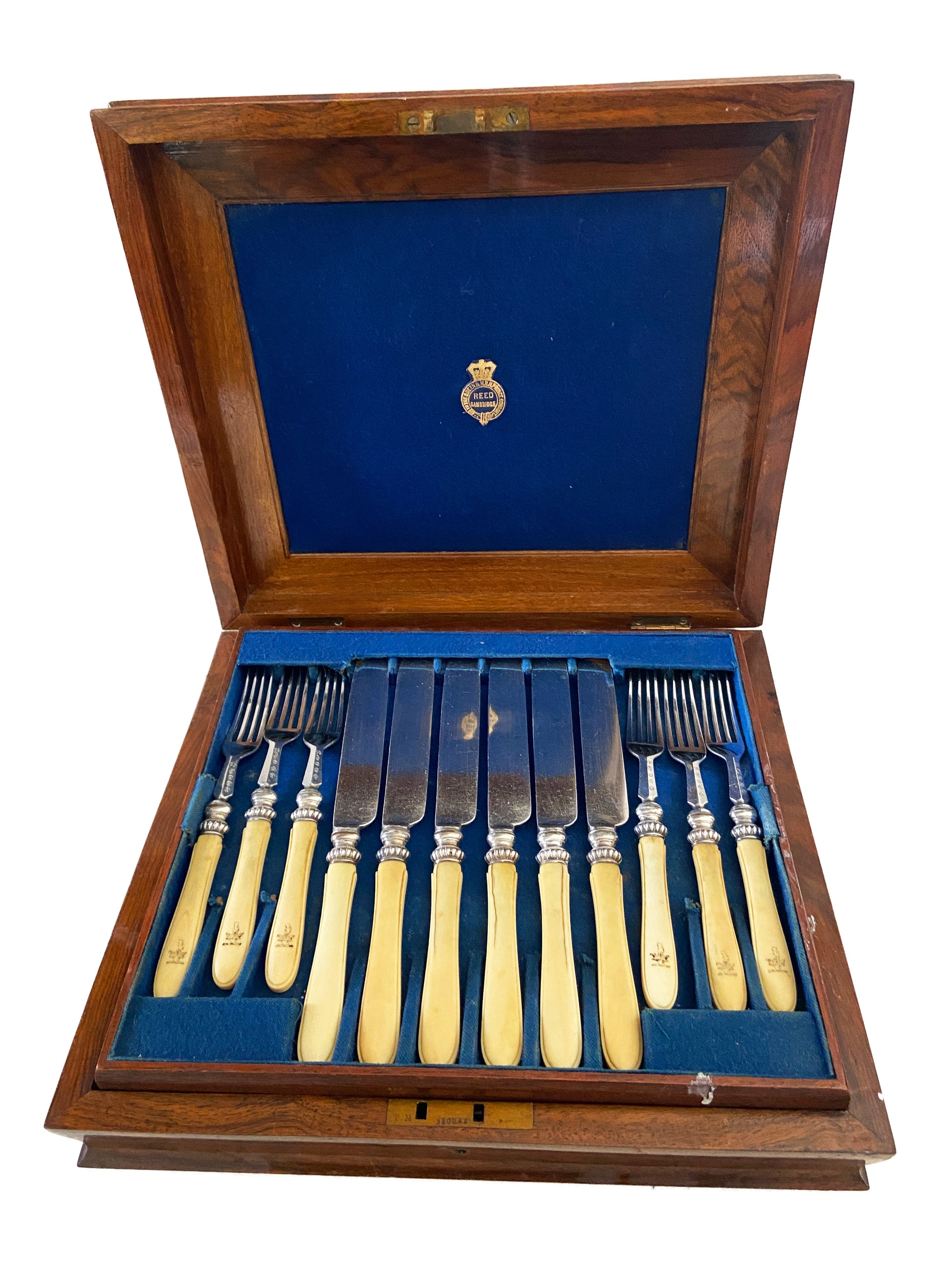 Antique Reed Cambridge ( to the Queen & H.R.H.Prince Consort) Place Setting silver and Bovine bone ,For 18 Plated and marked Dessert Knives And Forks In Box. Dimensions are : Knives Are 8.5" H by 0.75" w, Forks 7" h by 0.75" w, solid wood Box 10" d by 11.5" w by 3" H .Cracks in some pieces due to Age and use overall very good condition